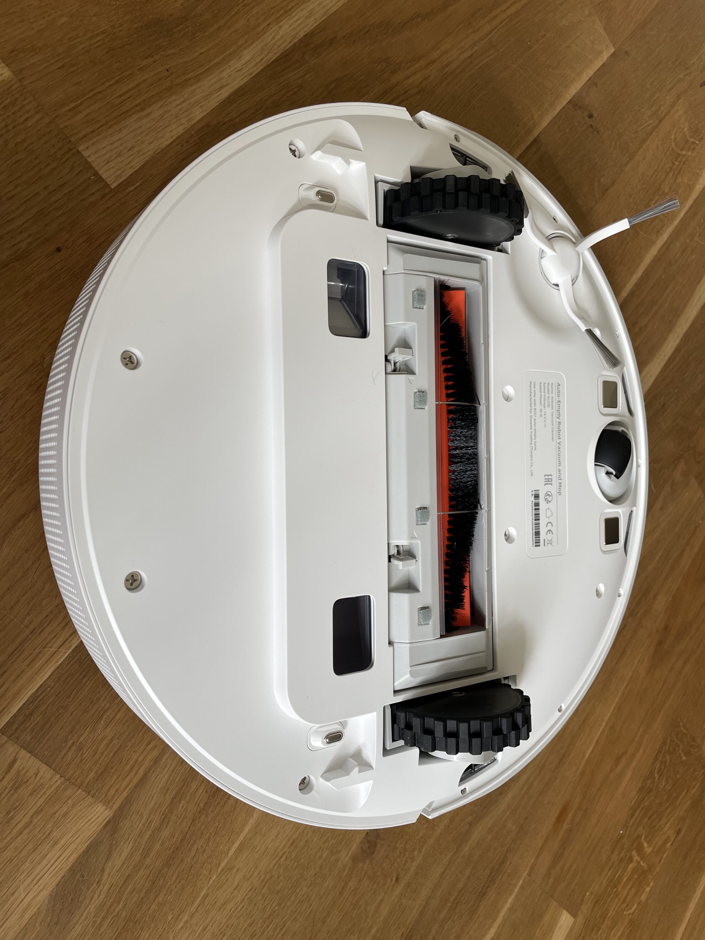 Auch die Unterseite setzt auf klassisches Design. Hier befinden nicht nur zwei gut profilierte Räder. Zwischen diesen findet man außerdem die große Hauptbürste vor, die leider nicht gänzlich auf Gummilamellen setzt. Da die klassischen Bürsten mit einzelnen Haaren erfahrungsgemäß anfällig für einen schnellen Verschleiß sind, muss man hier wohl regelmäßig eine neue kaufen. Angesichts des niedrigen Preises ist das aber durchaus fair. Für eine unkomplizierte Reinigung lässt sich einfach die Klappe über der Hauptbürste abnehmen.