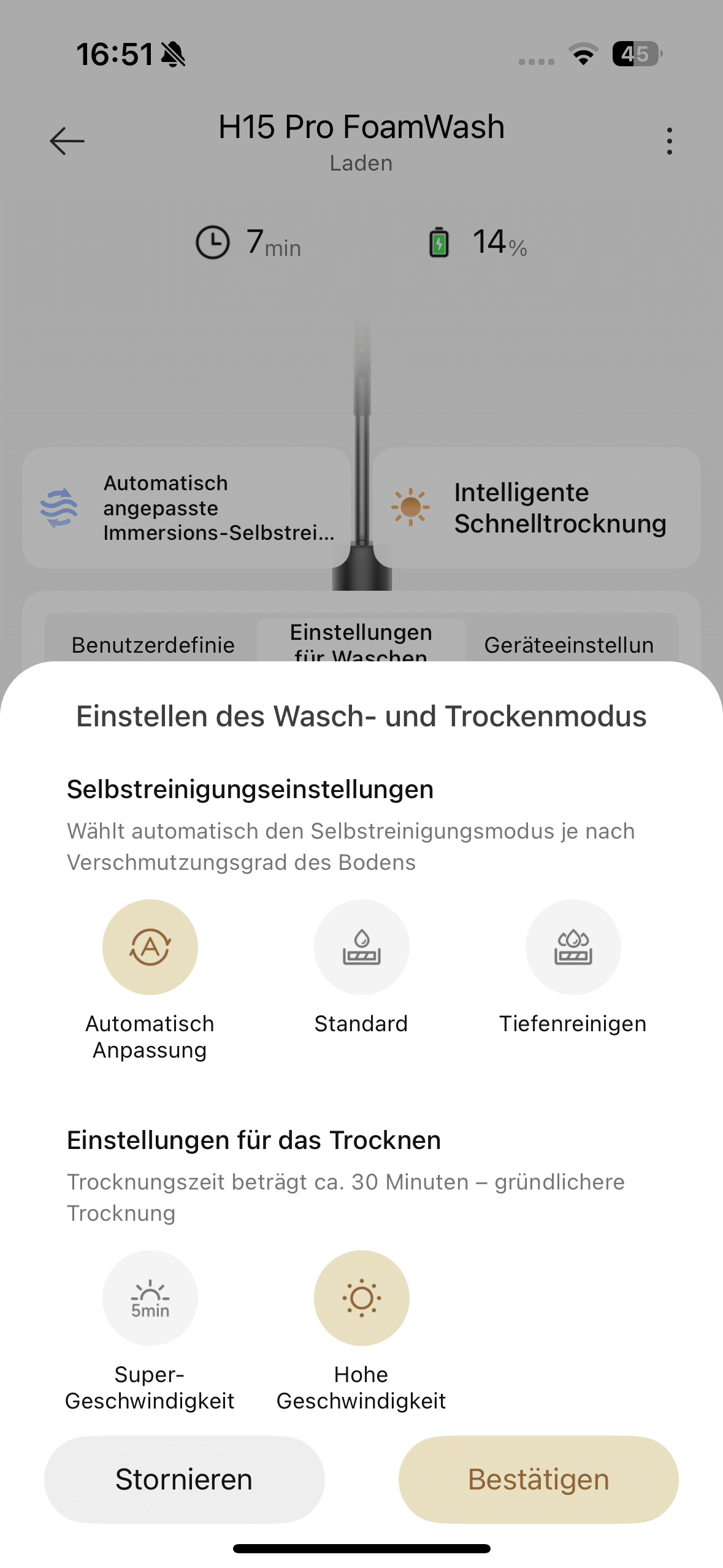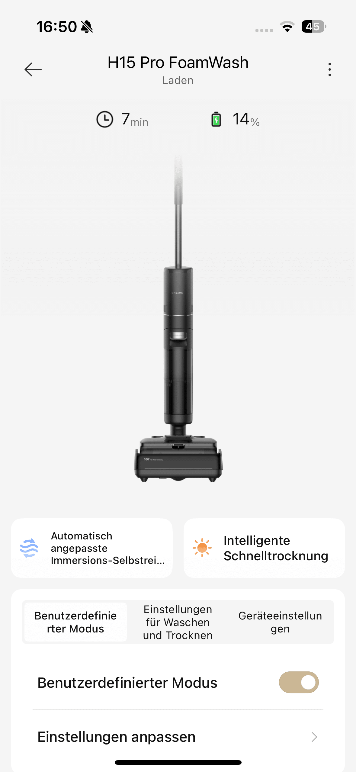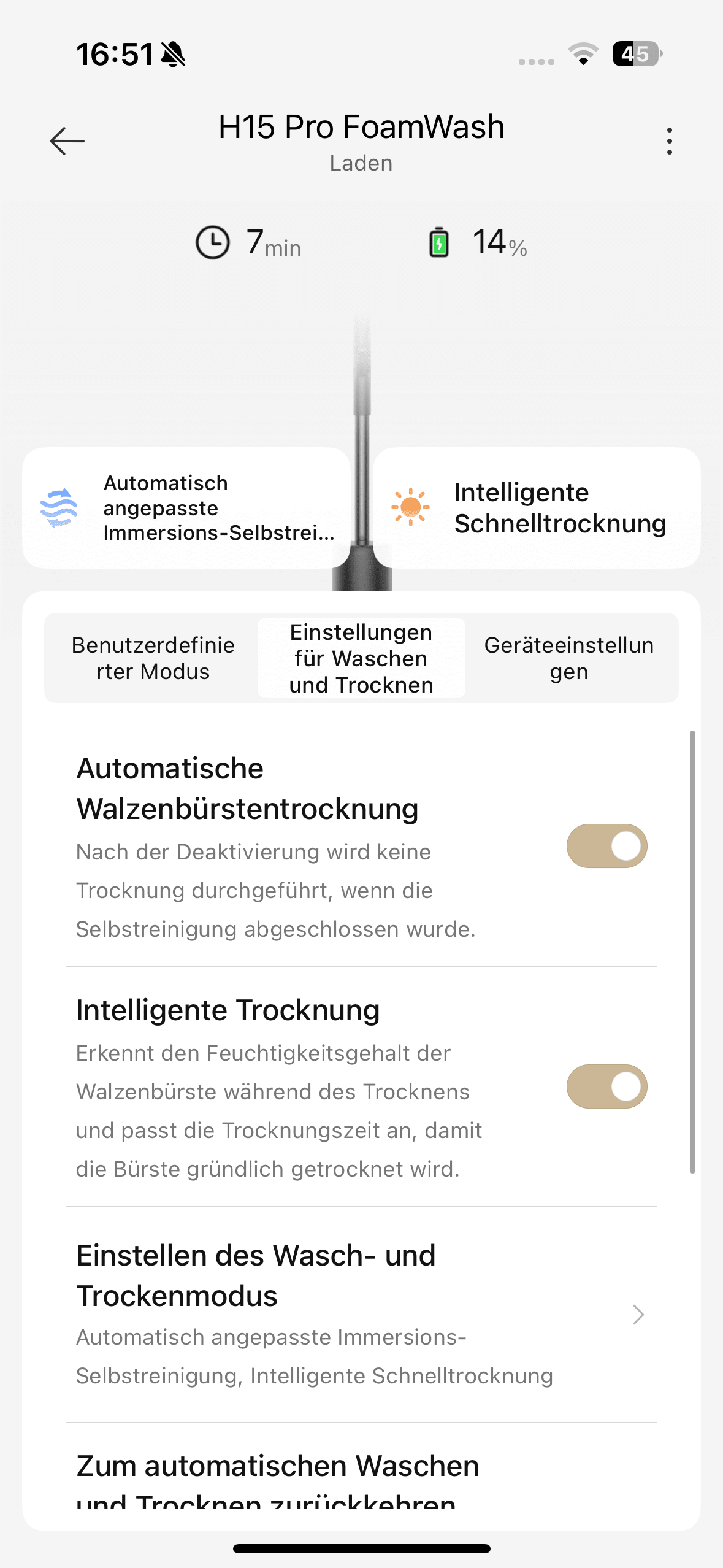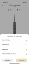 Außerdem lassen sich Einstellungen am Gerät vornehmen. So könnt ihr hier zum Beispiel Einzelheiten zur Selbstreinigungsfunktion anpassen. Das betrifft unter anderem die Temperatur bzw. Dauer der Heißlufttrocknung. Auch könnt ihr hier einen benutzerdefinierten Modus euren Wünschen entsprechend anpassen. Dabei bestimmt ihr Saugleistung und Wasserdurchflussrate.
