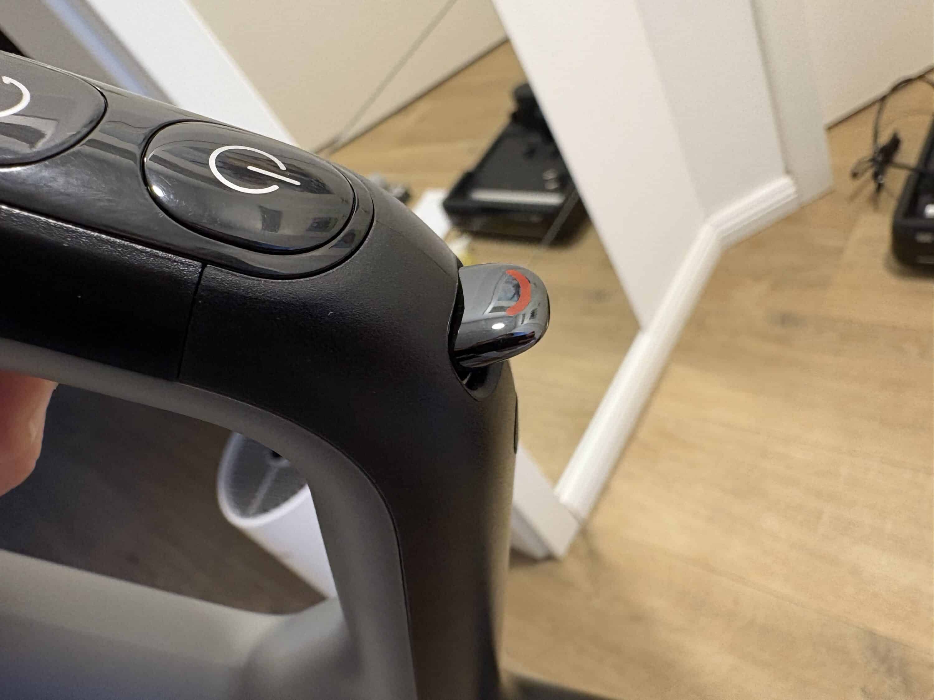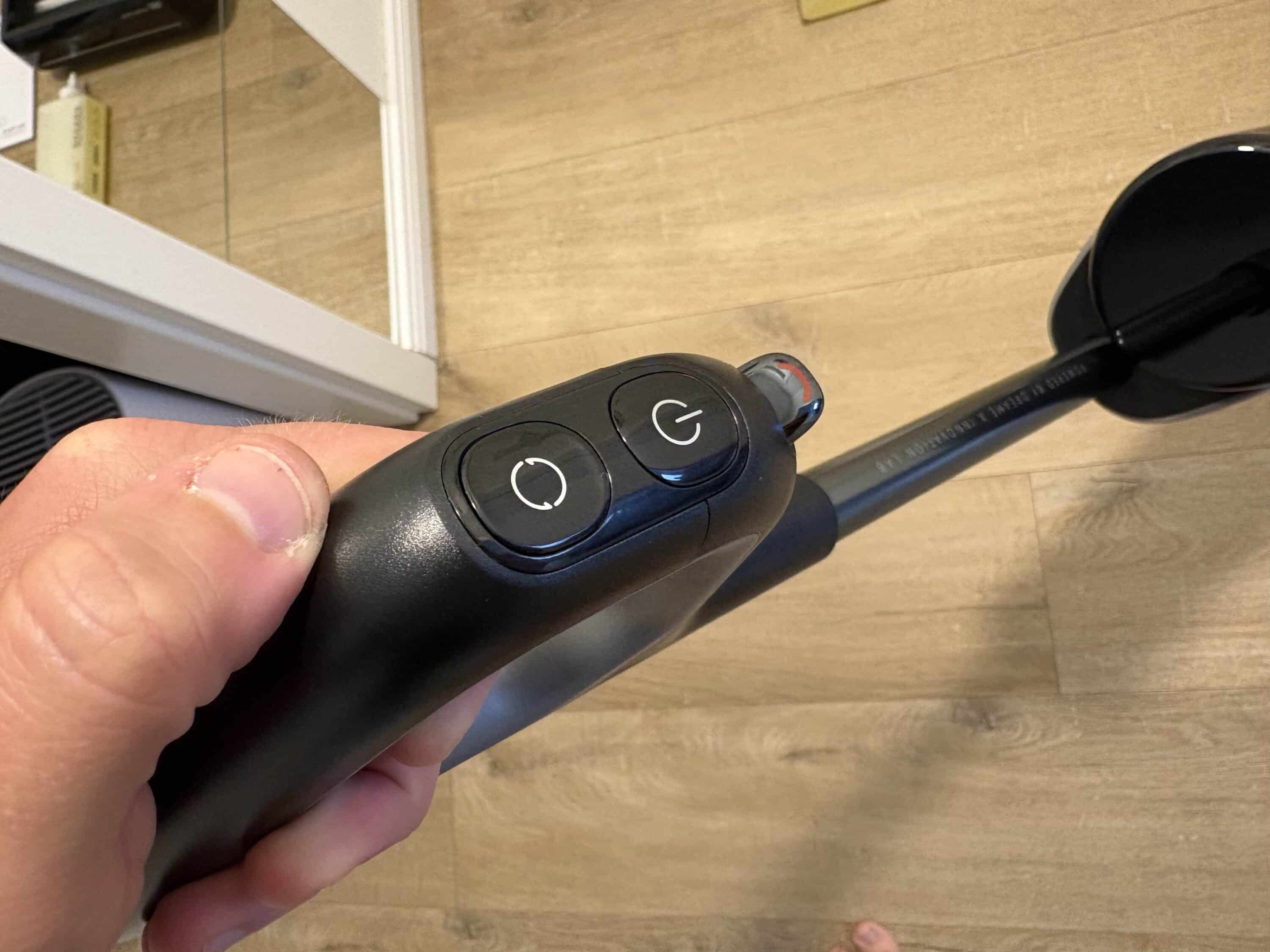 Hier befinden sich die Bedienelemente, welche ihr während der Reinigung gut mit eurem Daumen erreichen könnt. Das Handstück mündet in der Motoreinheit des Wischsaugers. Hier befindet sich aber nicht nur besagter Motor, sondern auch der Schmutzwassertank. Im oberen Bereich platziert Dreame wiederum ein Display, das die wichtigsten Parameter anzeigt.