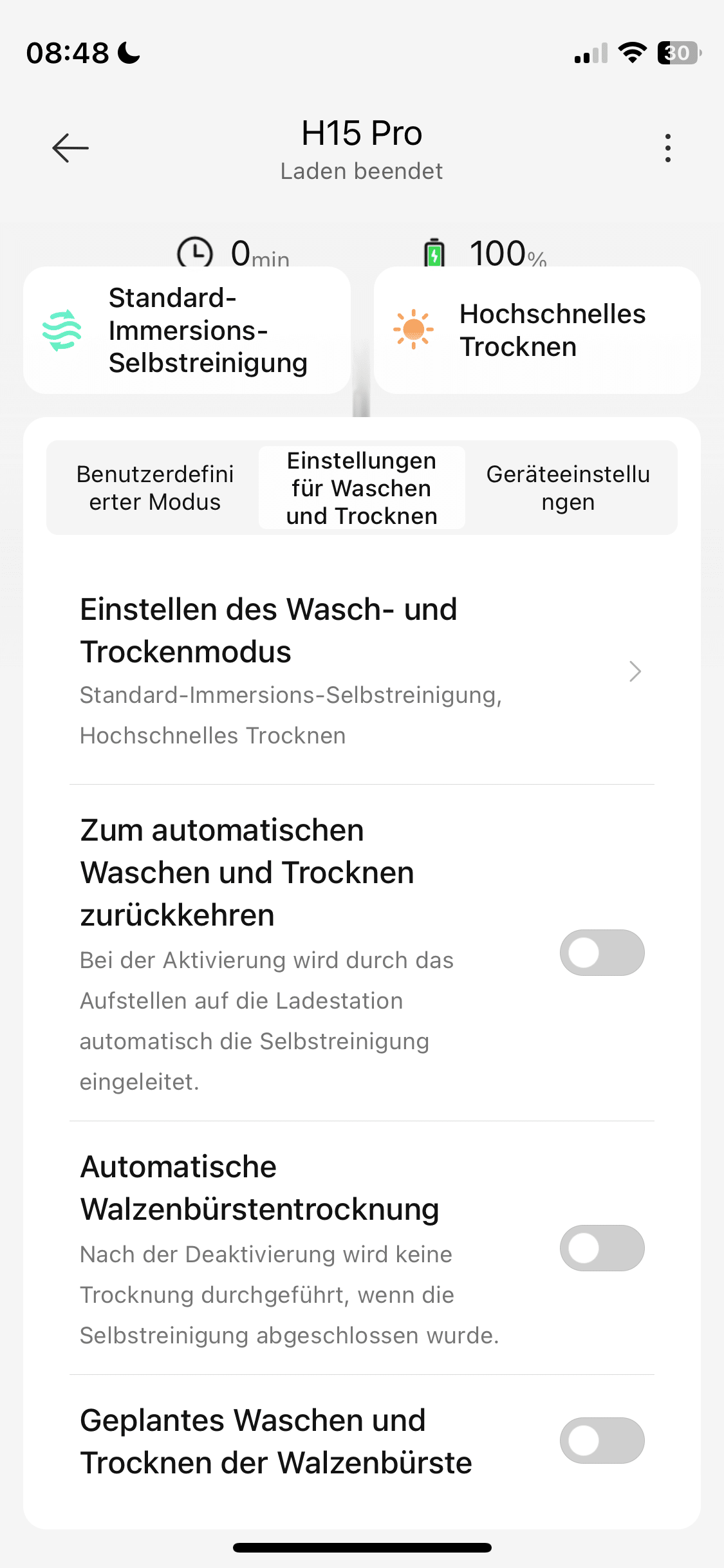 Im Anschluss daran startet die Trocknung der Walze. Dreame bietet dabei eine Schnelltrocknung, welche die Walze binnen 5 Minuten mit 90°C heißer Luft trocknet. Alternativ könnt ihr auch die standardmäßige 30 Minuten andauernde Heißlufttrocknung mit etwas niedrigerer Temperatur wählen. Wer eine super saubere und extra trockene Walze erhalten möchte, sollte das 30-Minuten-Programm wählen.