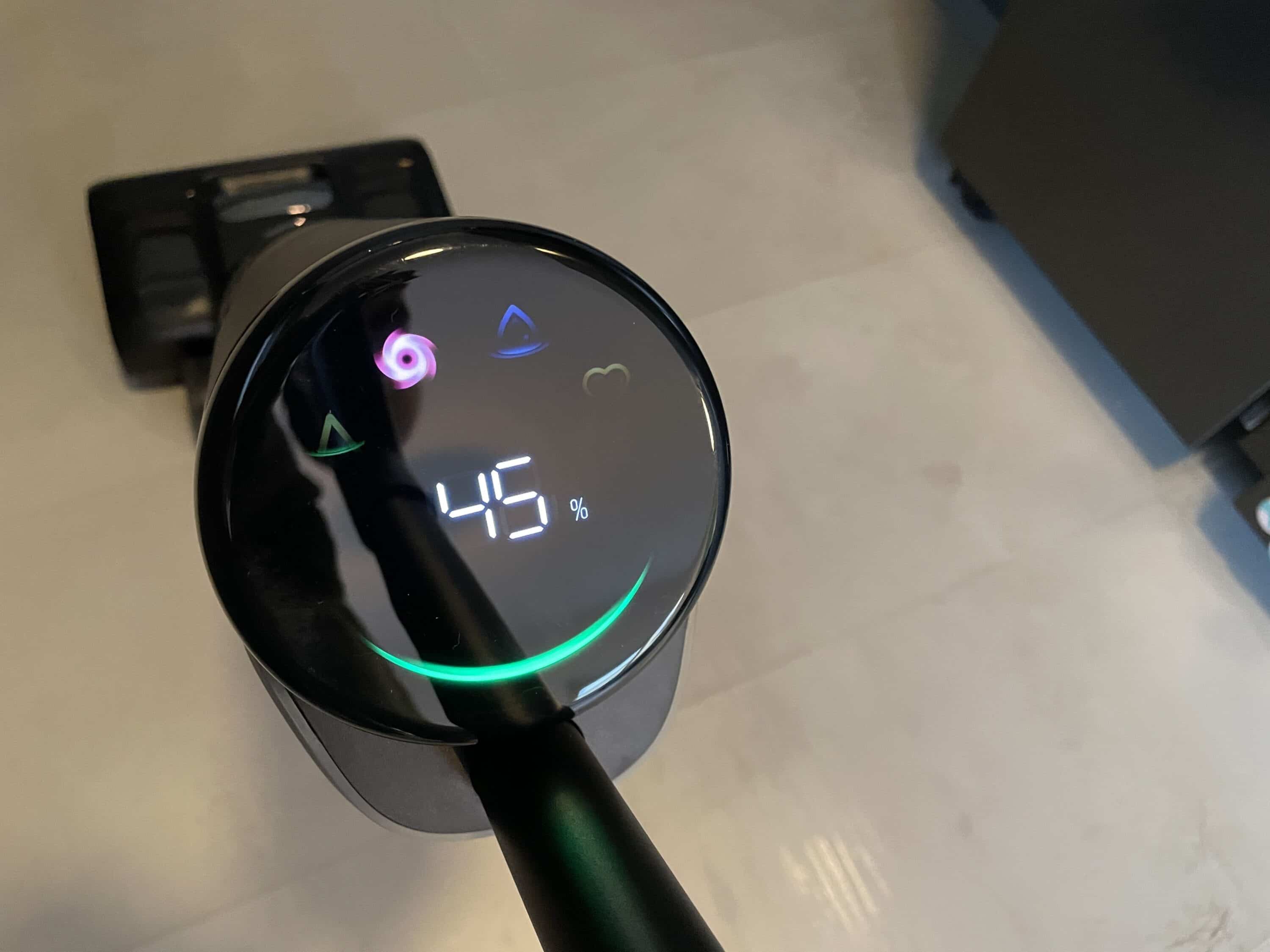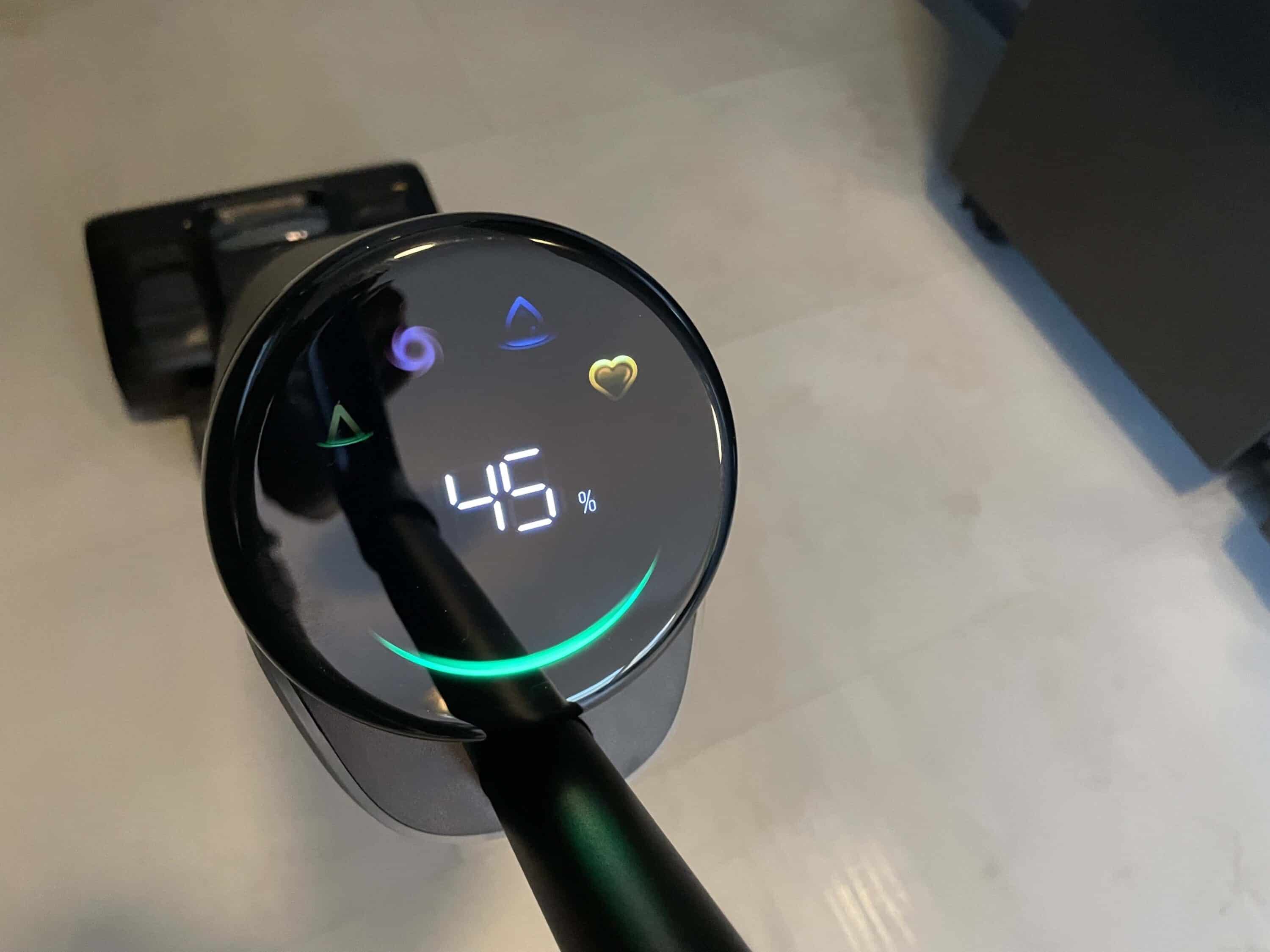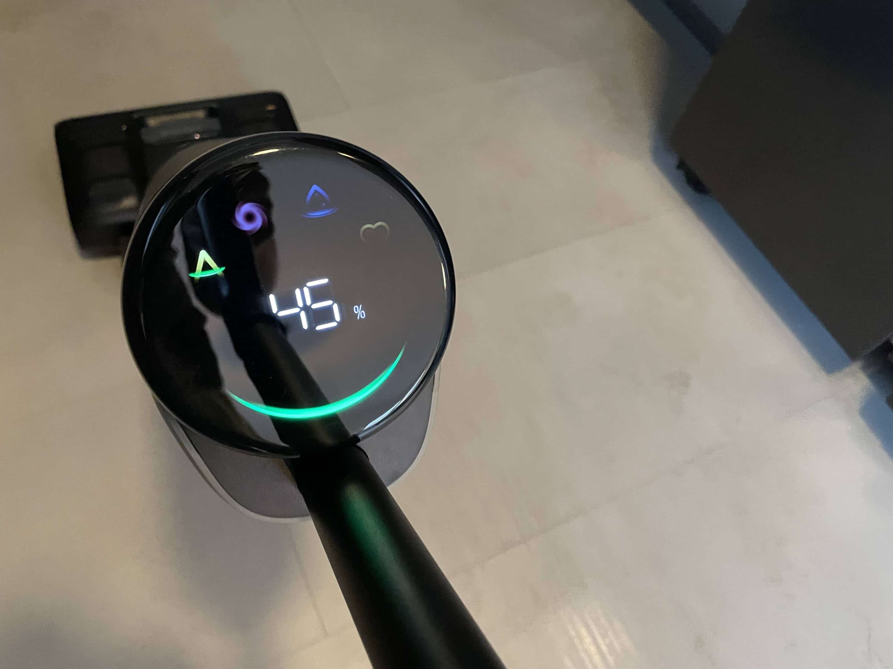 Im Fokus steht dabei die Akkulaufzeit. Der Akkustand wird euch in Form von Zahlen angezeigt. Doch auch den gegenwärtigen Reinigungsmodus und die Ergebnisse des Schmutzsensors lassen sich hier anhand der Symbole bzw. des Farbbalkens ablesen. Richtig cool: Befindet sich der Saugwischer im Selbstreinigungsmodus, kann man den Vorgang auf dem Display nachvollziehen. Vergleichen lässt sich das Display am ehesten mit dem eines Dreame H12 Pro Ultra (Test | € 349,00 *).