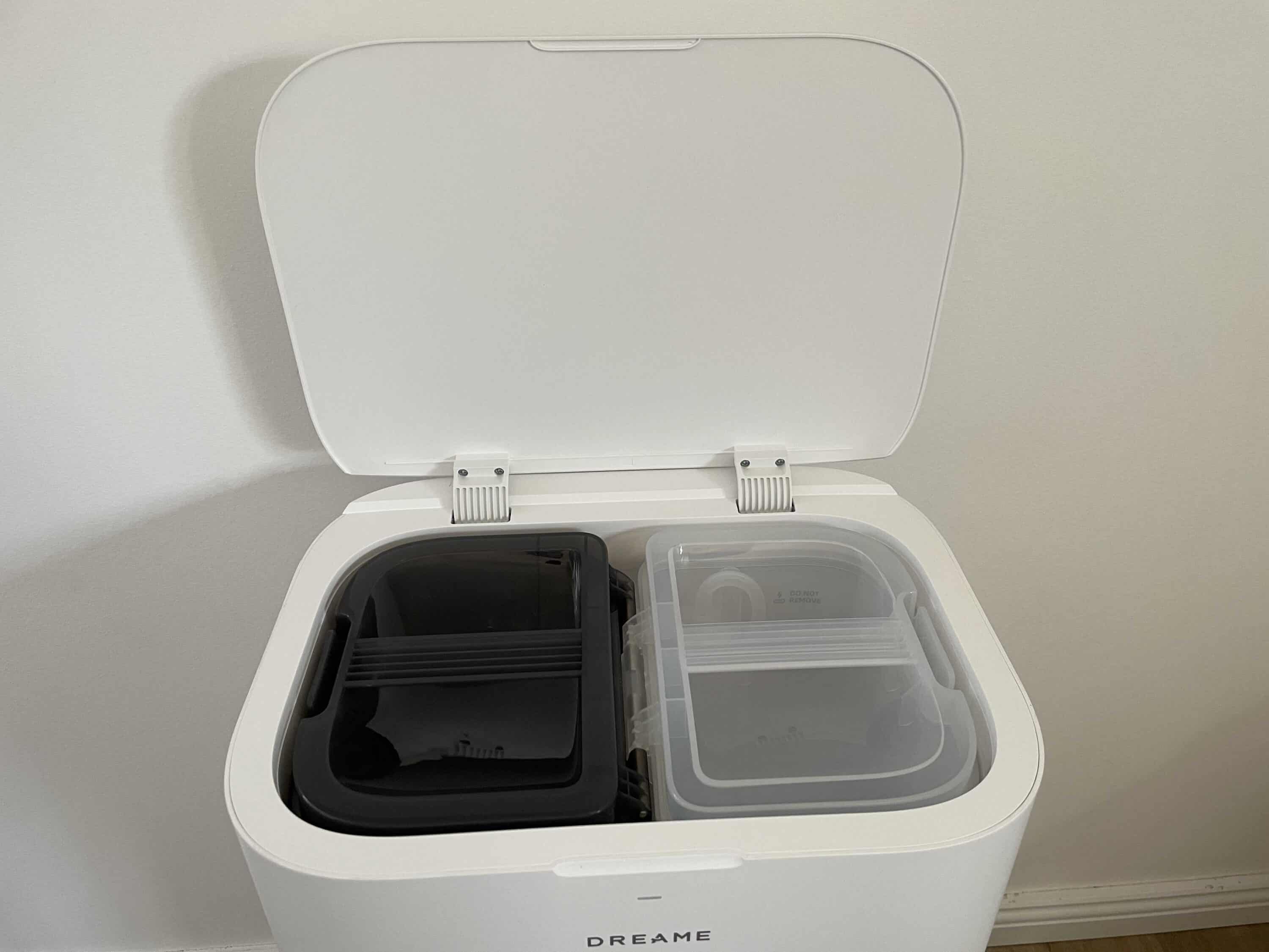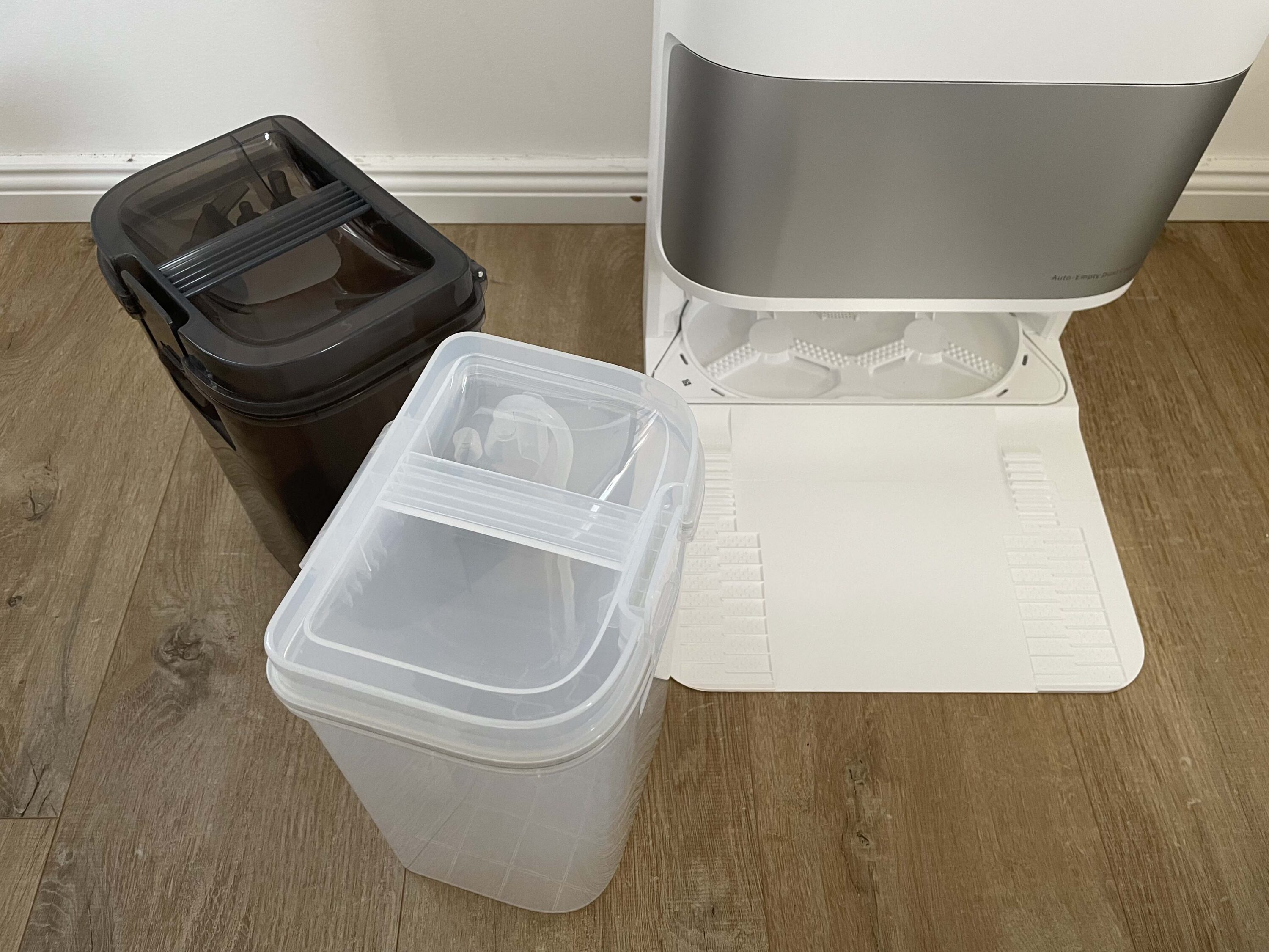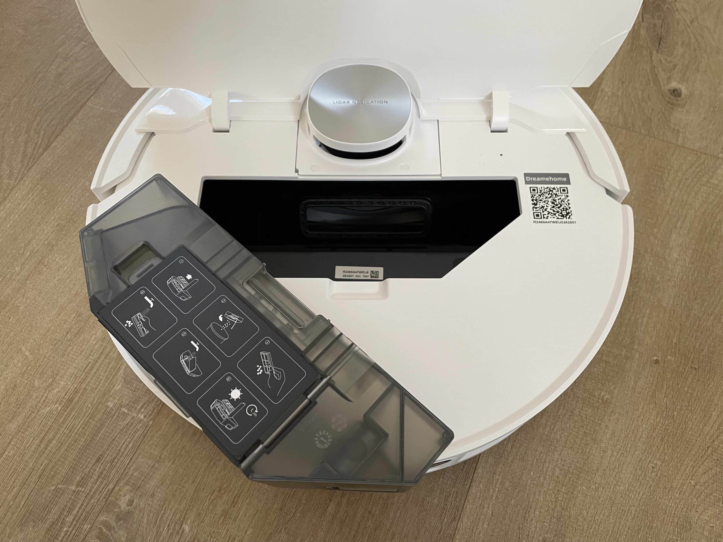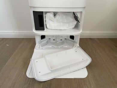 Auch, wenn es keine Heißwasserwäsche gibt, gibt es wenigstens eine Heißlufttrocknung. Im Anschluss an die Moppwäsche startet die Station über die integrierte Lüftung nämlich eine Trocknung mit Heißluft. Das beugt der Bildung von Bakterien und damit auch üblen Gerüchen vor. Hinter der silbernen Abdeckung sitzt nicht nur der Behälter für das Reinigungsmittel. Obendrein platziert man hier den Staubbeutel. Hier landet der Schmutz, den die Station im Anschluss an jede Reinigungstour vom Robo absaugt.