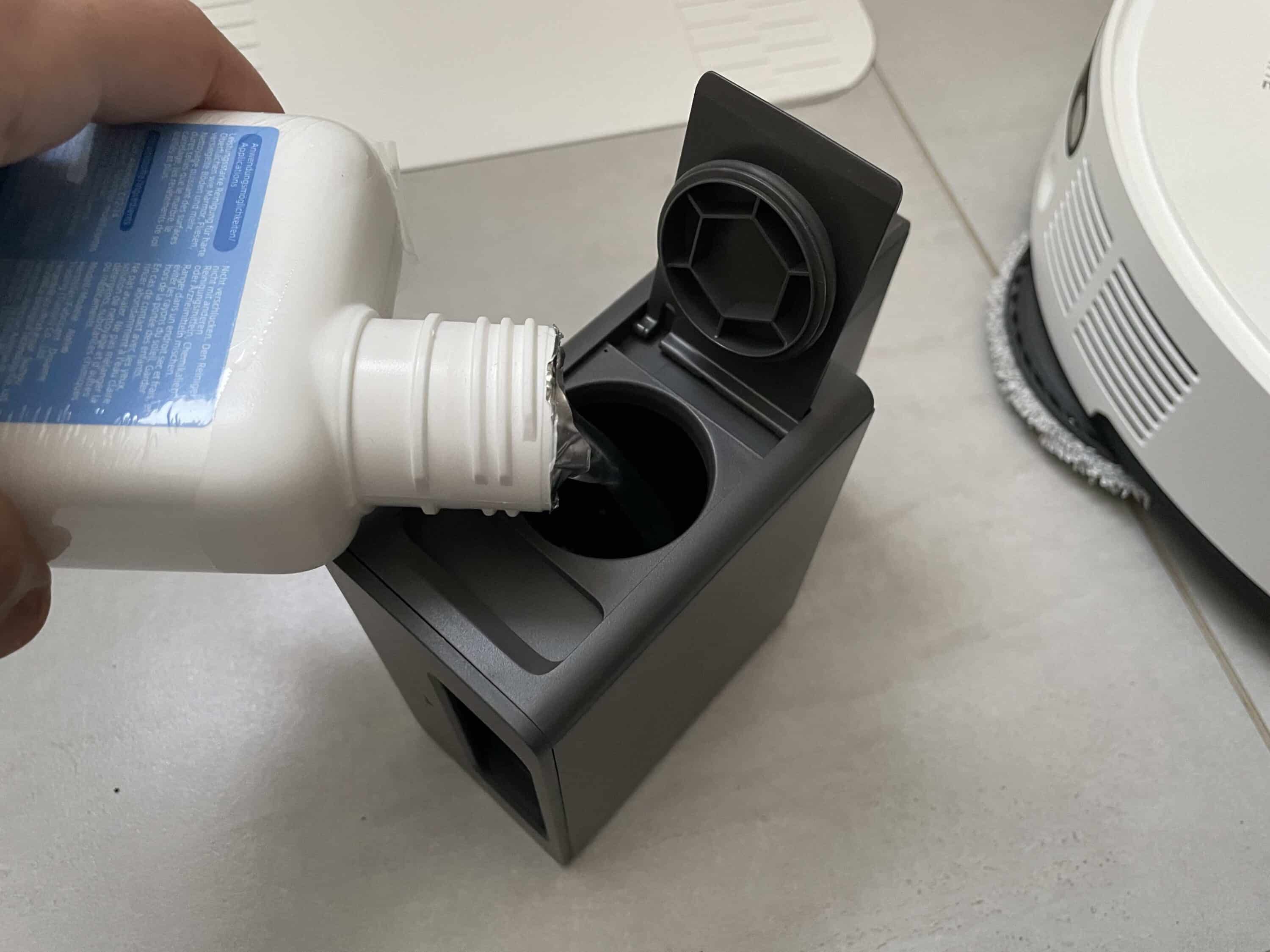 Wer darauf nicht verzichten möchte, muss also nach wie vor zum Dreame L10s Pro Ultra Heat (Test, € 662,33 *) greifen. Um den Verzicht auf Heißwasser zumindest ein wenig auszugleichen, setzt Dreame auf separates Reinigungsmittel. Unter der silberfarbenen Abdeckung an der Front der AiO-Station befindet sich der entsprechende Tank. Bei jeder Wäsche fügt die Station dem Wasser automatisch ein wenig des wohlriechenden Reinigungsmittels bei.