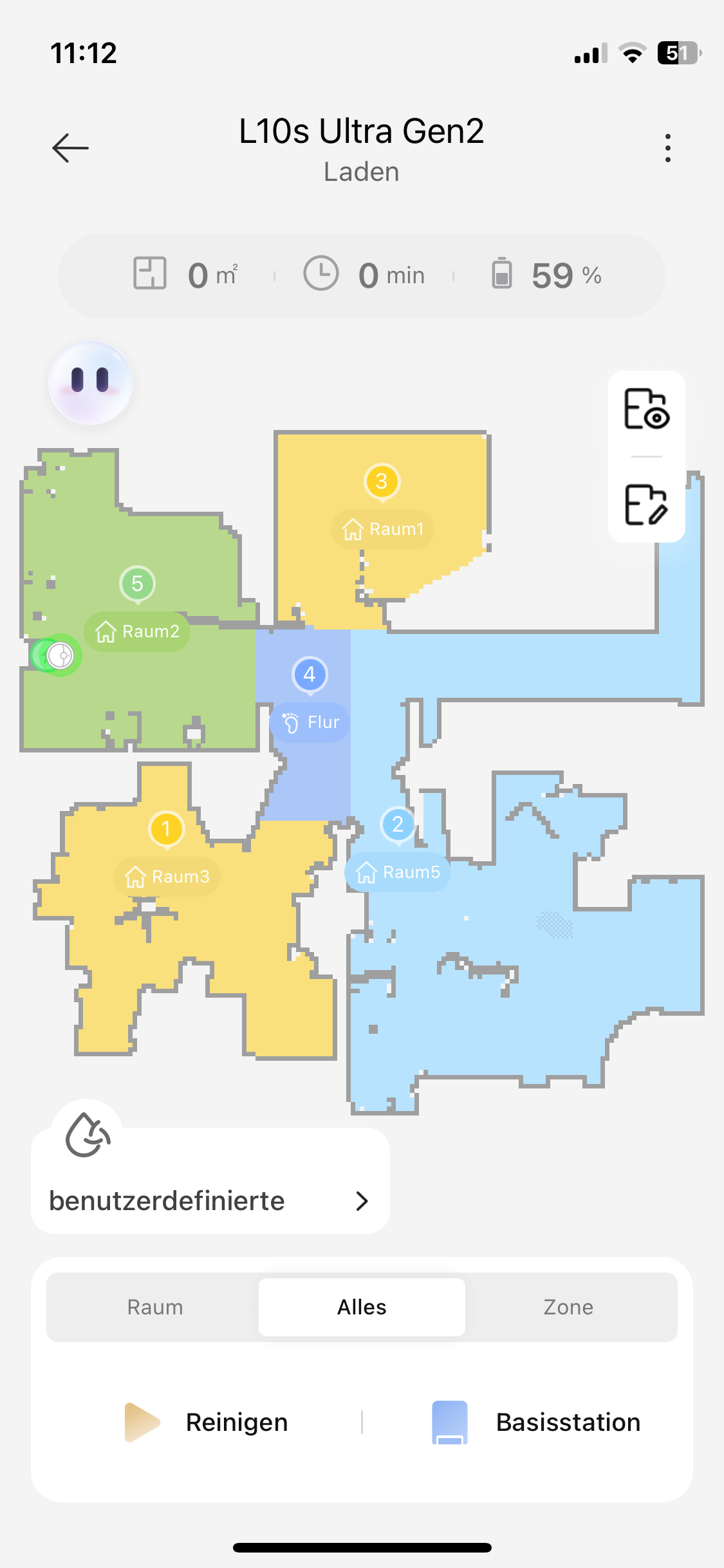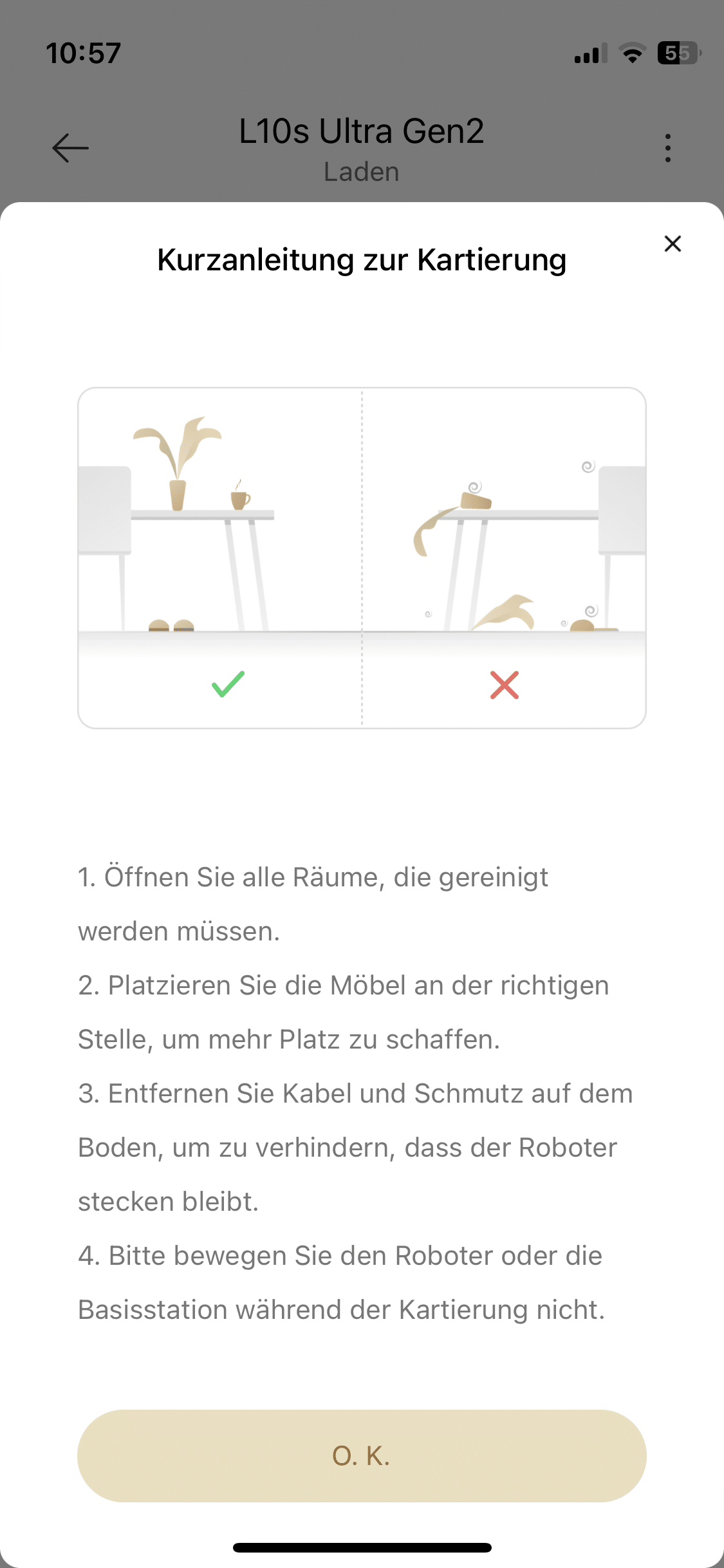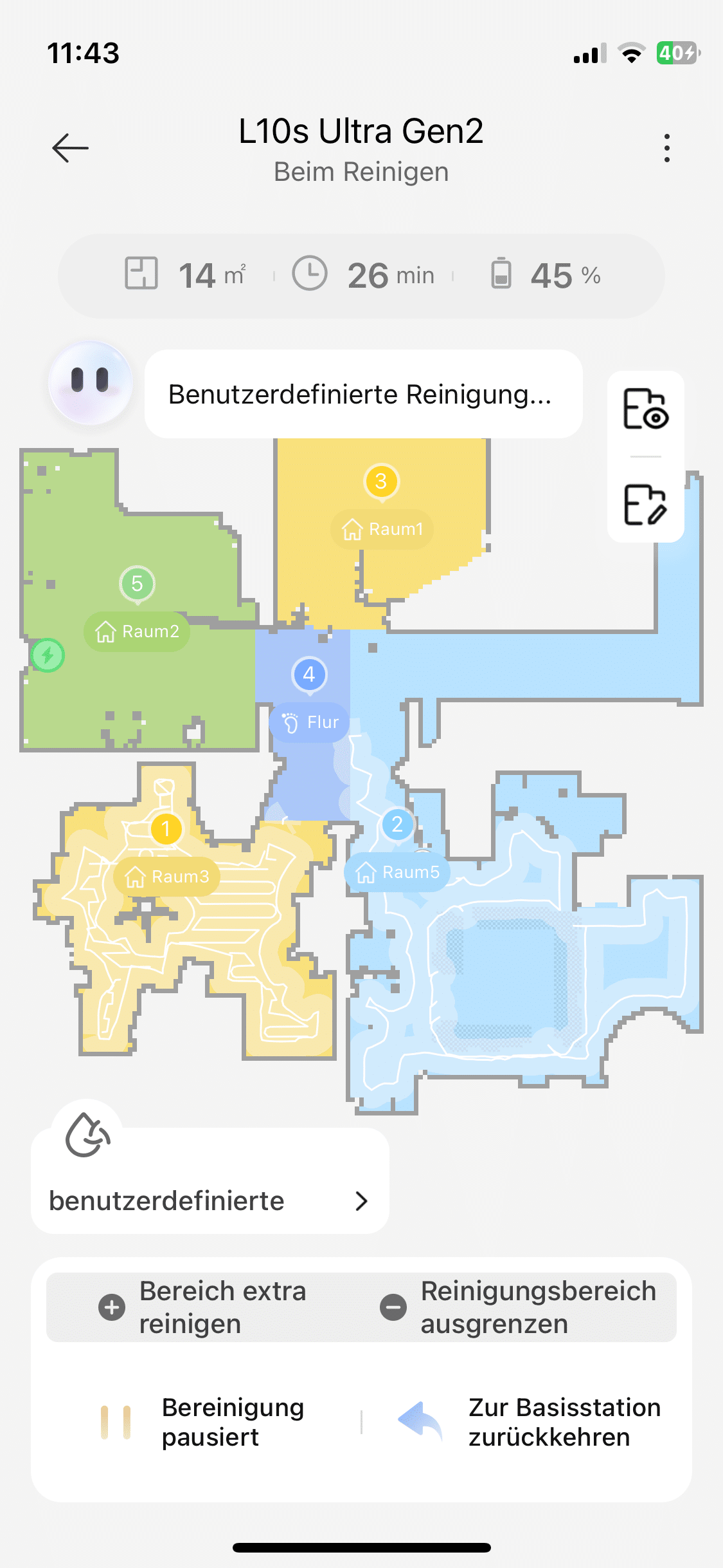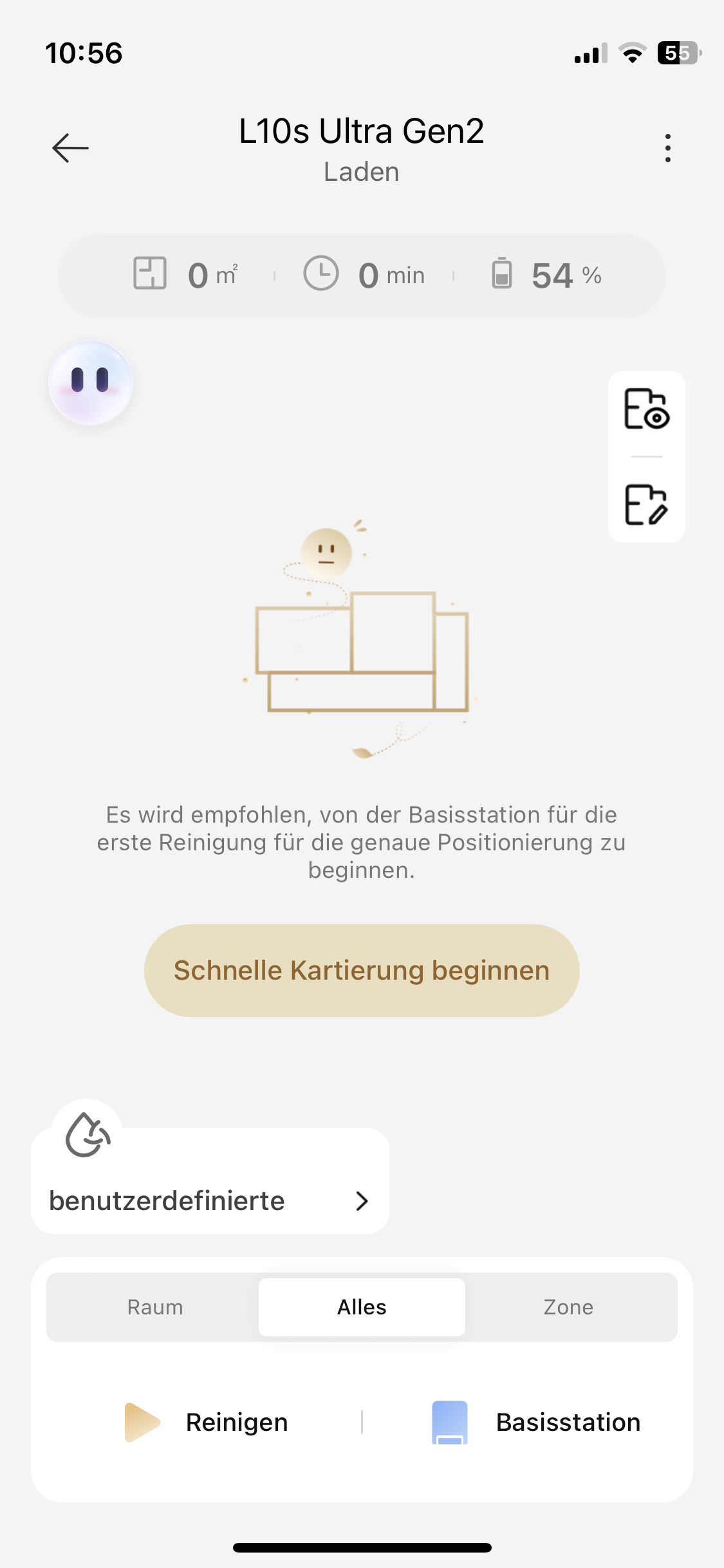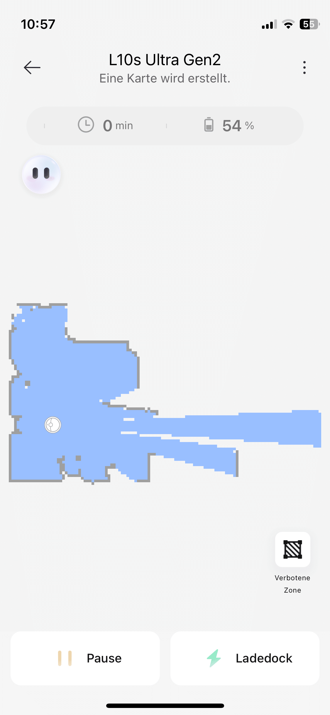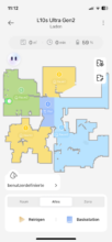 Bei seiner Jungfernfahrt erstellt er zunächst eine Karte der Umgebung und unterteilt den Bereich sogar in einzelne Räume. Im Anschluss daran kann man das Ergebnis in der App einsehen und bei Bedarf bearbeiten. Ist die Karte fertig erstellt, fährt der L10s Ultra Gen 2 die Räume mit dem gängigen System anderer Saugroboter mit LiDAR ab. Zunächst reinigt er den Raumrand. Im Anschluss wird der Innenraum in parallelen Bahnen abgefahren.