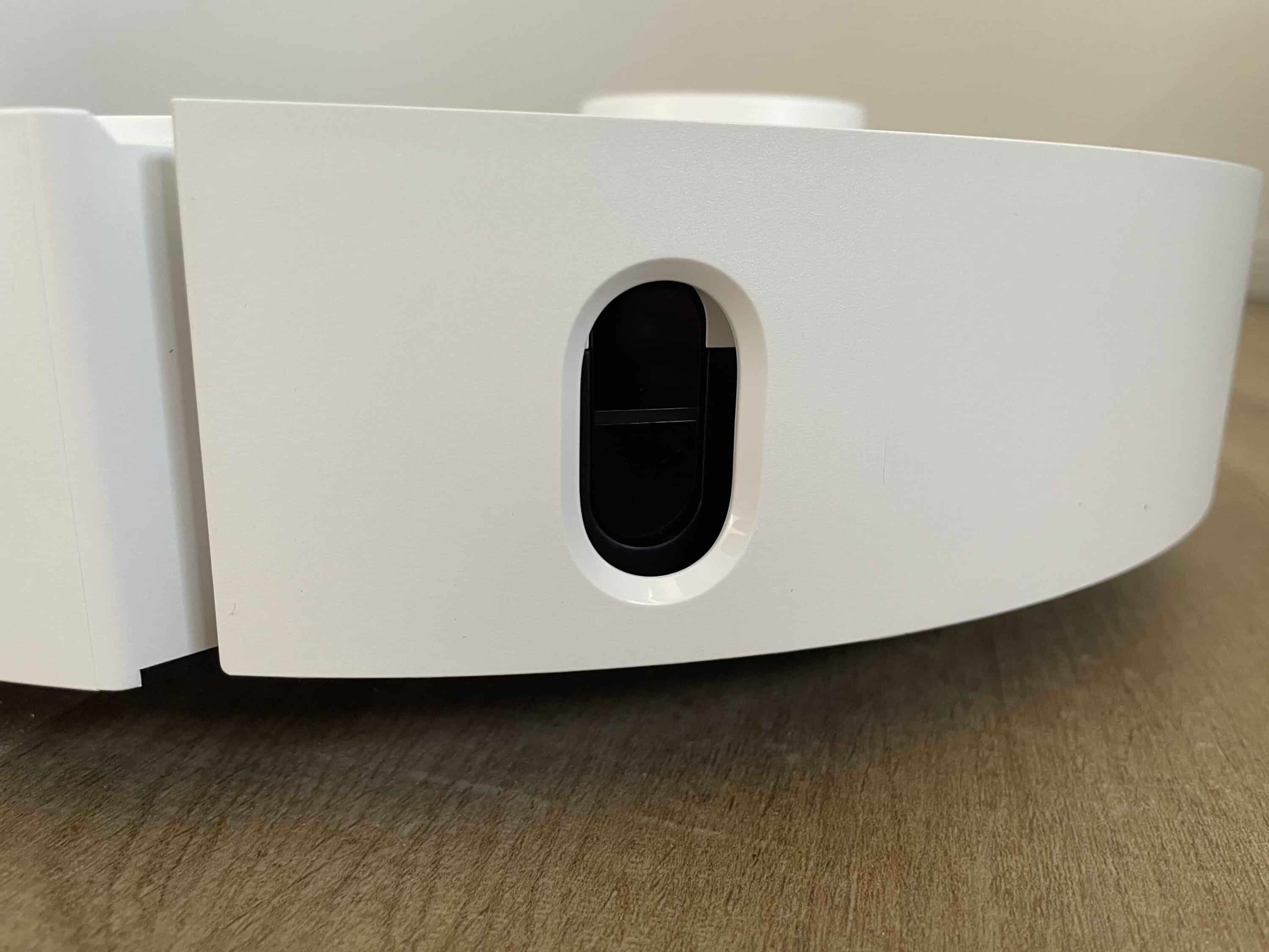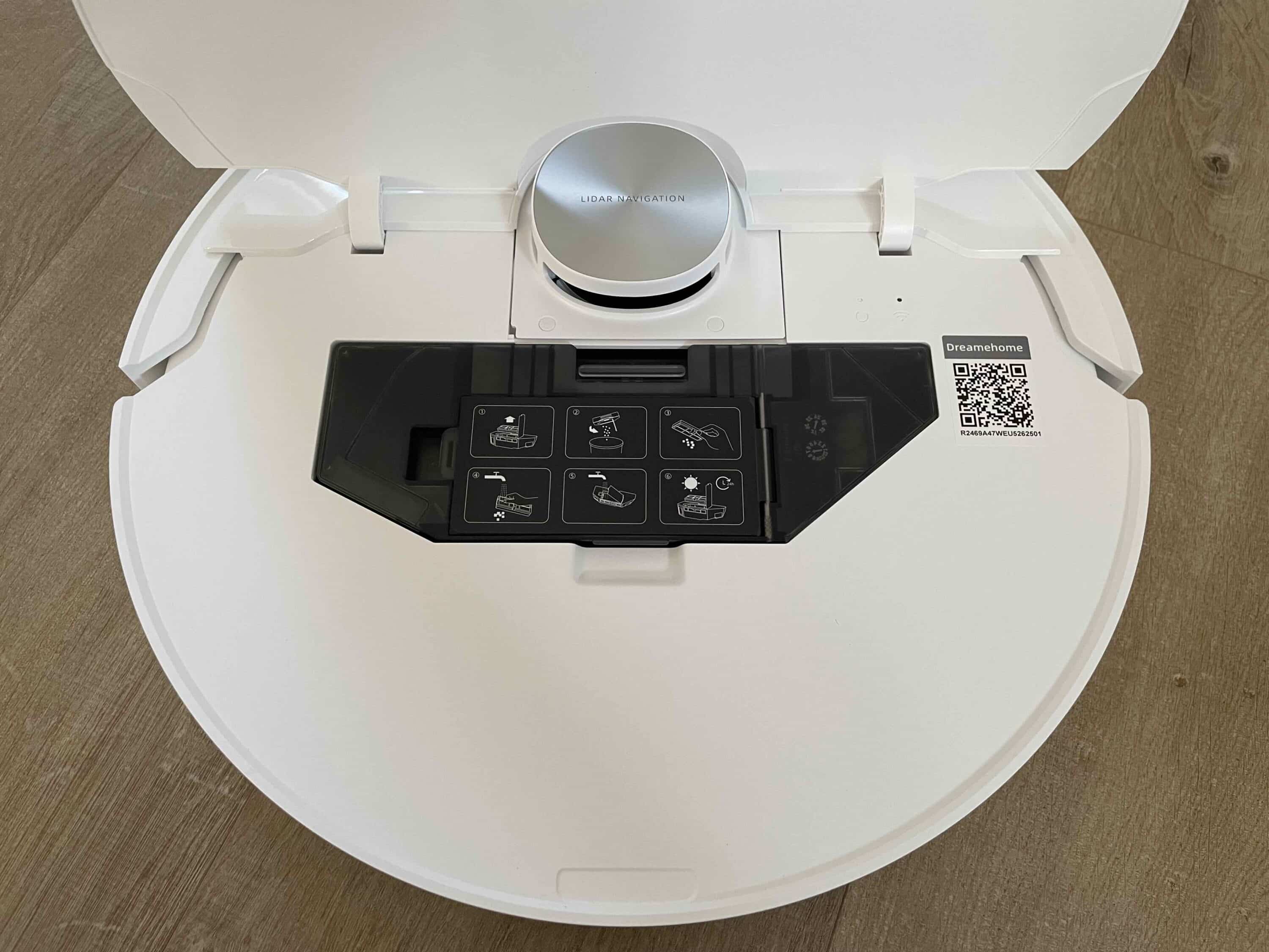 Auf der Oberseite des Saugroboters befindet sich neben dem LiDAR-Türmchen noch die Bedieneinheit mit drei Knöpfen (Spot-Clean, Home, Start/Stopp) und eine Wartungsklappe. Unter dem Deckel erhält man Zugang zum Staubbehälter, der WIFI-LED und dem Reset-Button.
