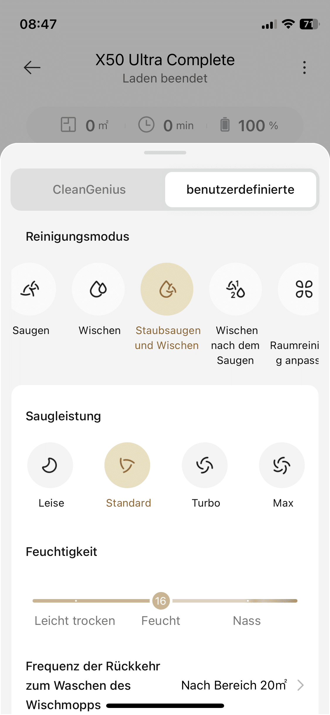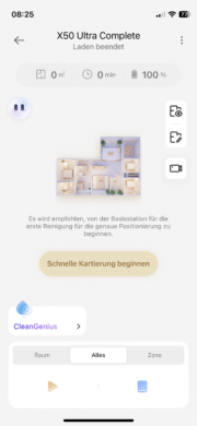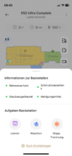 Am Anfang steht die Einrichtung. Der X50 wird zunächst ins Heimnetzwerk überführt. Im Anschluss findet die erste Kartierung statt. Nun kann man eine Vielzahl an Einstellungen am Saugroboter und der Absaugstation vornehmen. Dazu gehört nicht nur die Saug- und Wischleistung.
