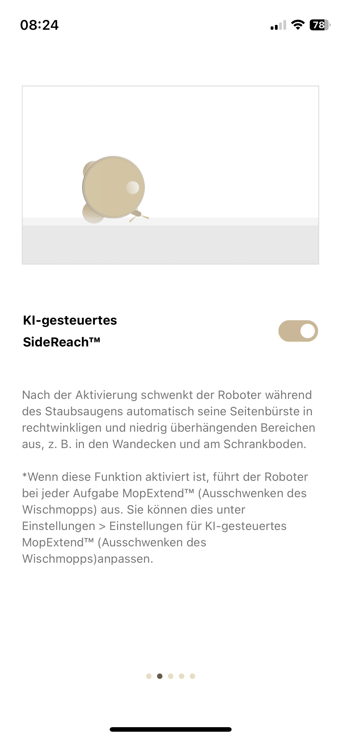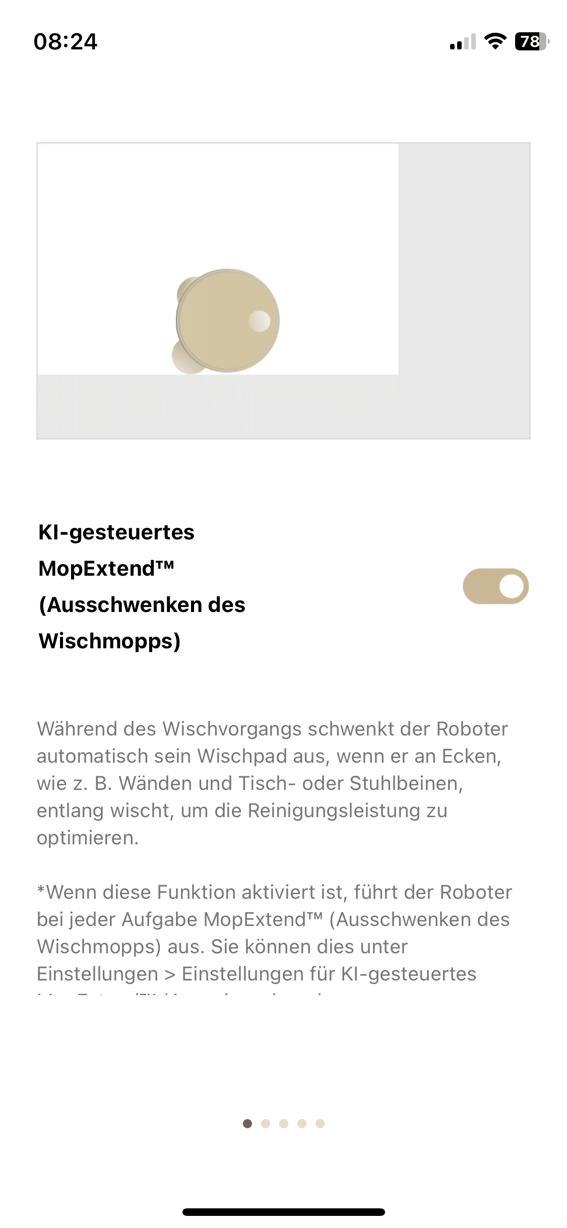 Möglich wird dies durch die bewährte Technik MopExtend. Hier fährt der Saugroboter ganz einfach seinen Wischmopp mit einer Ausfahrtiefe von 4 cm aus. So kann der smarte Haushaltshelfer entlang von bodentiefen Möbeln oder auch Fußbodenleisten wischen ohne einen Schmutzrand zu hinterlassen.