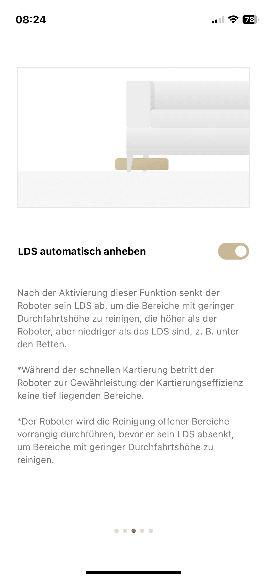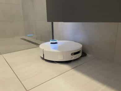 Dieses wurde nämlich nicht nur mit Bedientasten und einem Lichtring aufgemotzt. Obendrein ist das Türmchen absenkbar, was die Gesamthöhe auf niedrige 89 mm reduziert. Damit merzt Dreame die bisherige Achillesferse von Modellen mit LiDAR-Türmchen gekonnt aus. Viele erreichen aufgrund einer zu hohen Bauhöhe nämlich nicht den Bereich unter flachen Möbeln.