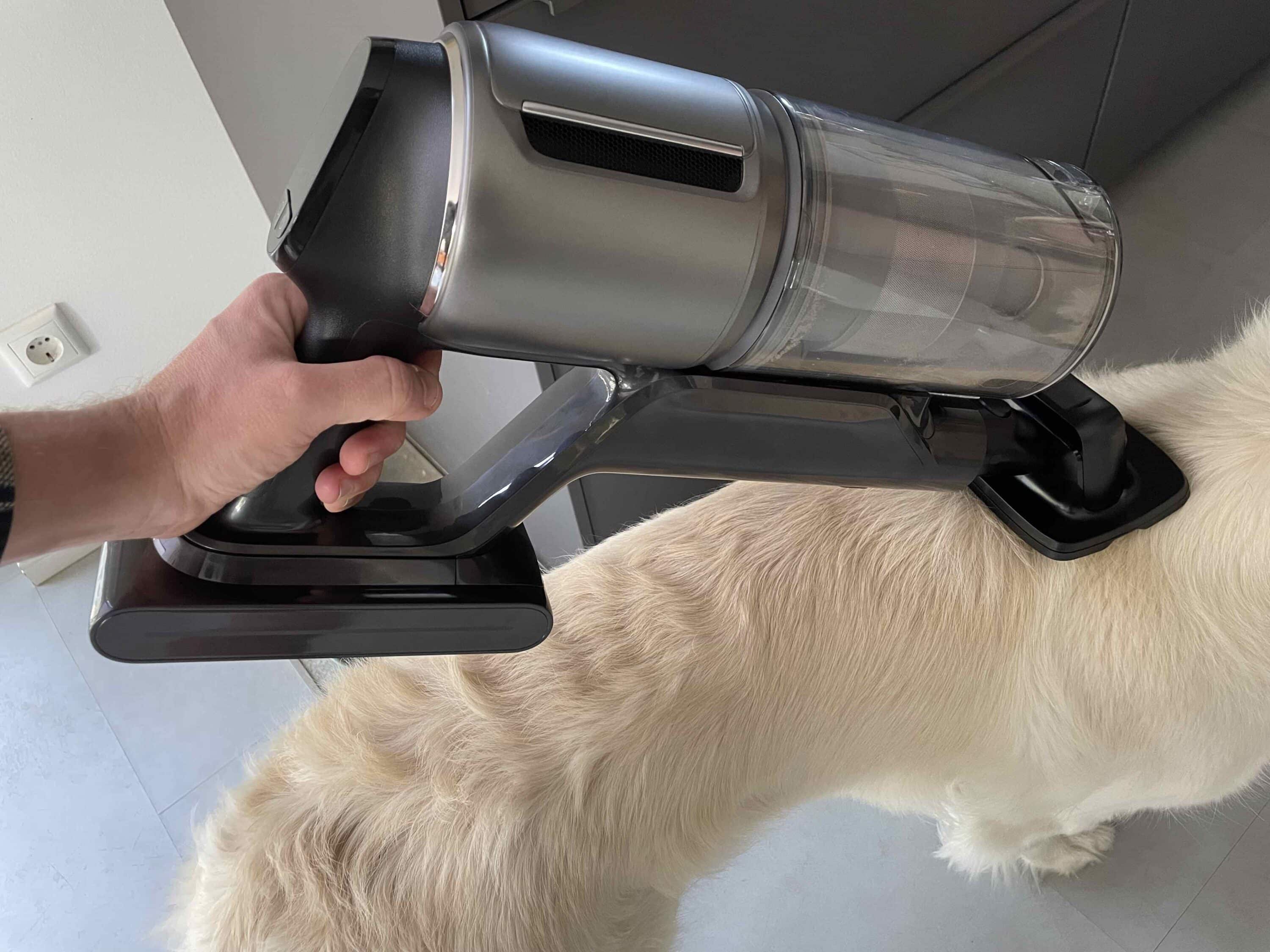 Mit dessen Hilfe soll man Tierhaare gekonnte entfernen können. Allerdings nicht vom Boden oder von Sitzmöbeln, sondern vom Tier selbst. Bei meinem haarigen Golden Retriever funktionierte das Ganze recht gut. Da der Akkusauger erfreulich leise ist, ließ mein Hund die Prozedur problemlos über sich ergehen. Ich kann mir aber vorstellen, dass andere Tiere durchaus Probleme damit haben könnten.
