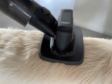 Die 2-in-1 Reinigungsbürste kommt in schmalen Nischen perfekt zum Einsatz. Mithilfe der weichen Pinselbürste lassen sich hingegen hervorragend empfindliche Holzmöbel oder die Tastatur absaugen. Für mich als Hundebesitzer ist aber vor allem der Entfilzungsaufsatz für Haustiere interessant. Wie gut dieser in der Praxis funktioniert, habe ich bei meinem mit üppigem Fell gesegneten Golden Retriever ausprobiert.