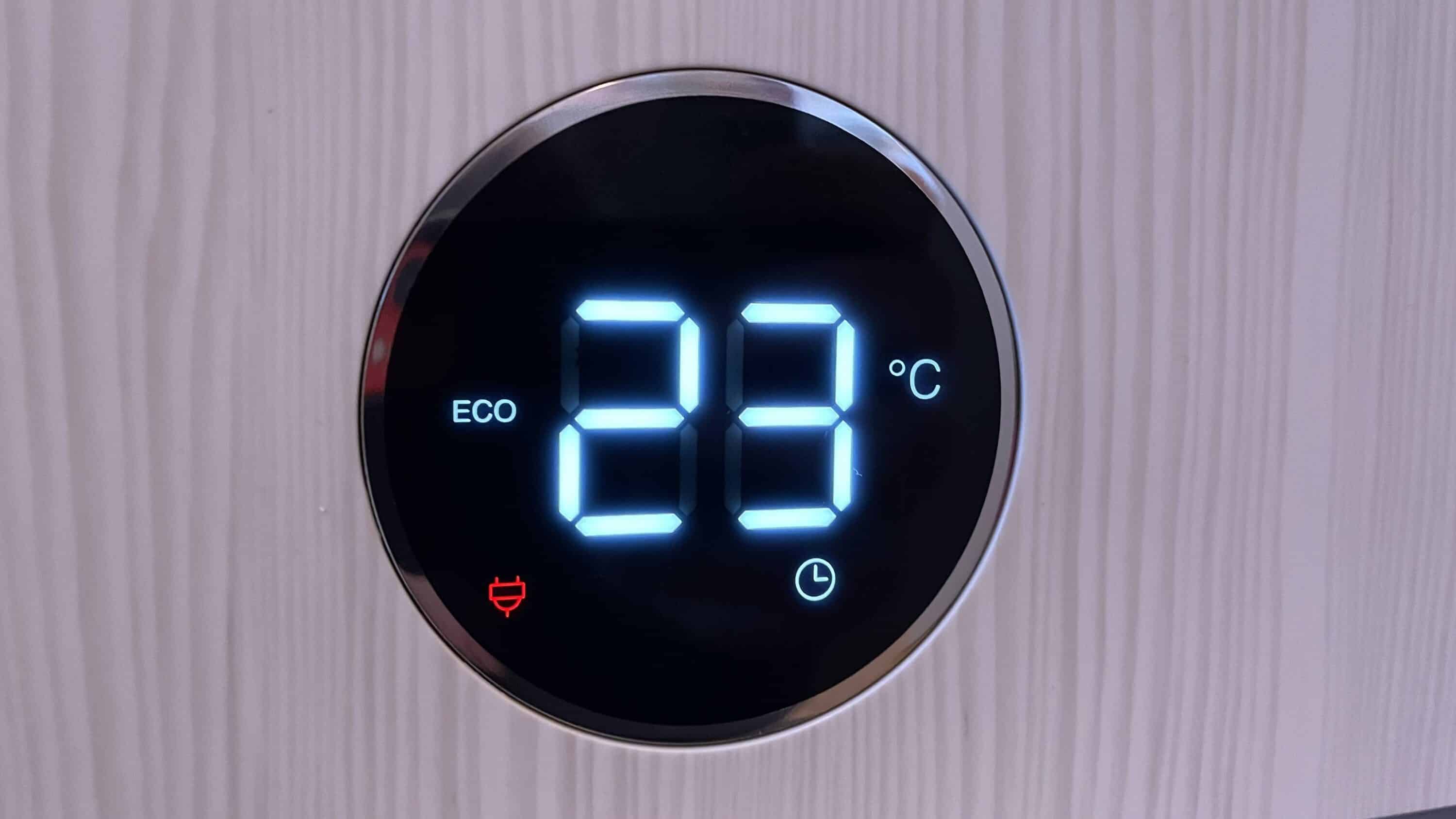 Doch hier stimmt nicht nur die Optik. Auch die Verarbeitungsqualität bewegt sich auf einem wirklich hohen Niveau. Es knackt und knarzt an keiner Stelle, was in dieser Preisklasse alles andere als selbstverständlich ist. Als Kontroll- und Bedieneinheit sitzt an der elektrischen Wandheizung ein 2,4 Zoll großes kreisförmiges Display. Hier könnt ihr wichtige Parameter wie beispielsweise die aktuell angepeilte Raumtemperatur ablesen. Dank der großen weißen Ziffern fällt das auch mit etwas Abstand leicht.