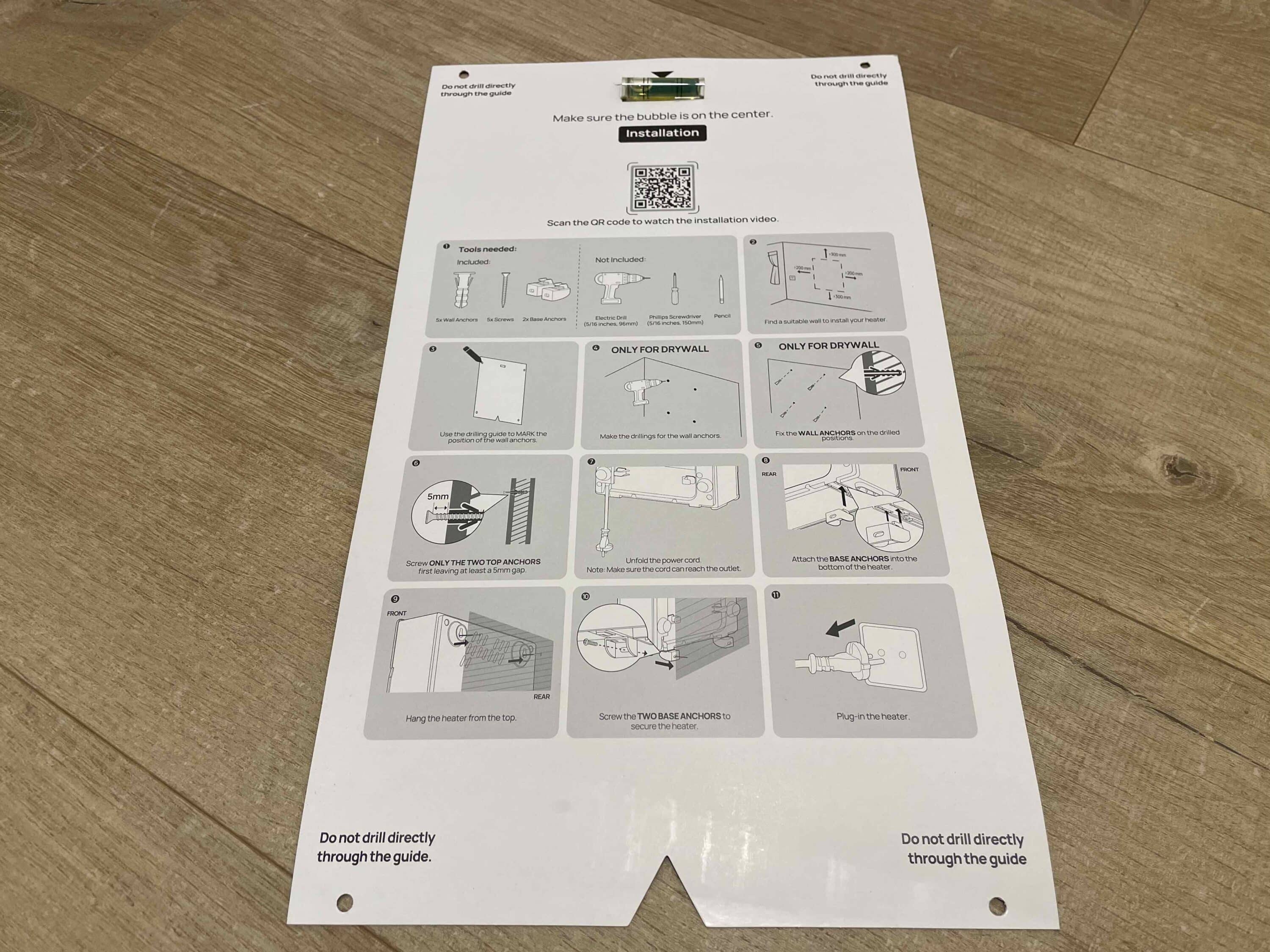 Zumal DREO bei der Montage helfend zur Hand geht. So gibt es nicht nur eine praktische mitgelieferte Bohrschablone, die nicht nur die Bohrpositionen vorgibt. Obendrein verfügt sie über eine integrierte Wasserwaage. Sehr praktisch! Nachdem insgesamt Vier Schrauben in der Wand Platz gefunden haben, kann man das Gerät aufhängen und das Netzkabel in die Steckdose einstecken. Grundsätzlich lässt sich die Heizung nun bereits bedienen. Hierbei kommt auch die beiliegende Fernbedienung zum Einsatz.