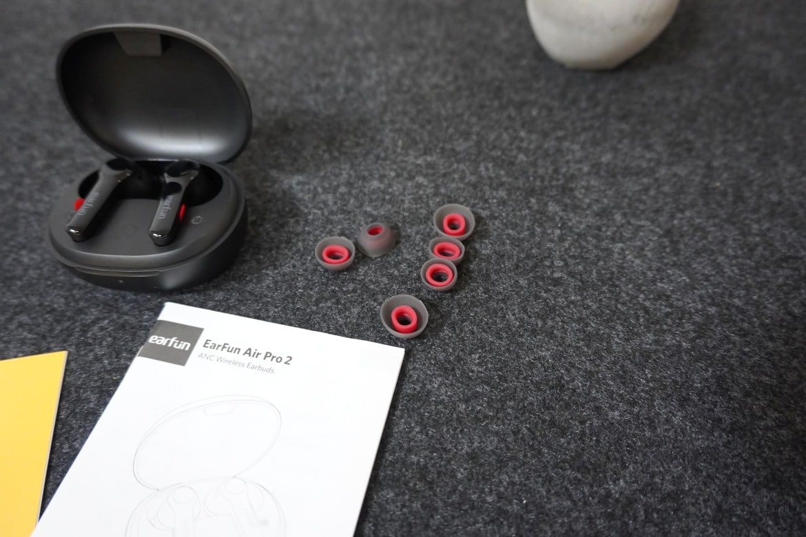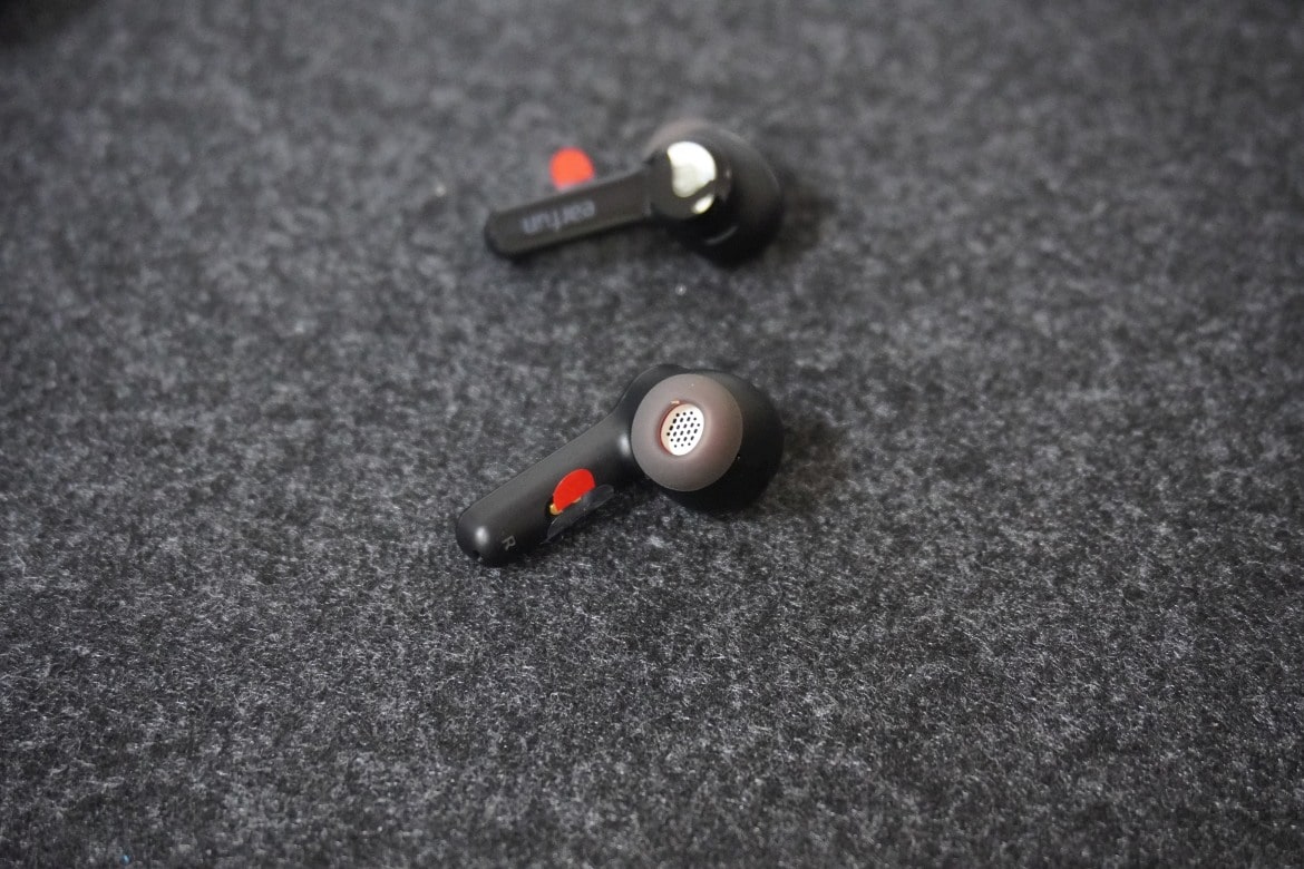 Mit einem roten Gummiring finden die Aufsätze an den Kopfhörern selbst Platz, was durch die transparente Optik für einen recht auffälligen und schicken Look sorgt. Die abgeflachte Außenseite der insgesamt rund 37 mm langen EarFun Air Pro 2 erinnert ein wenig an die Skullcandy Indy ANC.