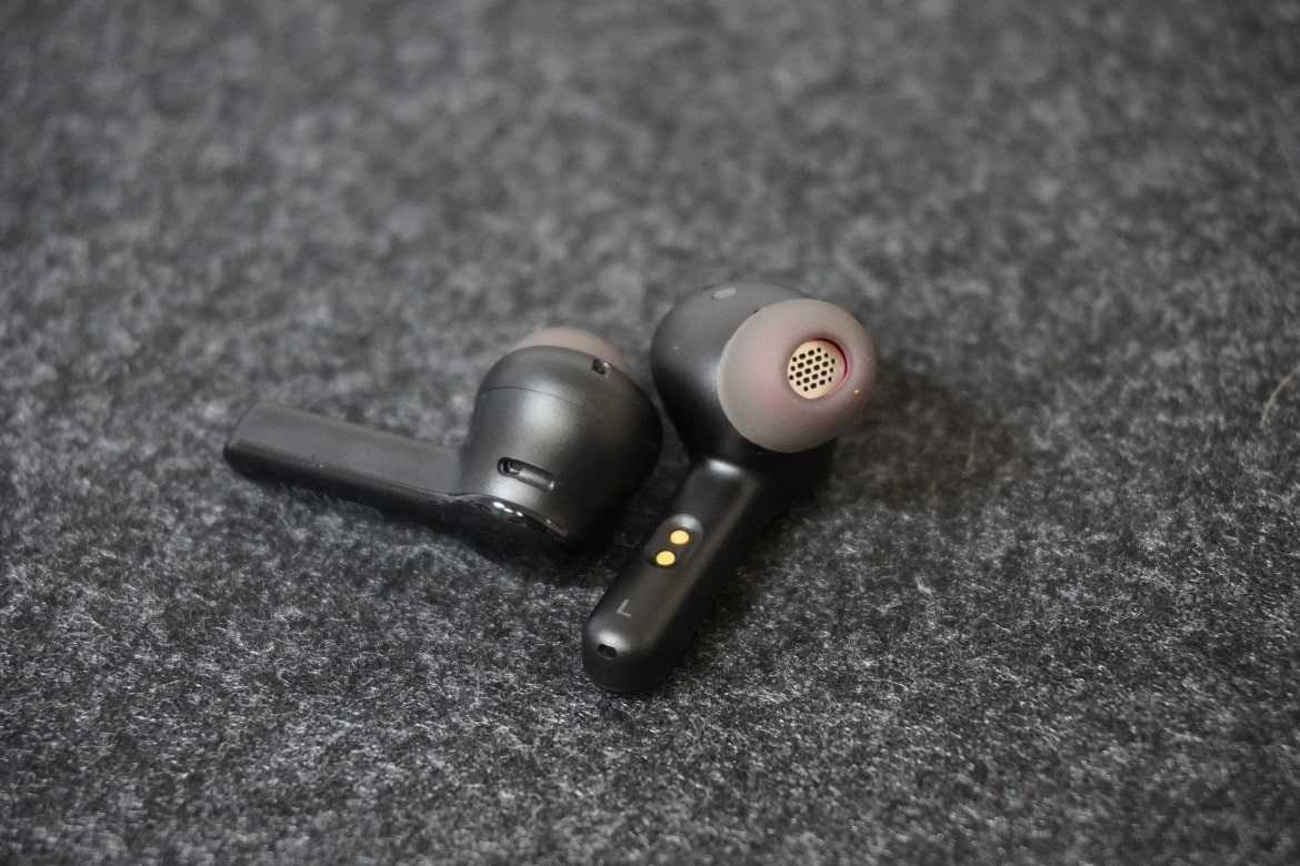 Beim Öffnen des Ladeetuis werden wir direkt von den glänzenden schwarzen In-Ears begrüßt, die eine klassische Form samt langem Bügel aufweisen, wie wir sie mittlerweile beim Großteil aller Earbuds vorfinden. Besagten Bügel ziert ein hellgrauer Schriftzug mit dem Herstellerlogo, während die Silikon-Aufsätze in halb-transparentem Grau vorliegen.