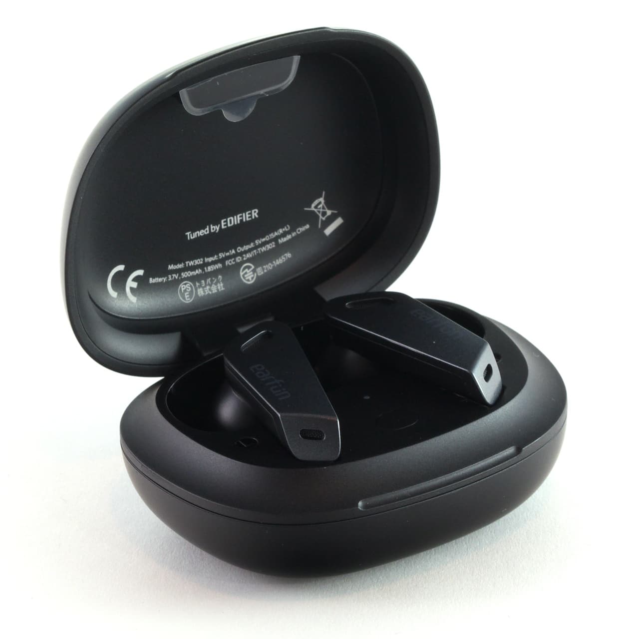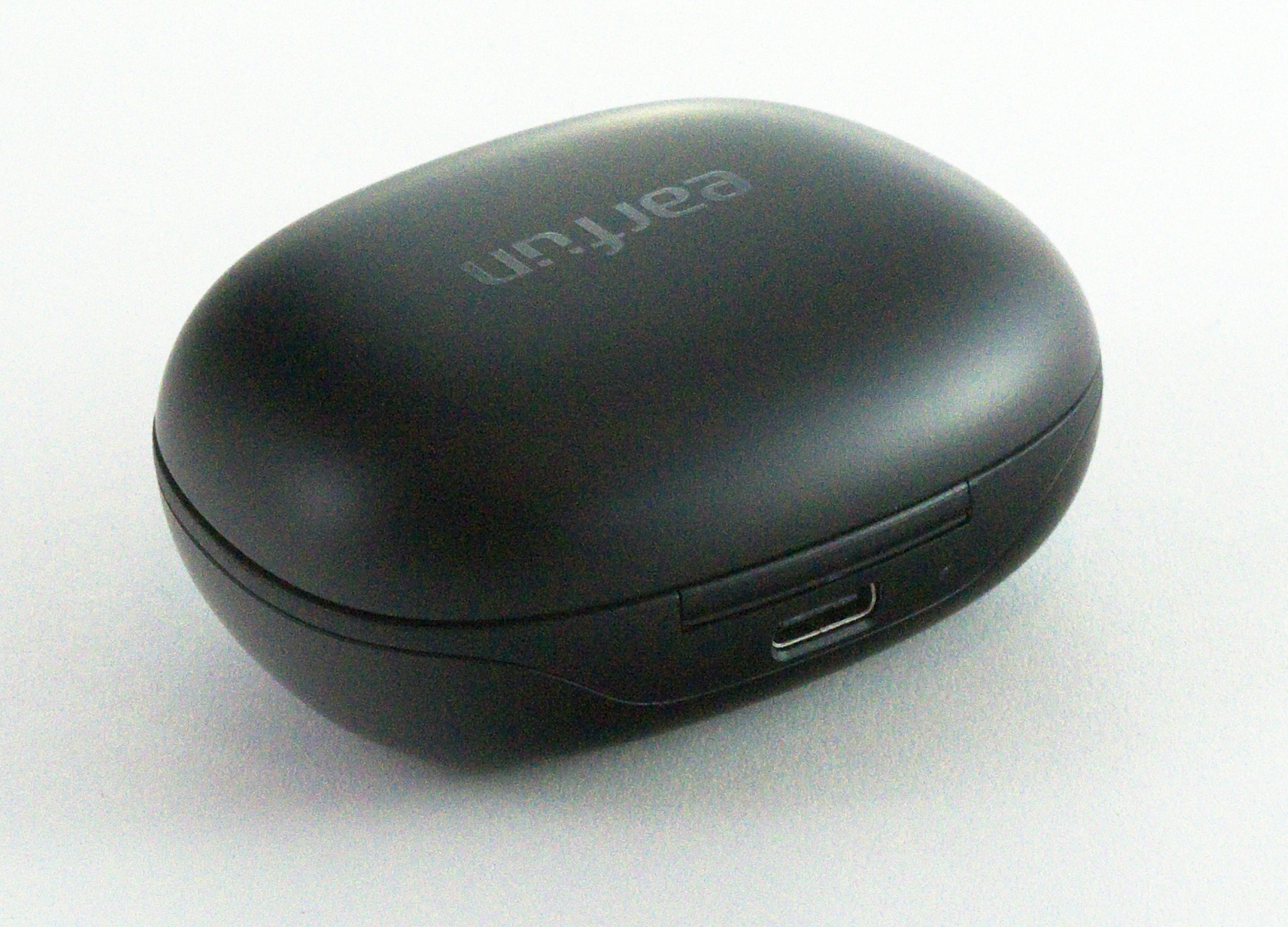 Die Earfun Air Pro setzen auf ein markantes Design: An dem runden Korpus, der ins Ohr eingesetzt wird, befindet sich ein länglicher, eckiger Fortsatz, der beim Tragen hauptsächlich wahrgenommen wird. Die Außenseite dieses Segments besteht aus dunkelgrauem Kunststoff, in dem das Earfun-Logo untergebracht ist. Der gesamte Rest des Gehäuses ist hingegen in mattschwarz gehalten. Derselbe Kunststoff kommt auch beim Ladeetui zum Einsatz, in dem die In-Ears normalerweise aufbewahrt werden.