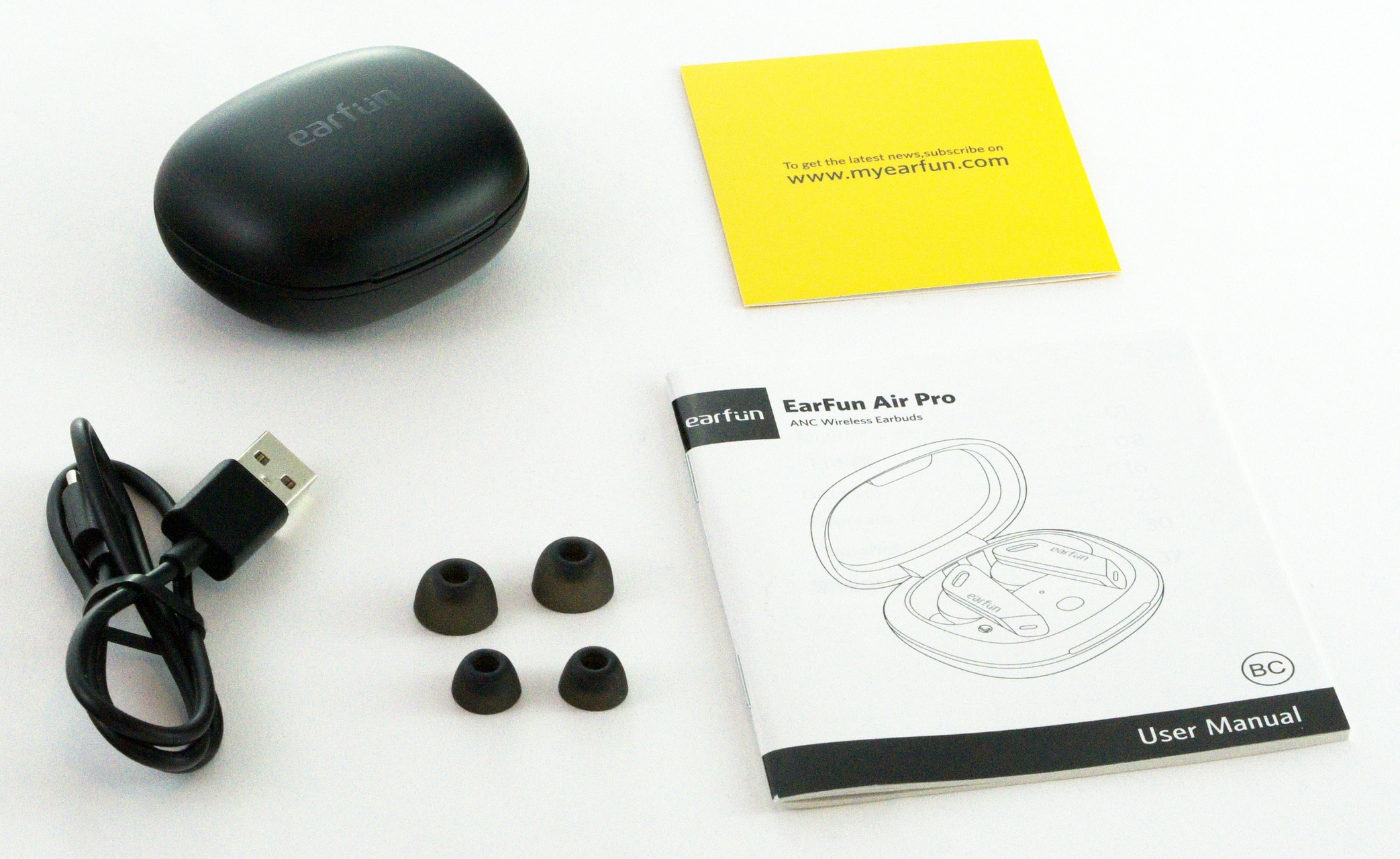 Beim Zubehör bietet Earfun das Übliche: Die Air Pro werden in einem Ladeetui ausgeliefert, zusätzlich gibt es noch ein 0,5 Meter langes USB-C-Ladekabel sowie insgesamt drei Sets mit Silikonkappen, durch die man die Kopfhörer auf die eigenen Ohren anpassen kann. Zuletzt gibt es noch eine kurze Anleitung, in der die wichtigsten Funktionen und Bedienmöglichkeiten erklärt werden.