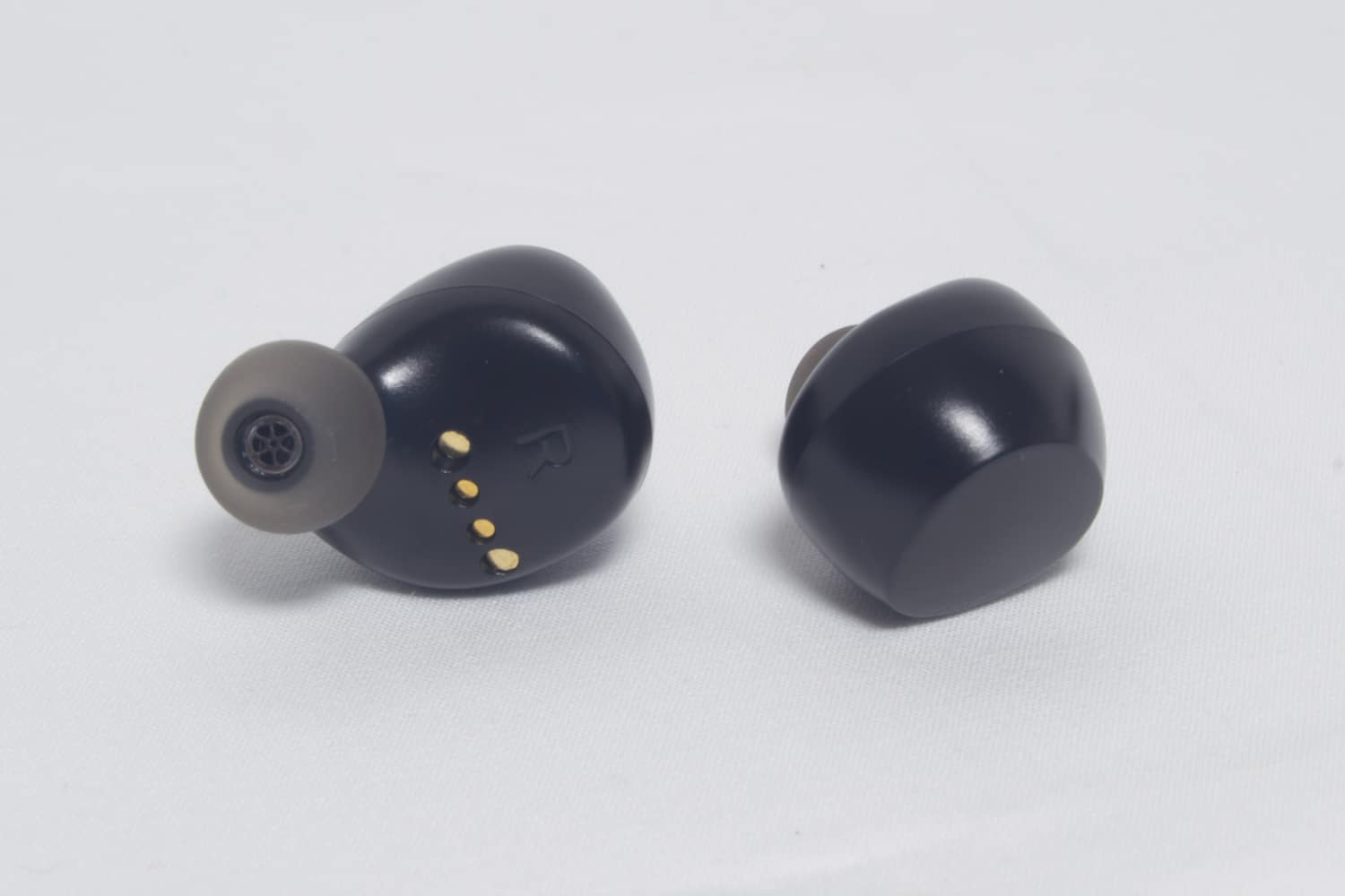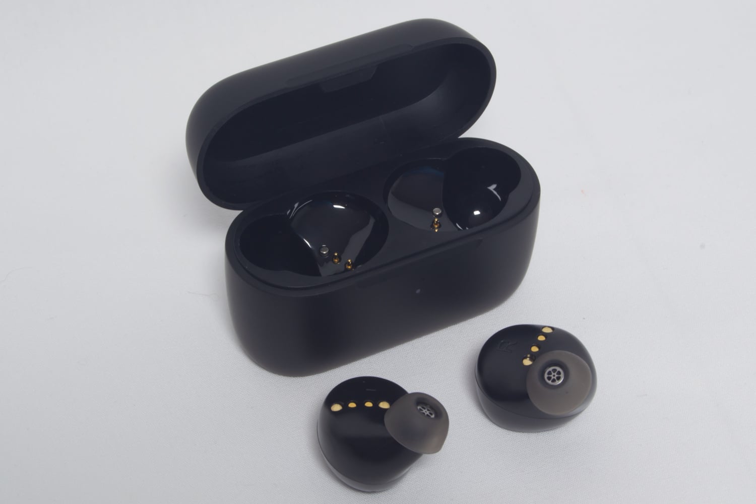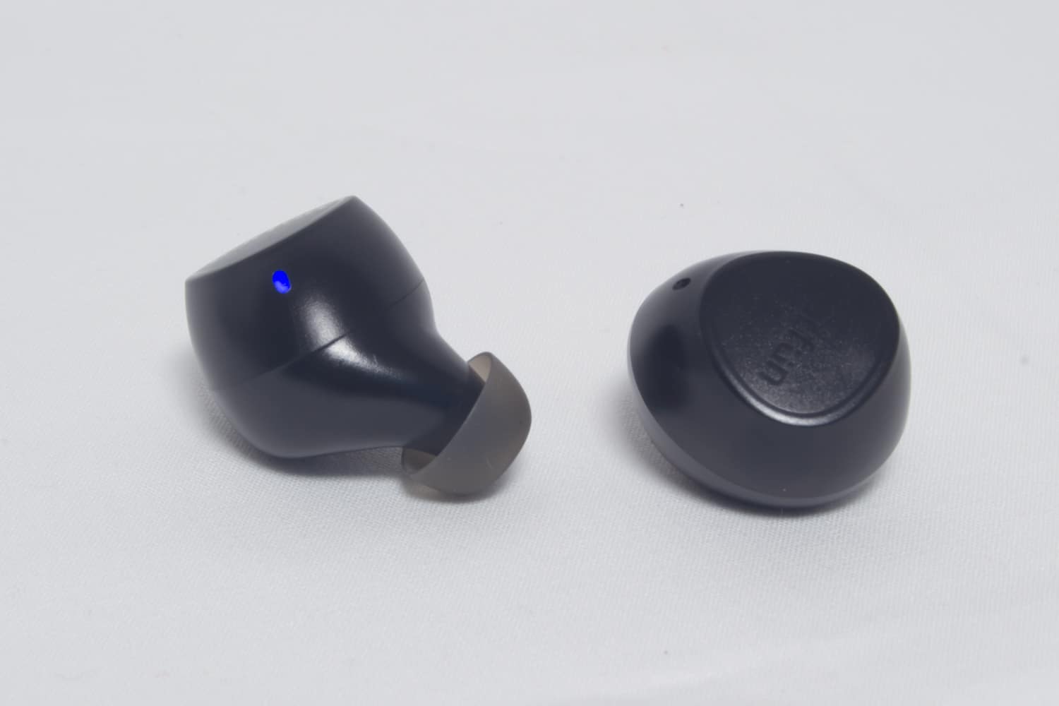 In beiden Kopfhörern eingelassen sind vier metallische Ladekontakte und jeweils ein kleines Loch für Mikrofon (nur rechter Kopfhörer) und LED-Leuchte (beide Kopfhörer). Die ebene Außenfläche der Kopfhörer, die auch das Logo ziert, besitzt eine Touch-Funktion, über die sich diverse Funktionen ausführen lassen.