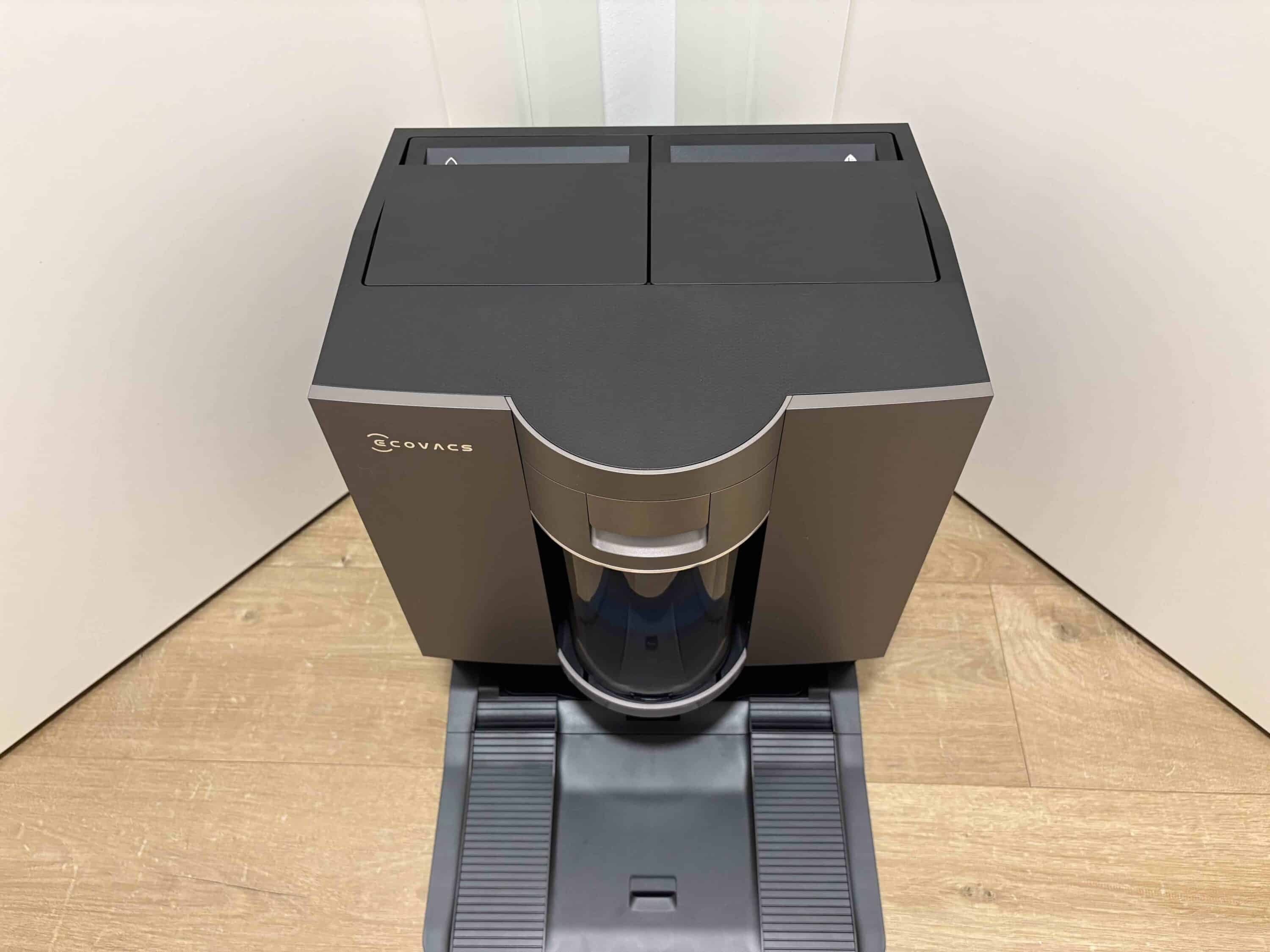 Die Optik der Front entspricht dem Design der Oberseite des Saugroboters. Über die Oberseite erreicht ihr den 3,2 Liter großen Frischwasser- und den 2,7 Liter großen Schmutzwassertank. Mittig auf der Vorderseite befindet sich der 1,6 Liter fassende Staubbehälter. Ecovacs setzt hier auf ein erfreulich nachhaltiges Konzept. Im Gegensatz zu so ziemlich jeder anderen Reinigungsstation von Saugrobotern kommen hier nämlich keine Beutel zum Einsatz.