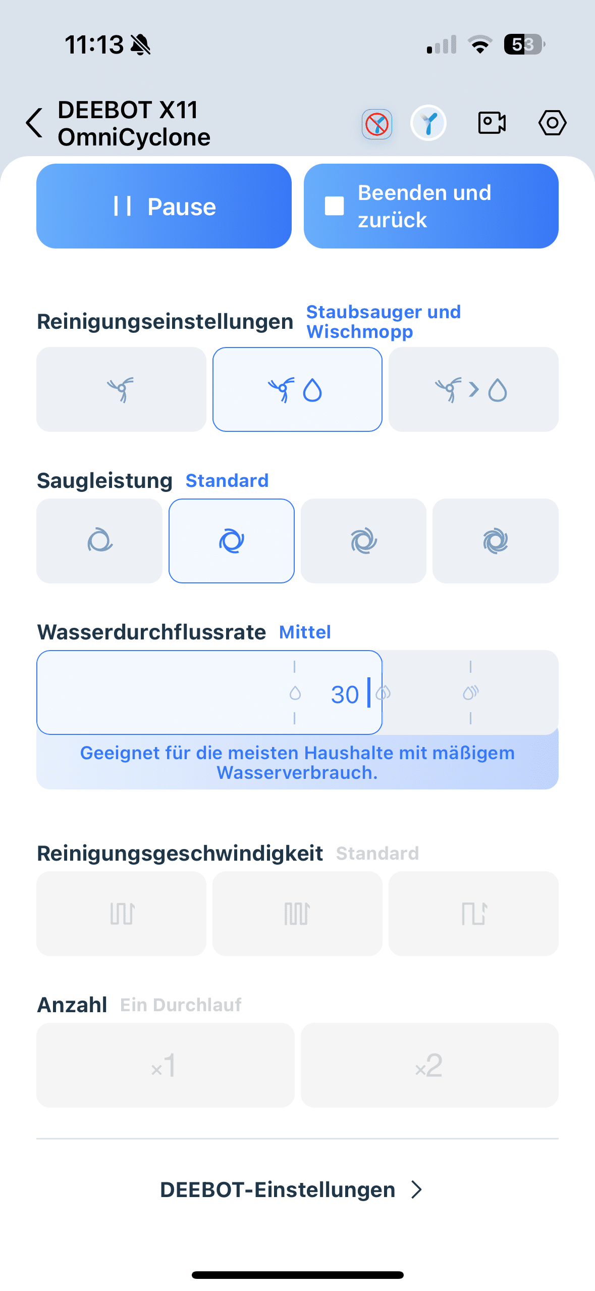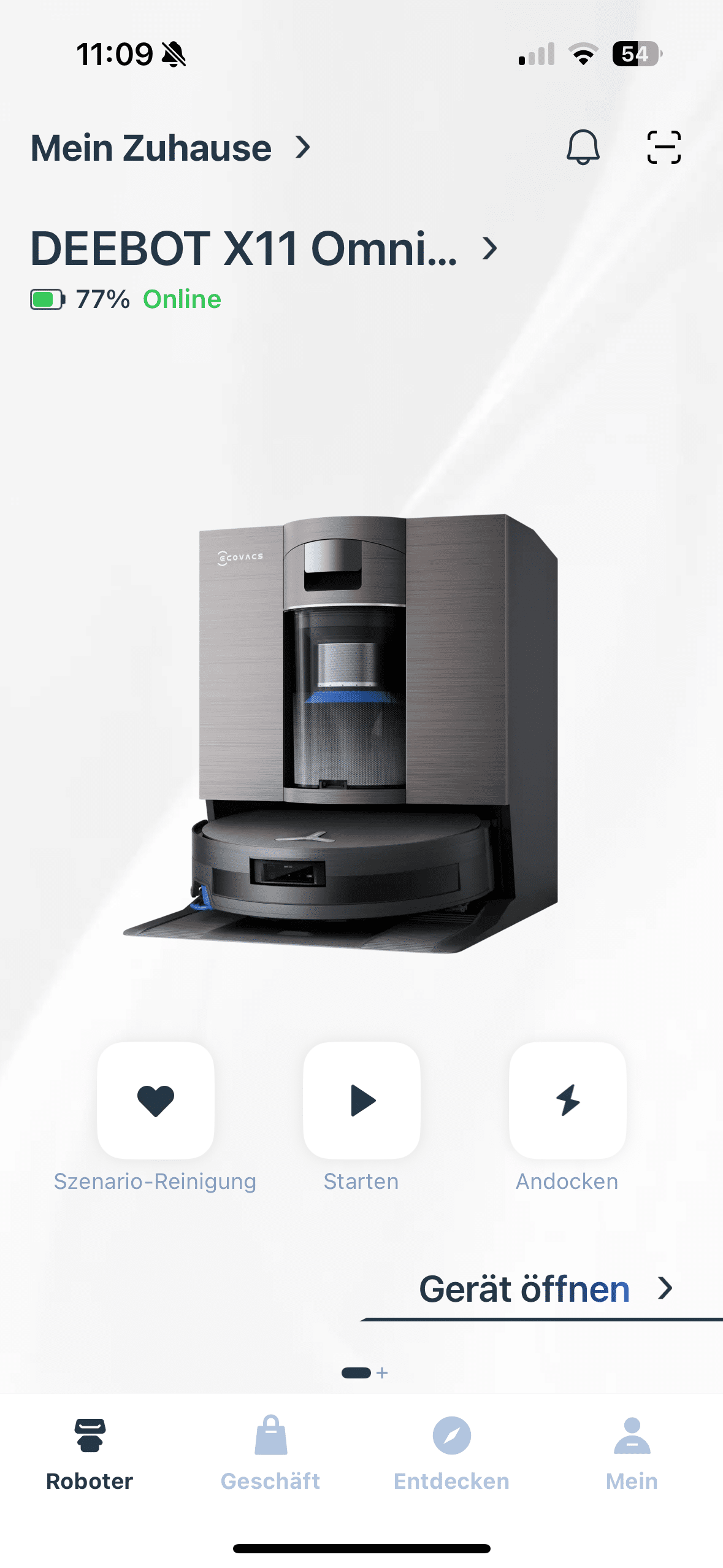 Bei der Steuerung des ECOVACS DEEBOT X11 OmniCyclone kommt natürlich nicht nur die rudimentäre Bedieneinheit auf dem Robo selbst zum Einsatz. Stattdessen steht dabei die ECOVACS App im Zentrum. Über diese lässt sich das Gerät zunächst einmal blitzschnell einrichten und in euer Netzwerk überführen. Letzteres ist wichtig, da ihr den smarten Haushaltshelfer so auch ferngesteuert vom anderen Ende der Welt steuern und überwachen könnt.