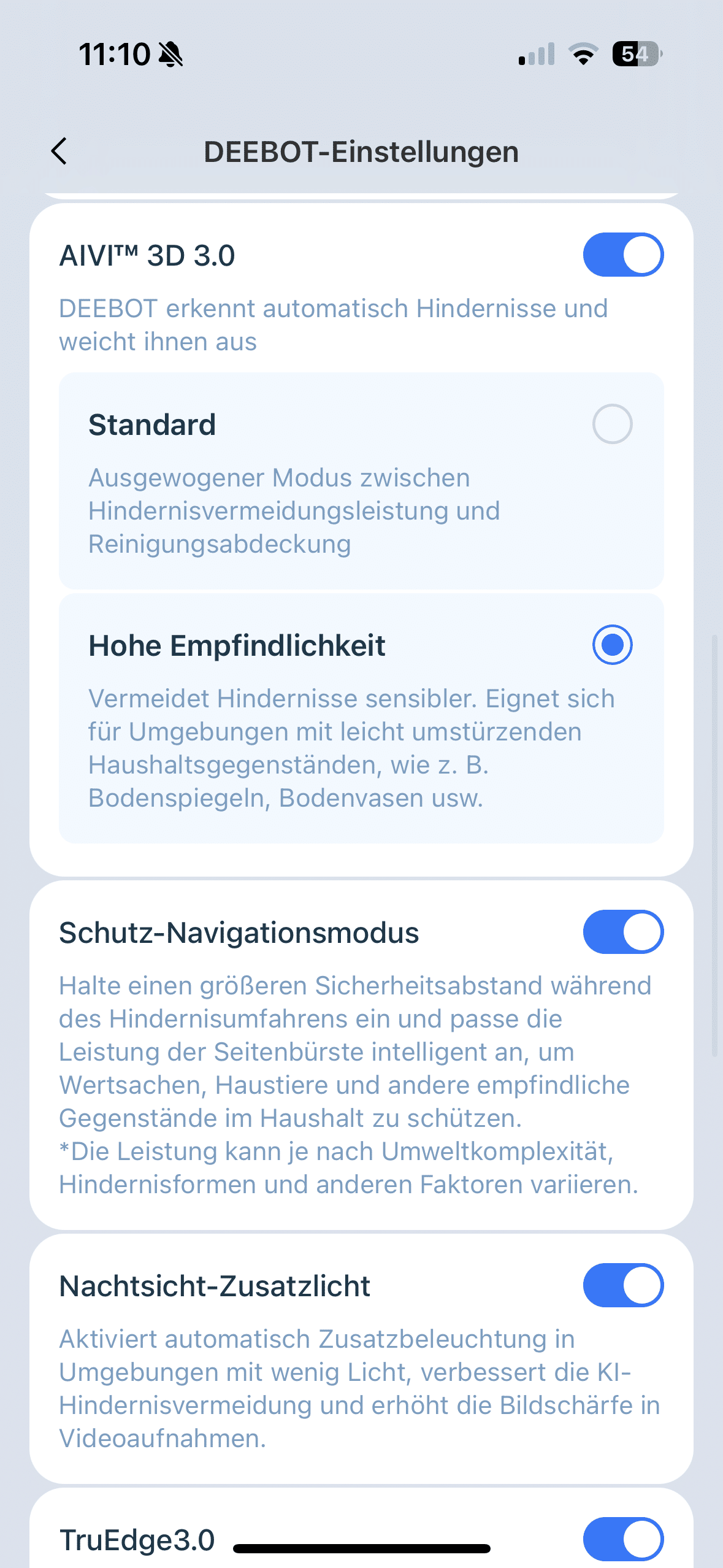 Da ECOVACS auf Infrarot setzt, funktioniert das System auch bei absoluter Dunkelheit. In der Praxis navigierte der Robo zuverlässig und ausreichend schnell durch die Wohnung. Die Räume werden systematisch abgearbeitet. Dabei fährt er zunächst die Ränder ab, um im Anschluss den Innenbereich zu reinigen. Nicht nur die dToF-Navigation weiß zu überzeugen. Auch von der Hinderniserkennung war ich durchaus angetan.