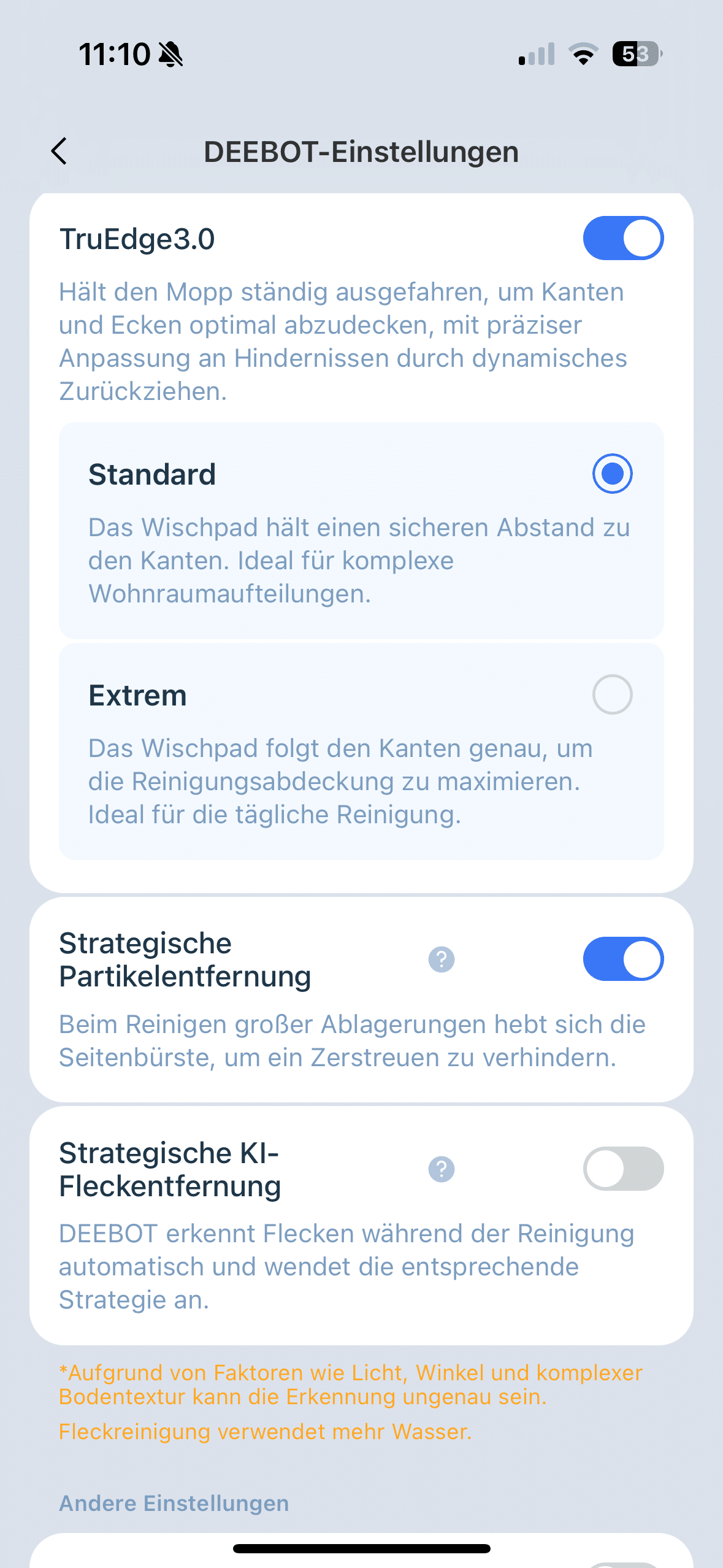 Dabei werden zwar nicht gezielt Gegenstände kategorisiert, wie es beispielsweise bei einem Narwal Freo Z10 Ultra (Test | € 1.299,00 *) der Fall ist, doch AI-Stain-Detection soll Fleckentypen unterscheiden und entsprechend reagieren können. Was in der Theorie gut klingt, konnte ich in der Praxis leider noch nicht wirklich spüren. Mal schauen, was künftige Updates hier noch bringen.