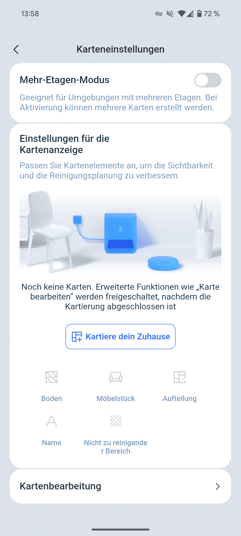 Die erste Kartierungsfahrt unserer 50-m²-Testwohnung verlief zielstrebig und ohne große Umwege. Bereits nach etwa 8 Minuten war eine brauchbare Karte erstellt, die sich in der App nachbearbeiten ließ. Die automatische Raumaufteilung funktionierte größtenteils korrekt, nur kleine Korrekturen waren nötig.