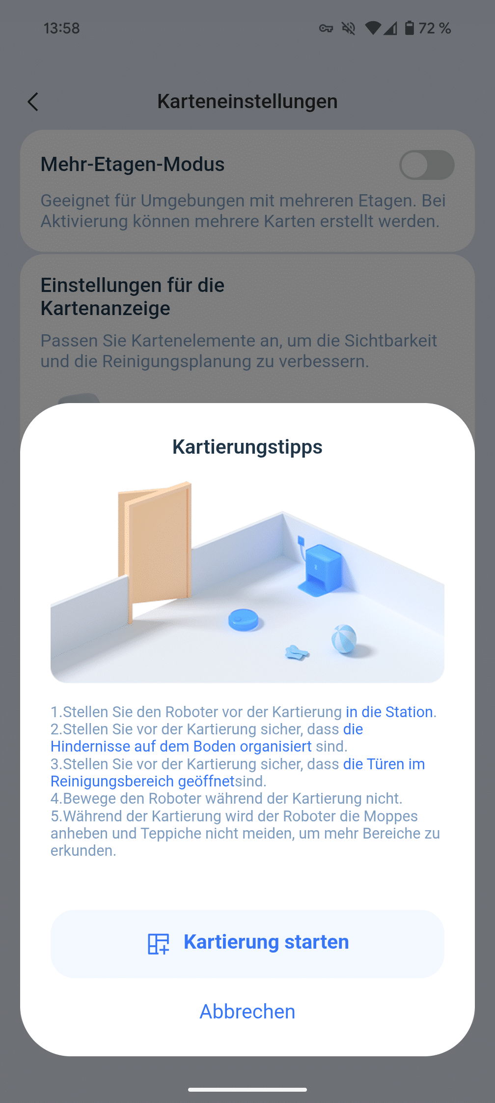 Die Navigation funktioniert deutlich besser als erwartet. Obwohl der X9 Pro Omni auf den klassischen LiDAR-Turm verzichtet und stattdessen auf AIVI 3D 3.0 mit integrierten Sensoren setzt, arbeitet er erstaunlich präzise. Die Kartierung ist kompakt und nicht überfordernd – ein Pluspunkt gegenüber manchen Konkurrenten, die mit Features überladen sind.