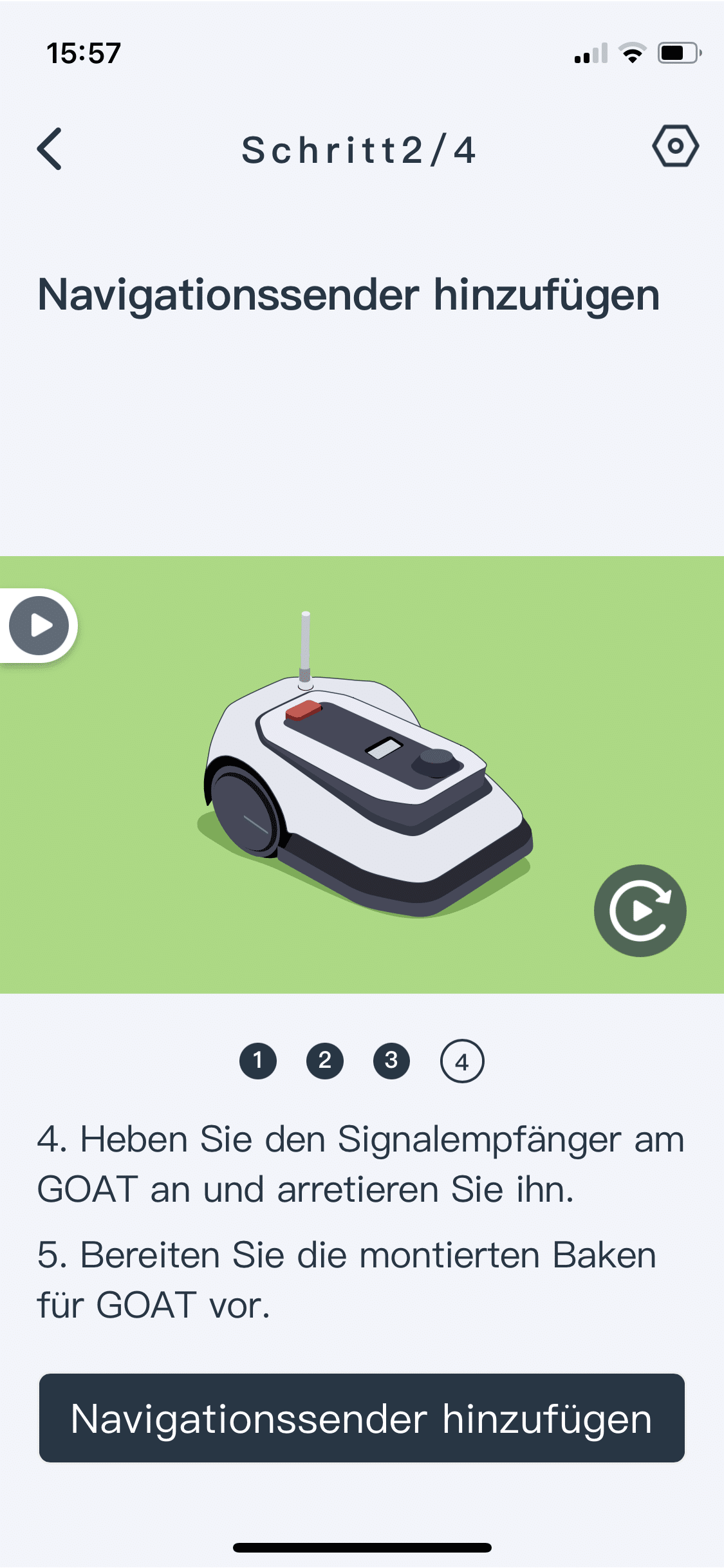 Wichtig ist, dass du die Masten erst registrierst und dann im Garten verteilst. Schließlich müssen sie sich für das Prozedere in der Nähe des Roboters befinden. Schritt für Schritt leitet dich die App nun durch den Einrichtungsvorgang. Jeder einzelne funktionierte dabei völlig problemlos. Dafür sorgten auch die selbsterklärenden Bilder und Animationen, die in der App deutlich machen, was zu tun ist.