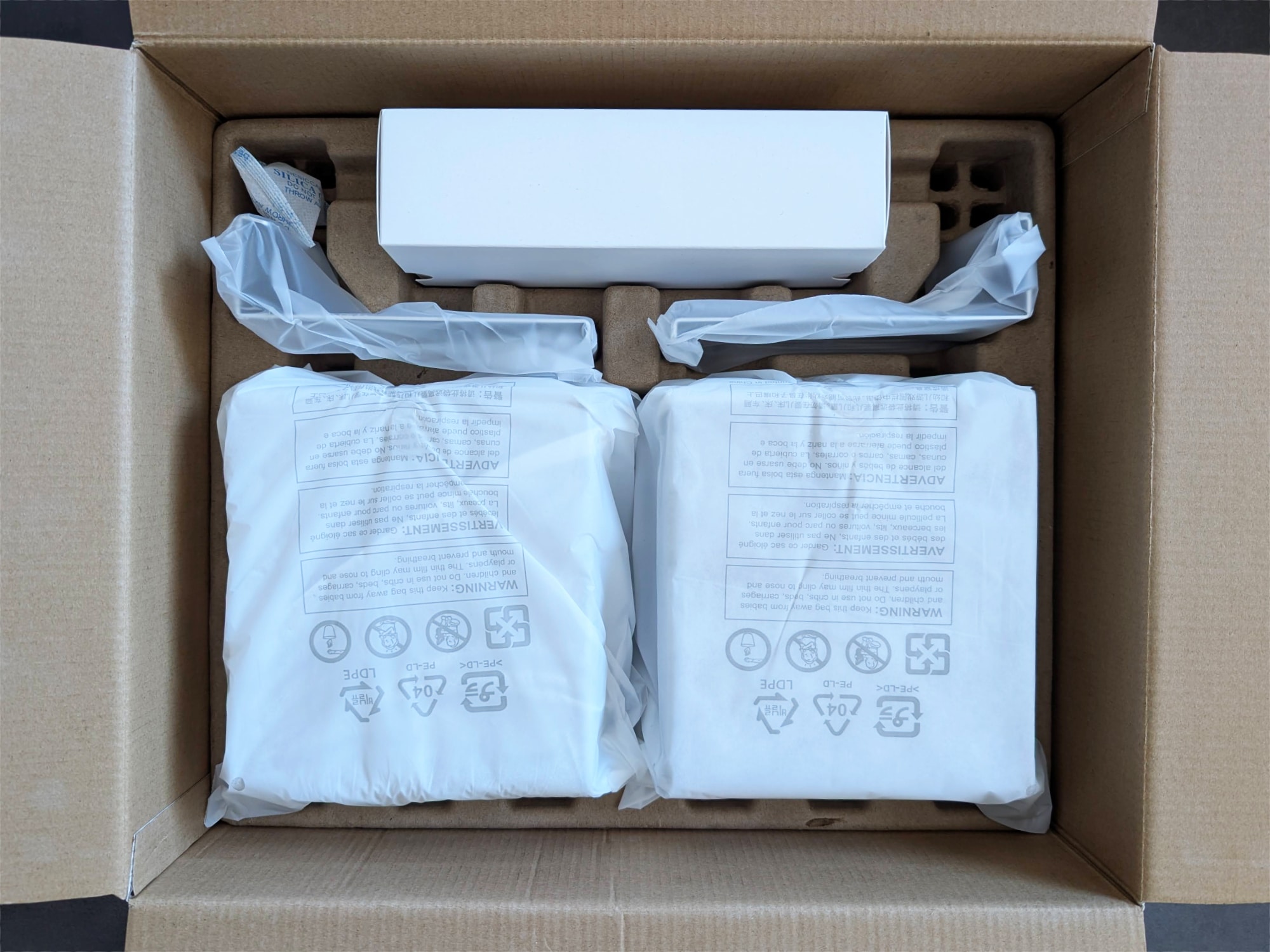 Der Karton enthält die Lautsprecher, die Lautsprecherständer und einen kleineren Karton mit weiterem Zubehör. In dem kleinen Karton befinden sich neben einem Lautsprecher-Verbindungskabel, einem Netzkabel und einer Bedienungsanleitung auch ein USB-C-Kabel, ein 3,5-mm-Klinkenkabel und ein 3,5-mm-Klinke-auf-Cinch-Kabel zum Anschluss von Geräten. Der Lieferumfang ist insgesamt sehr umfangreich.