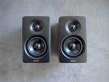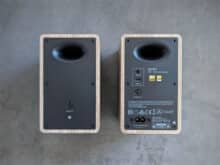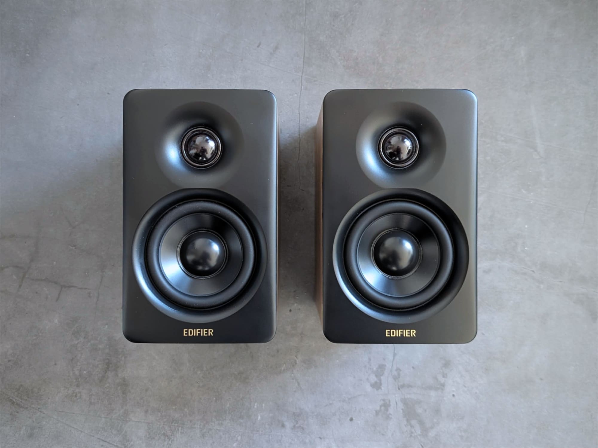 Die Vorderseite der Edifier M60 ist fast vollständig schwarz, das goldene Edifier-Logo unterhalb der Mitteltieftöner bildet einen Kontrast. Die Mitteltieftöner haben einen Durchmesser von 3″ (76 mm) und verwenden fast die gesamte Breite der Gehäuse von 100 mm, die Hochtöner darüber haben einen Durchmesser von 1″ (25 mm).