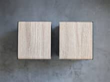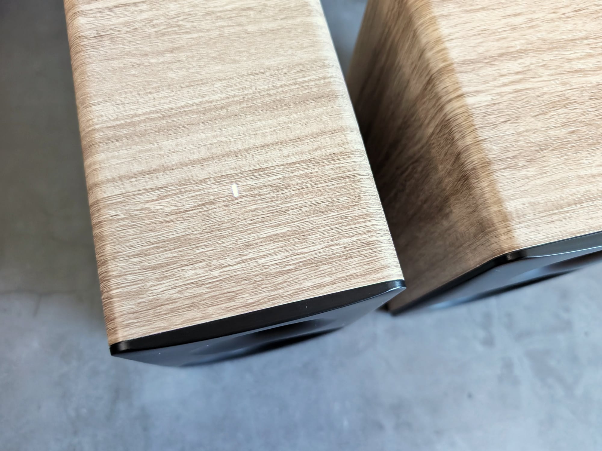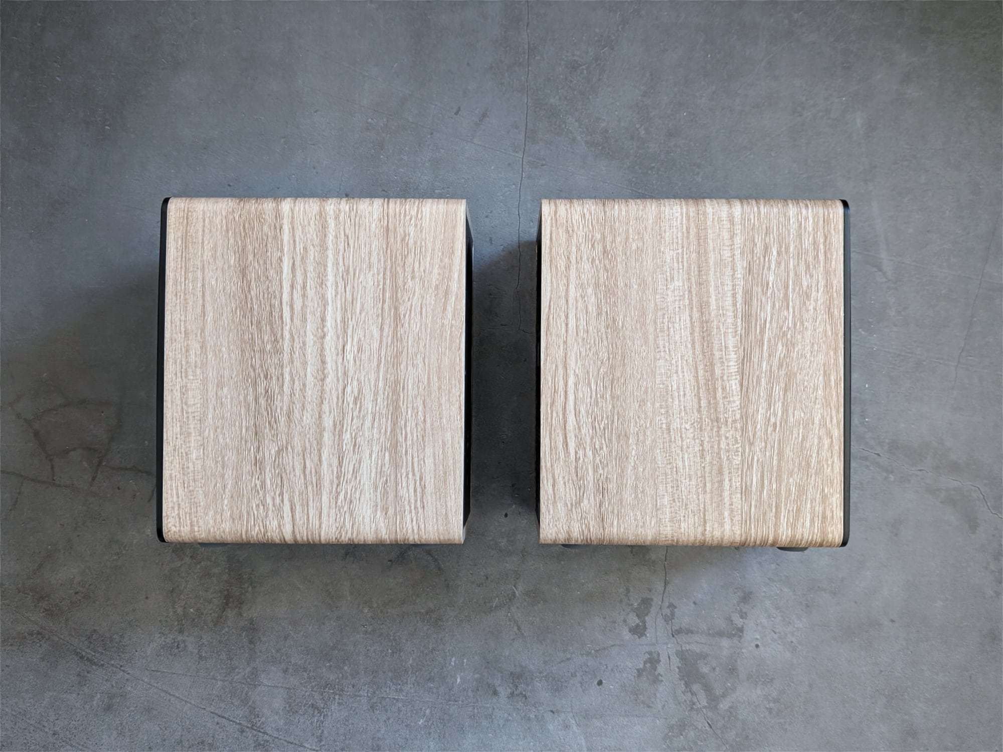 Der Aktivlautsprecher und der Passivlautsprecher sind bis auf die Rückseite optisch identisch. Bei der Farbvariante Eiche sind die Vorderseite und Rückseite der Lautsprecher schwarz, die anderen Seiten in Eiche. Die schwarze Vorderseite wirkt hochwertig. Die eichenfarbenen Seiten wirken aus der Nähe jedoch weniger hochwertig, da die Oberfläche sehr künstlich wirkt. Bei den Farbvarianten schwarz und weiß sind die Lautsprecher vollständig in der ausgewählten Farbe.