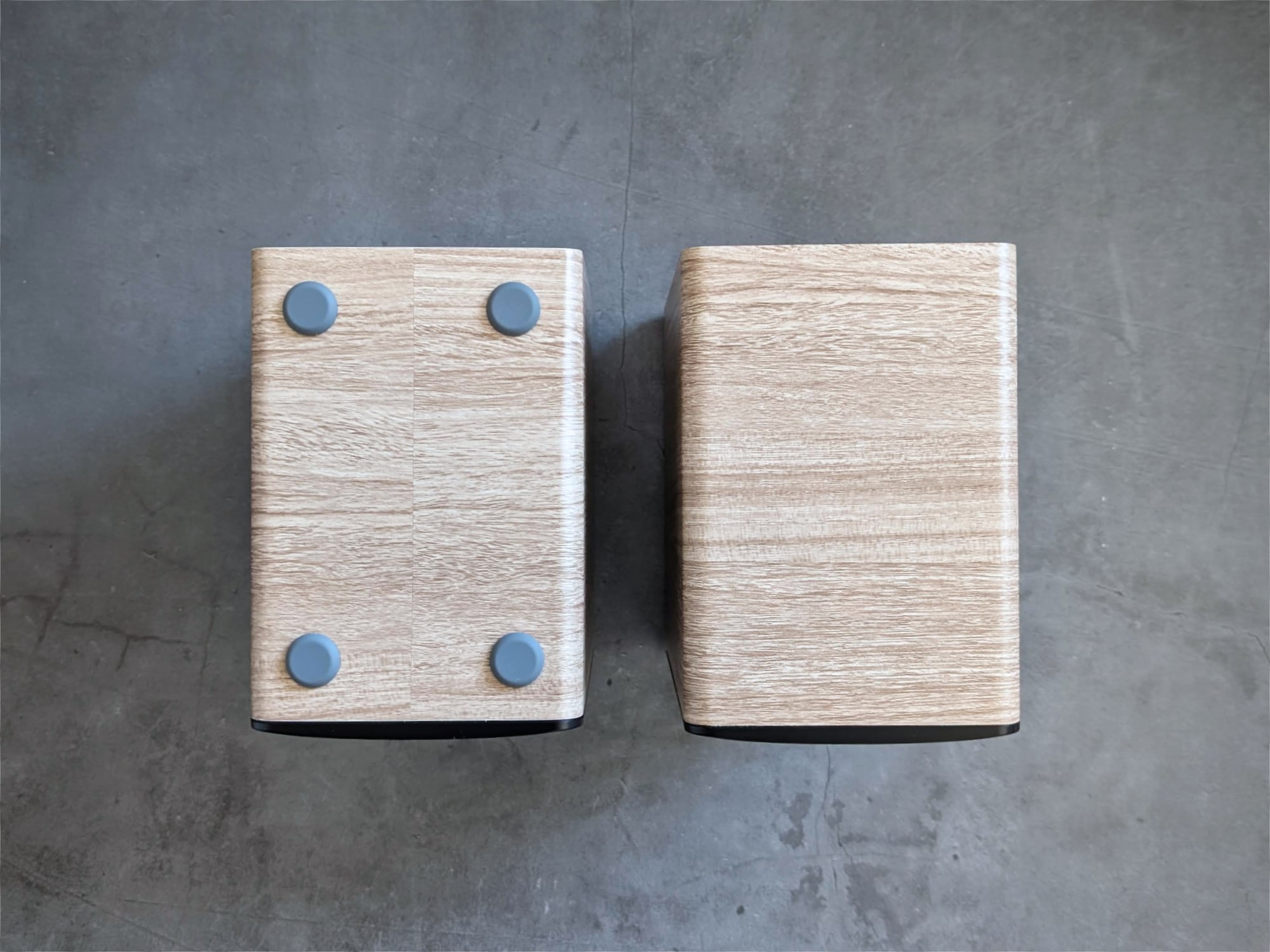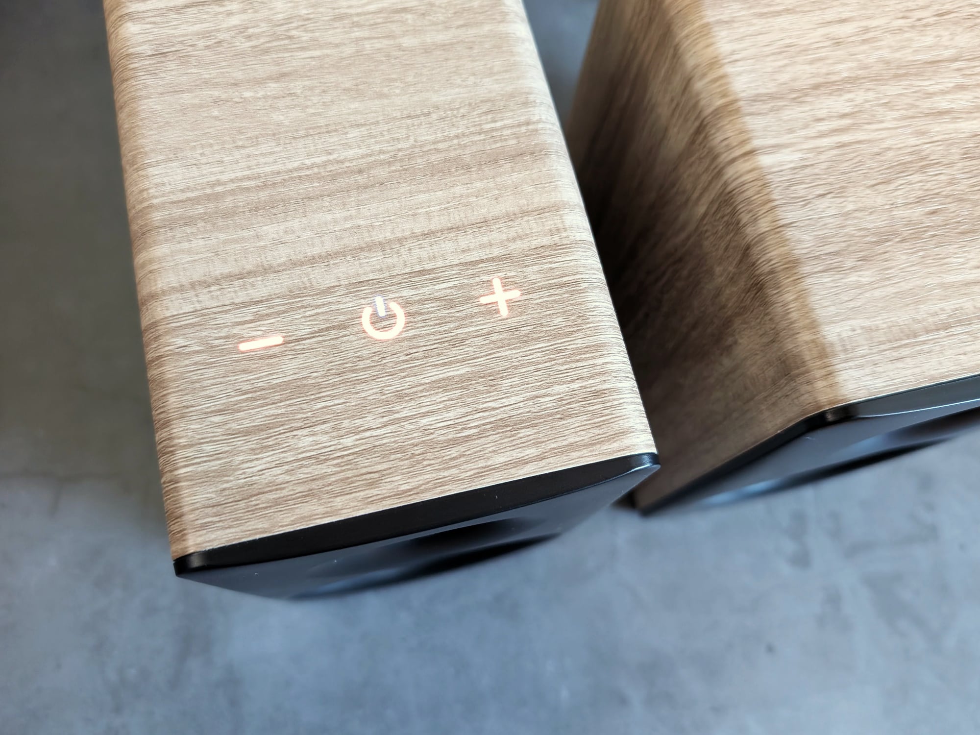 Die anderen, bei unserer Farbvariante eichenfarbenen Seiten, sind einfarbig. Auf der Oberseite des Aktivlautsprechers befinden sich drei beleuchtete Touch-Tasten für die Bedienung der Lautsprecher. Auf der Unterseite der Lautsprecher befinden sich jeweils vier Gummifüße.