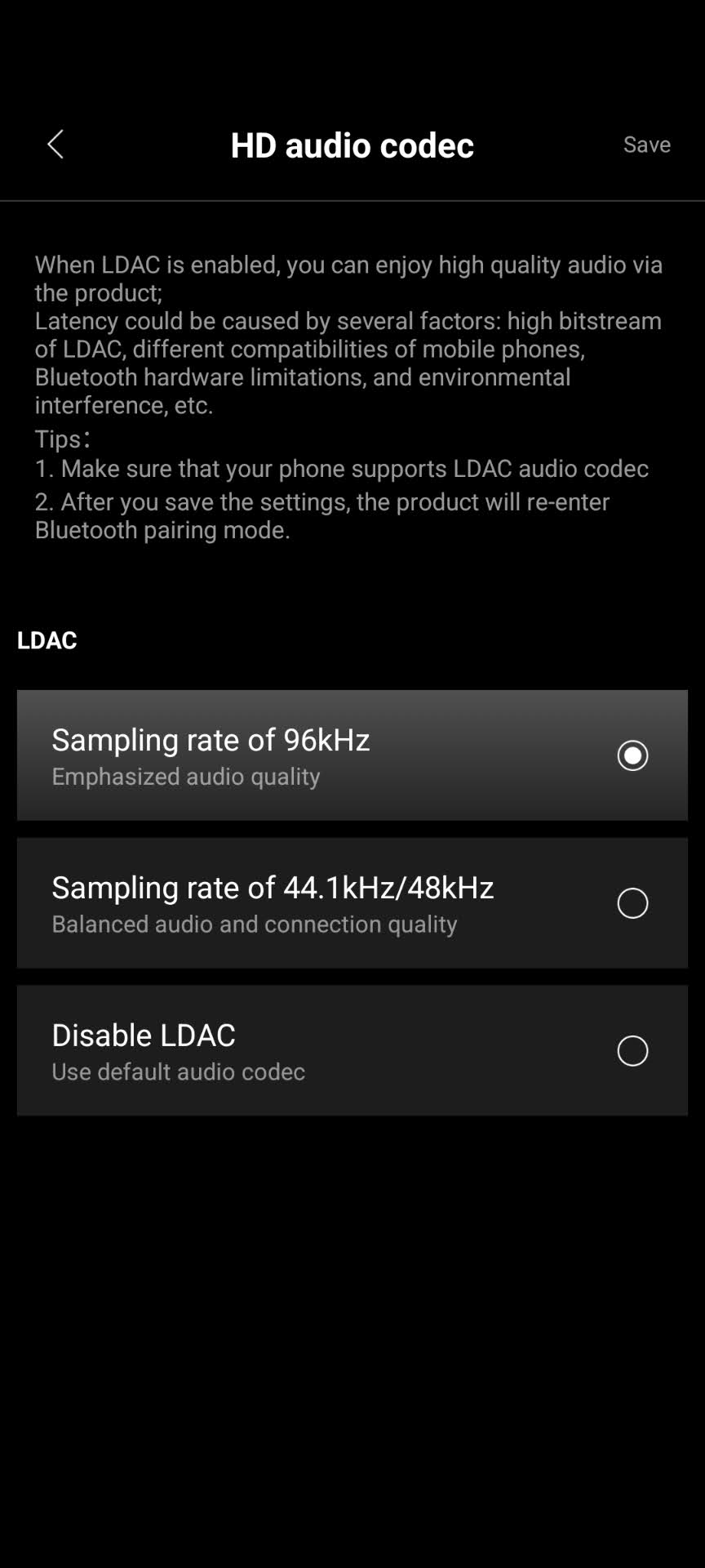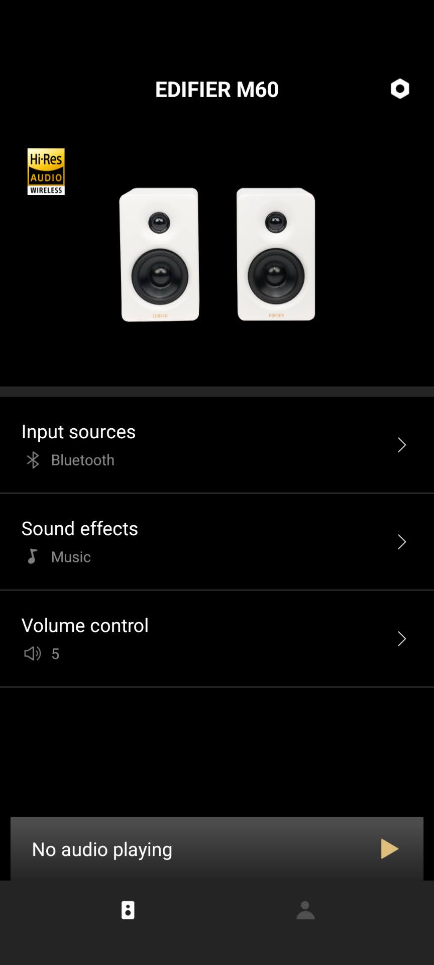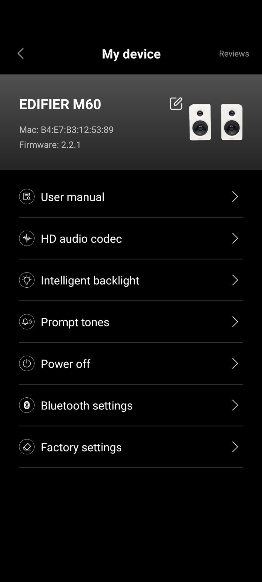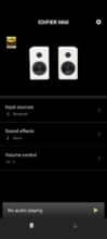 Für Smartphones steht die Edifier ConneX-App in englischer Sprache zur Verfügung. Die App zeigt die gekoppelten Edifier-Geräte an und ermöglicht weitere Einstellungen. Auf der Startseite der App kann man die Quelle, die Soundeffekte und die Lautstärke anpassen. In den weiteren Einstellungen kann man unter anderem den Codec und die Beleuchtung und Empfindlichkeit der Touch-Tasten anpassen.