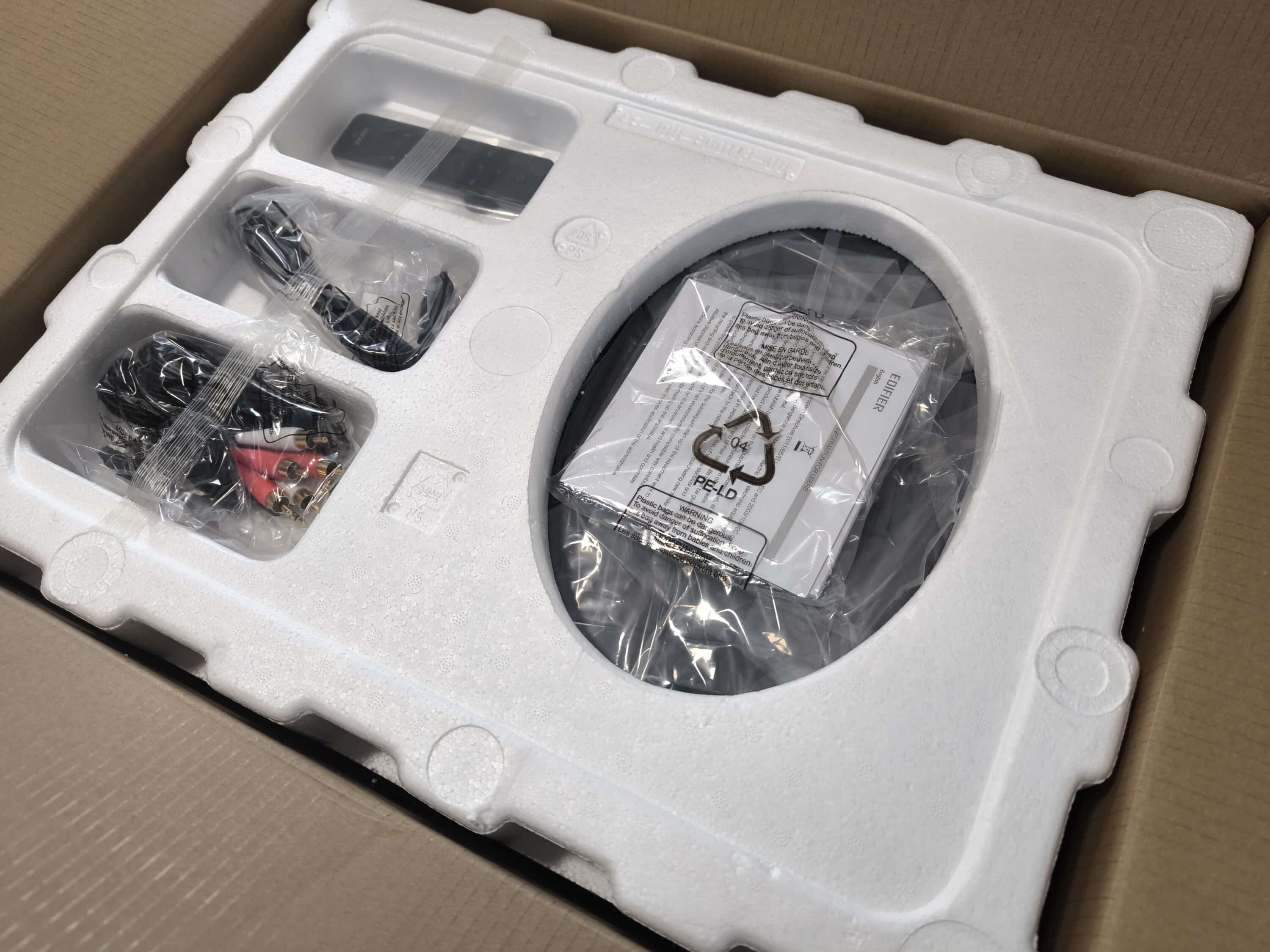 Zum Lieferumfang gehört neben dem 2.1-Soundsystem, bestehend aus Aktiv- und Passiv-Lautsprechern samt Subwoofer, ebenfalls eine Fernbedienung. Dazu kommt ein Satz von vier Kabeln. So befinden sich ein Netzkabel, ein optisches Toslink-Kabel, ein Cinch-Audiokabel und ein 3,5-mm-Cinch-Kabel in der Box. Die Bedienungsanleitung rundet das Gesamtpaket ab.