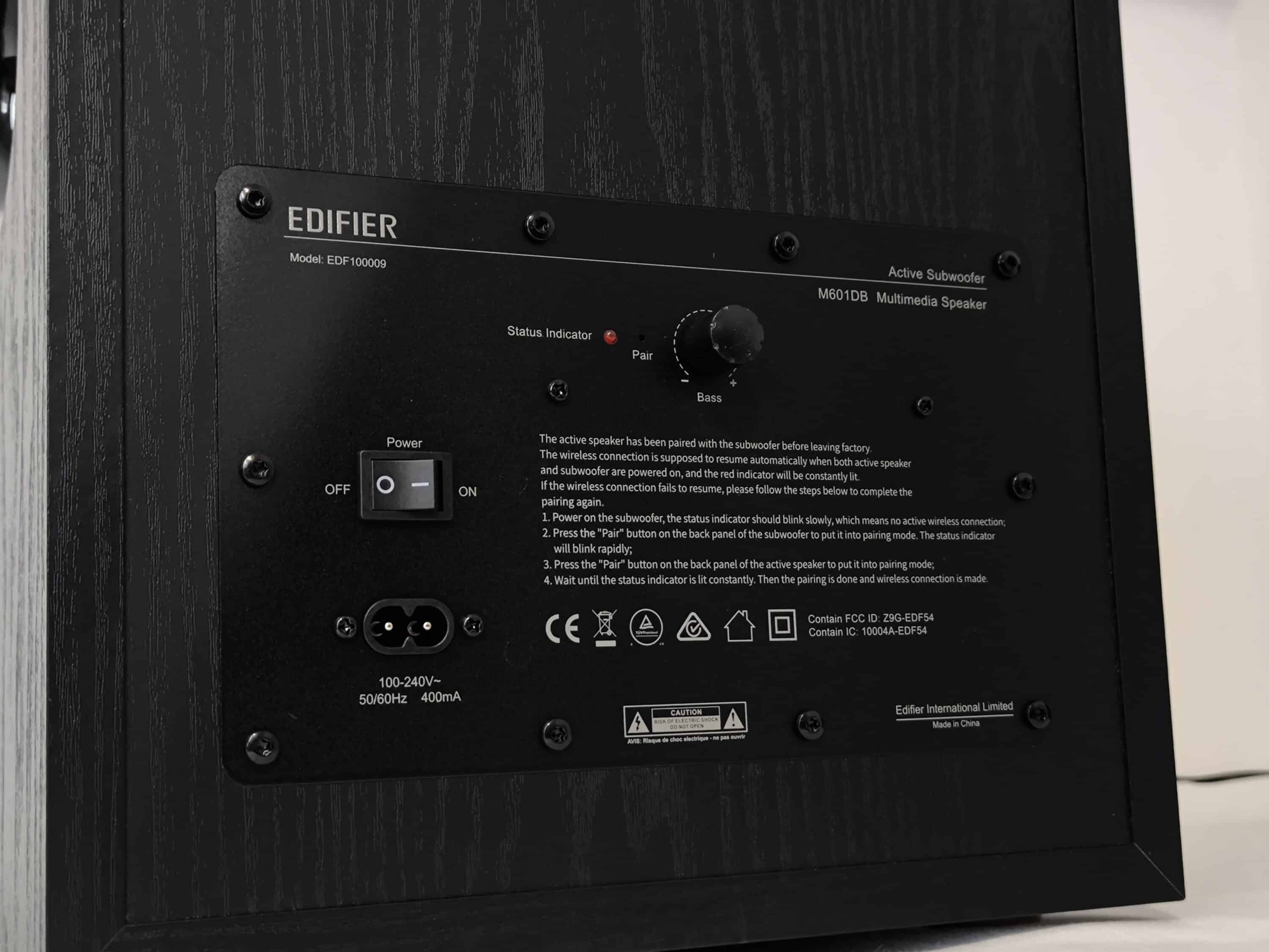 Die Anschlüsse befinden sich allesamt auf der Rückseite. Dabei hat der passive Lautsprecher keine gesonderten Anschlüsse, sondern ausschließlich das Verbindungskabel zum aktiven Lautsprecher. Letzterer verfügt über ein fest integriertes Netzkabel und einen separaten Ein-/Ausschalter. Insgesamt werden für den Edifier M601DB also zwei Steckdosen benötigt, eine für die Lautsprecher und eine für den Subwoofer. Zusätzlich befinden sich auf der Seite des Aktiv-Lautsprechers die Audio-Eingänge für AUX, Koaxial, Line-In und Optical. Die Bedienung des Soundsystems erfolgt u.a. über drei Taster, die sich auf der Oberseite des Satelliten-Lautsprechers befinden.