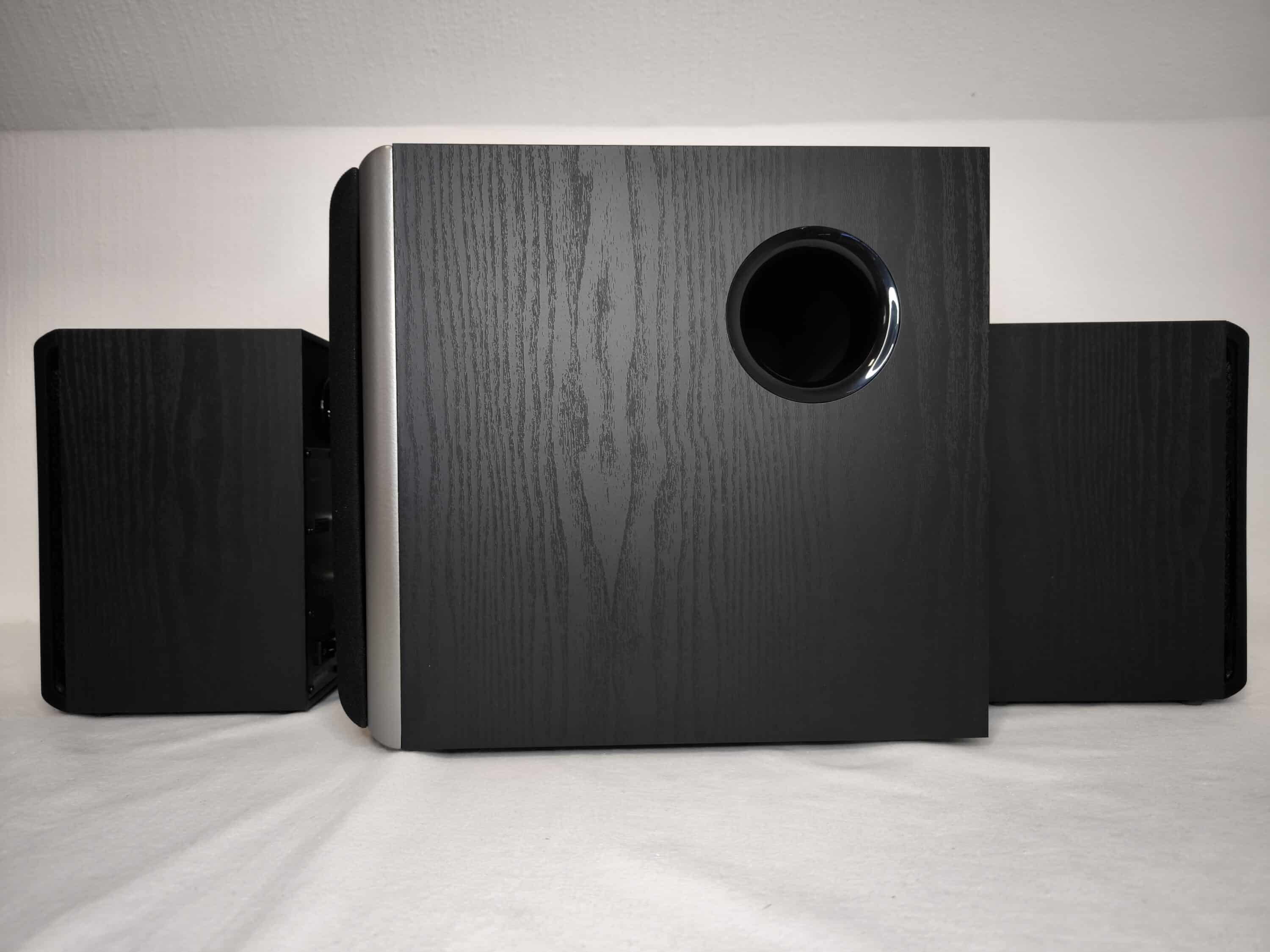 Zusammenfassend lässt sich sagen, dass das 2.1-Soundsystem eine Präferenz für Filme zeigt, während es bei Musik und Gaming an Präzision mangelt. Dies macht sich vor allem bei echten Stimmen oder Instrumenten bemerkbar, da der Crossover-Bereich zwischen Subwoofer und Lautsprechern sehr groß ausfällt. Wer einen neutralen Klang bevorzugt, muss also manuell nachbessern. Das geht per Software sowie durch Neigen der Satelliten nach oben, wodurch die Höhen weniger dumpf klingen.