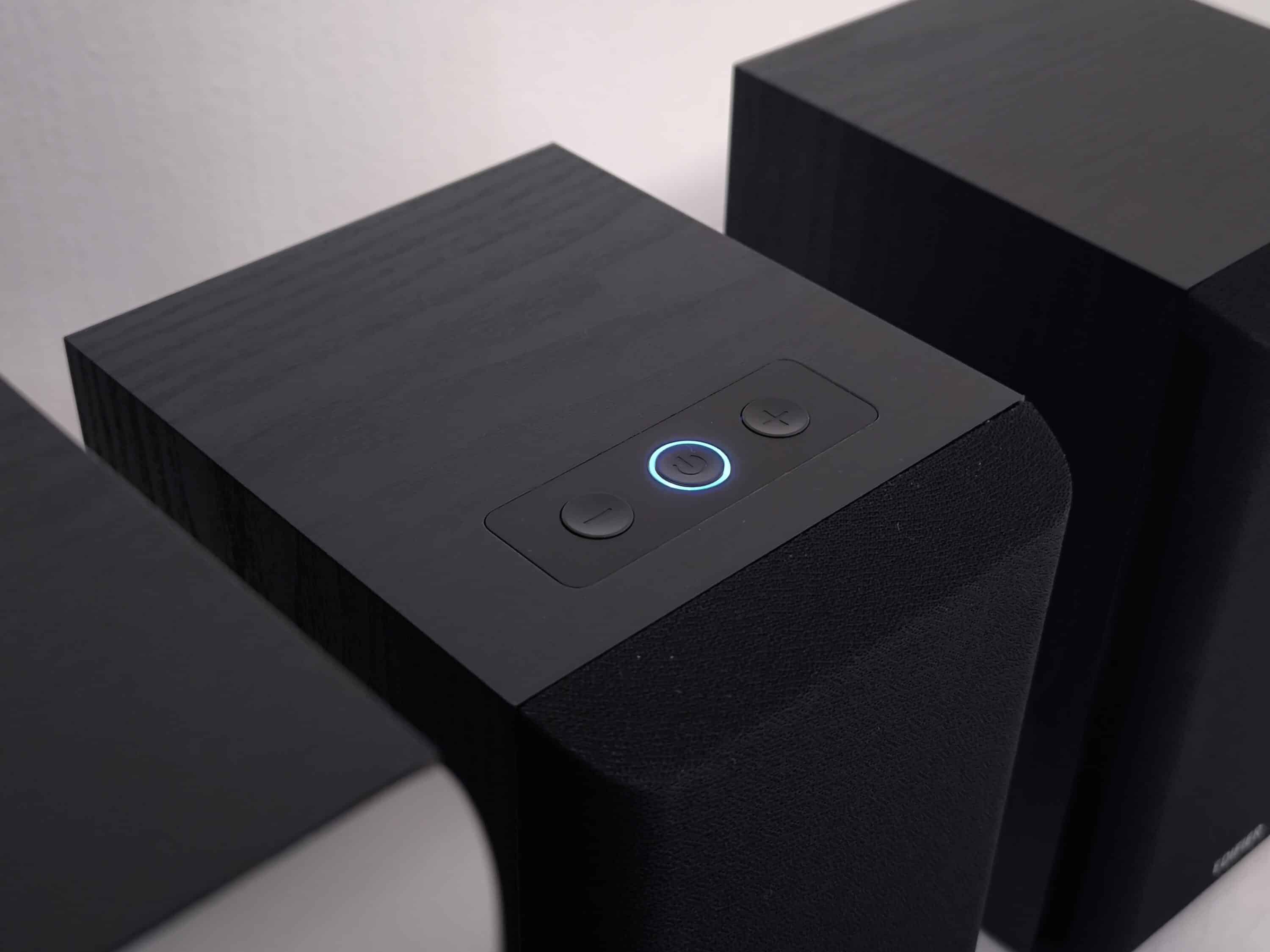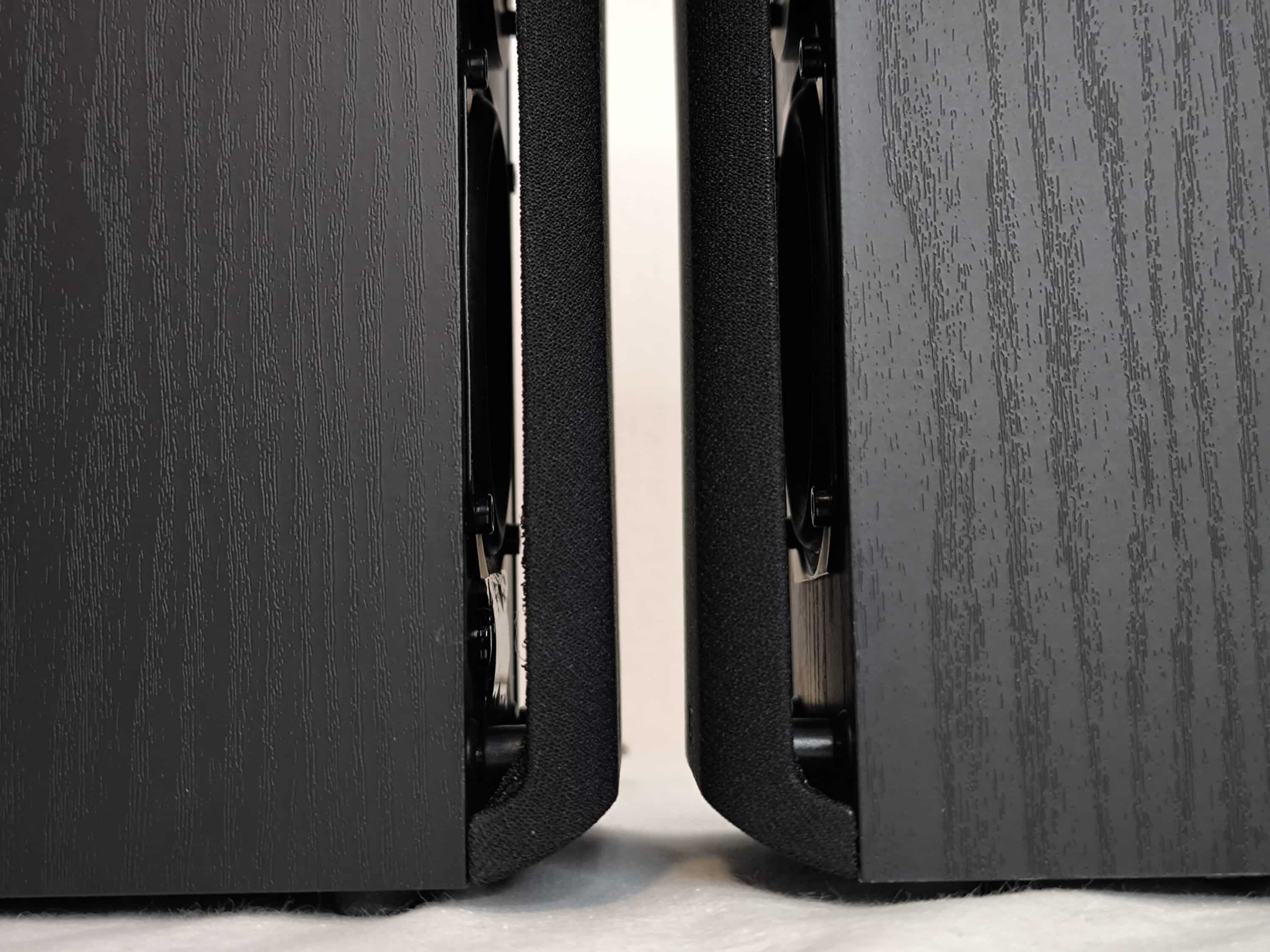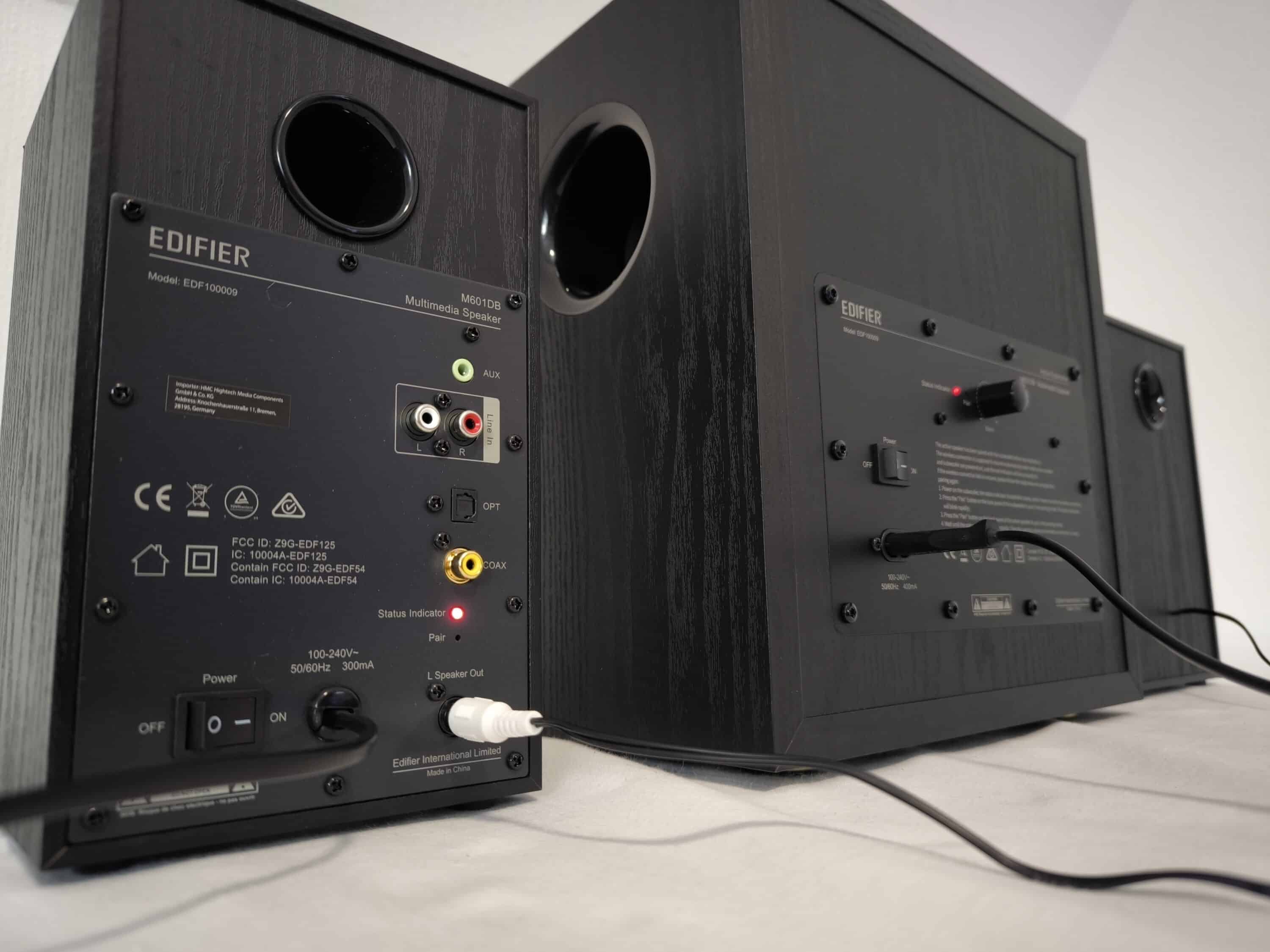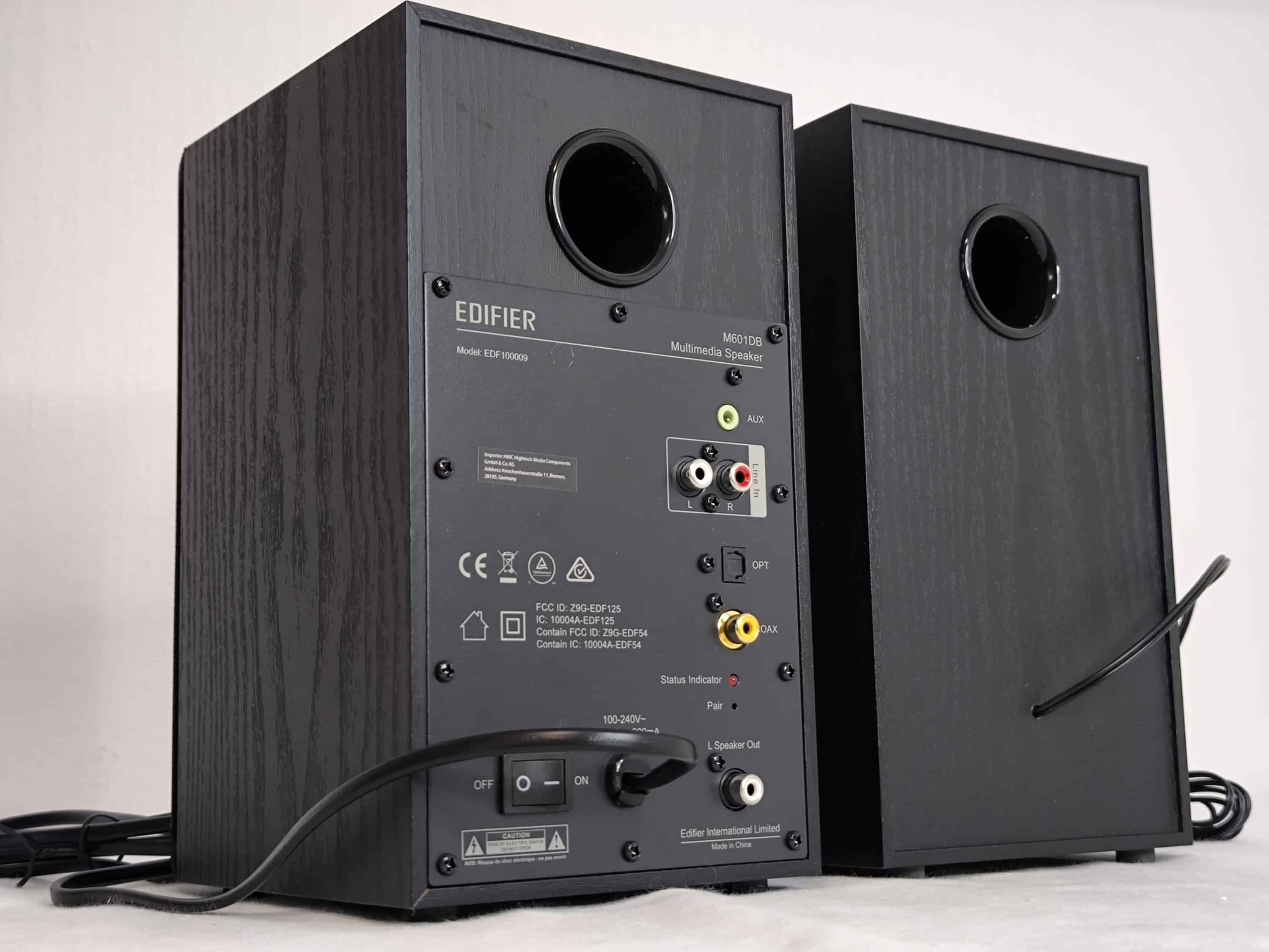 Das Edifier M601DB präsentiert sich im klassischen Design. Dabei setzen die beiden Satelliten-Lautsprecher auf eine mattschwarze Oberfläche mit feiner Holzstruktur. Das verleiht den Lautsprechern einen unvergänglichen Look und hat den Vorteil, dass sie nicht anfällig für Fingerabdrücke sind. Gleiches gilt für den acht Zoll großen Subwoofer, welcher ebenfalls mit einem Vollholzgehäuse und der besagten dunklen Holzoptik daherkommt. Die Materialwahl hat aber nicht nur optische Gründe: Sie soll Resonanzen minimieren und damit den Klang verbessern. Im Gegensatz dazu sind die Membranen auf der Vorderseite der Lautsprecher mit schwarzem Stoff überzogen. Hier ist zudem der schlichte Edifier-Schriftzug im unteren Bereich der Lautsprecherbespannung eingeprägt.