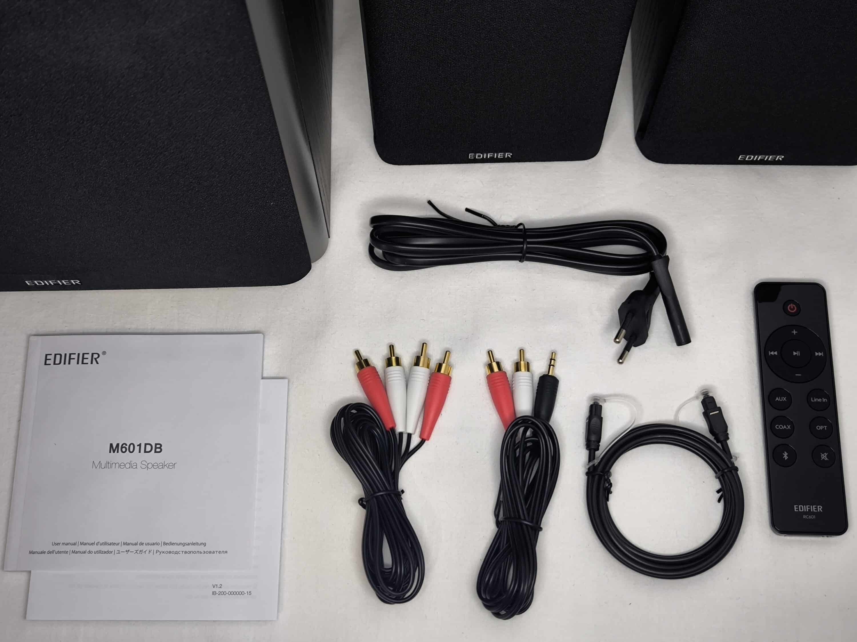 In Sachen Verarbeitung gibt sich Edifier keine Blöße und überzeugt auf hohem Standard. Dennoch ist das Gesamtbild nicht ganz auf dem Niveau des Edifier S880DB MKII, der allerdings auch in einer anderen Preisklasse angesiedelt ist. Nichtsdestotrotz offenbaren sich uns im Test präzise Spaltmaße sowie die robuste Bauweise der Satelliten samt Subwoofer, was sich in Langlebigkeit und Stabilität niederschlägt. Das wird auch beim Blick auf die Waage bestätigt, wo das Edifier M601DB stolze 11,5 kg zur Schau stellt. Rutschfeste Füßchen an jedem Element sorgen zudem für einen sicheren Stand. Die Fernbedienung der Audioanlage erscheint dagegen vergleichsweise billig.
