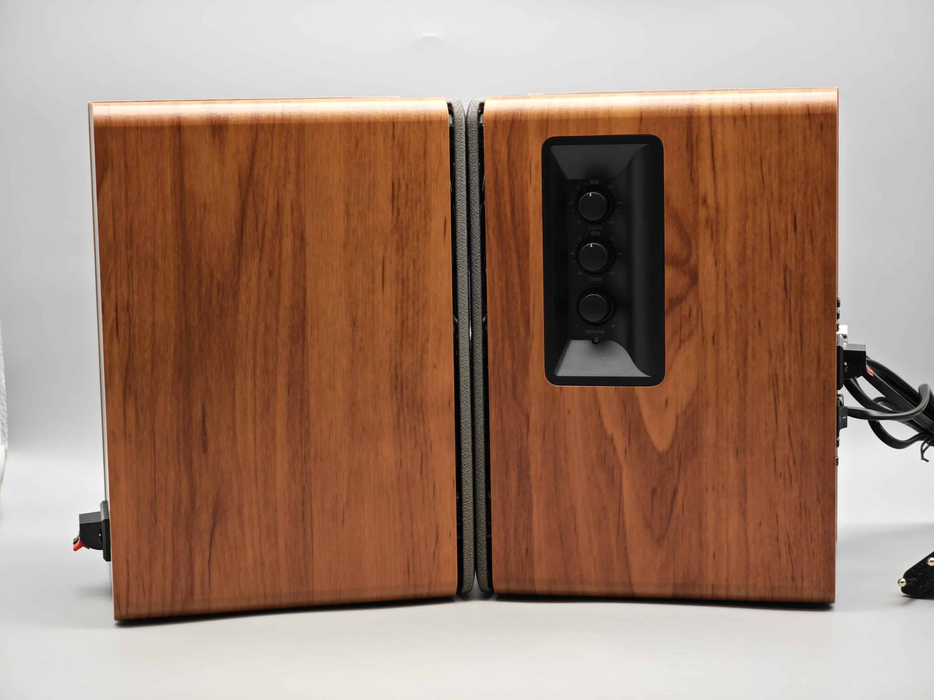 Zum Design und der Verarbeitung der 2.0-Regallautsprecher von Edifier gibt es nicht viel zu sagen. Diese kommen herstellertypisch sehr hochwertig daher, sehen hervorragend aus und sind tadellos verarbeitet. Die Lautsprecher setzen auf eine schicke Holzoptik und verfügen über drei Drehregler an der rechten Seite des rechten Speakers, mit denen Bass, Höhen und Lautstärke angepasst werden können.