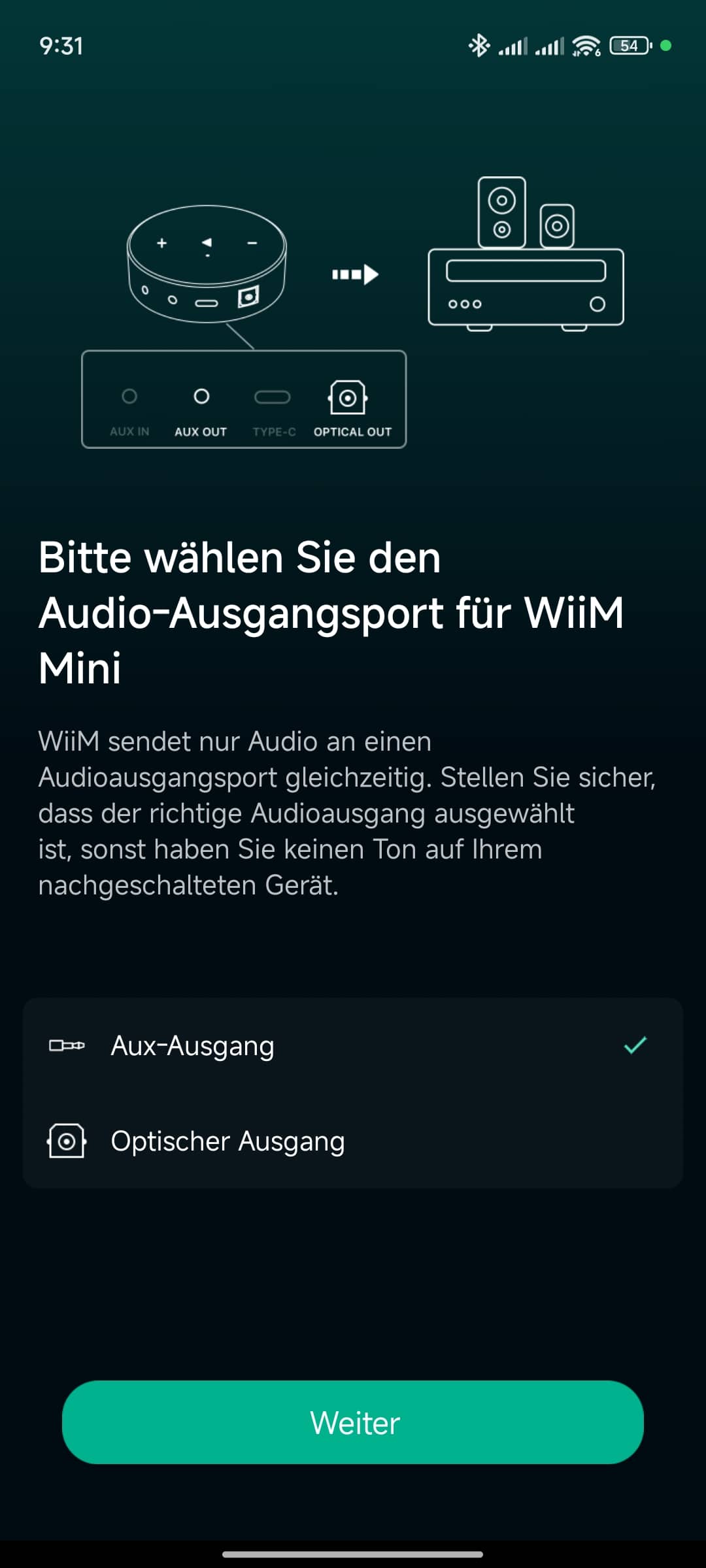 Ist das erledigt, geht es in der WiiM Home-App weiter, die kostenlos für Android und iOS angeboten wird. Diese erkennt den Mini nach dem Starten sofort und beginnt, ganz ohne Registrierungszwang, mit der Einrichtung.