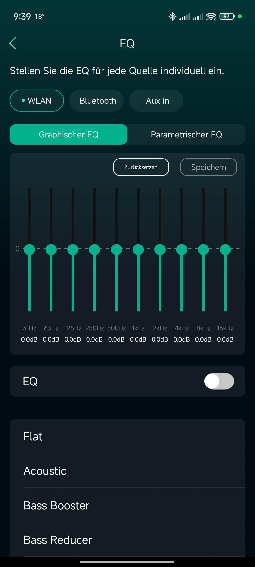 Zumal ihr mithilfe des detaillierten Equalizers samt zahlreicher Presets merklichen Einfluss auf die Akustik nehmen und beispielsweise die Bässe mehr in den Vordergrund rücken oder die Höhen verstärken könnt. Dabei arbeitet der WiiM Mini samt Edifier R1280T derart zuverlässig, dass selbst das Tiefbasssegment bei hohen lautstärken angenehm detailreich aufspielt und die Höhen zu keinerlei Überspitzung neigen.