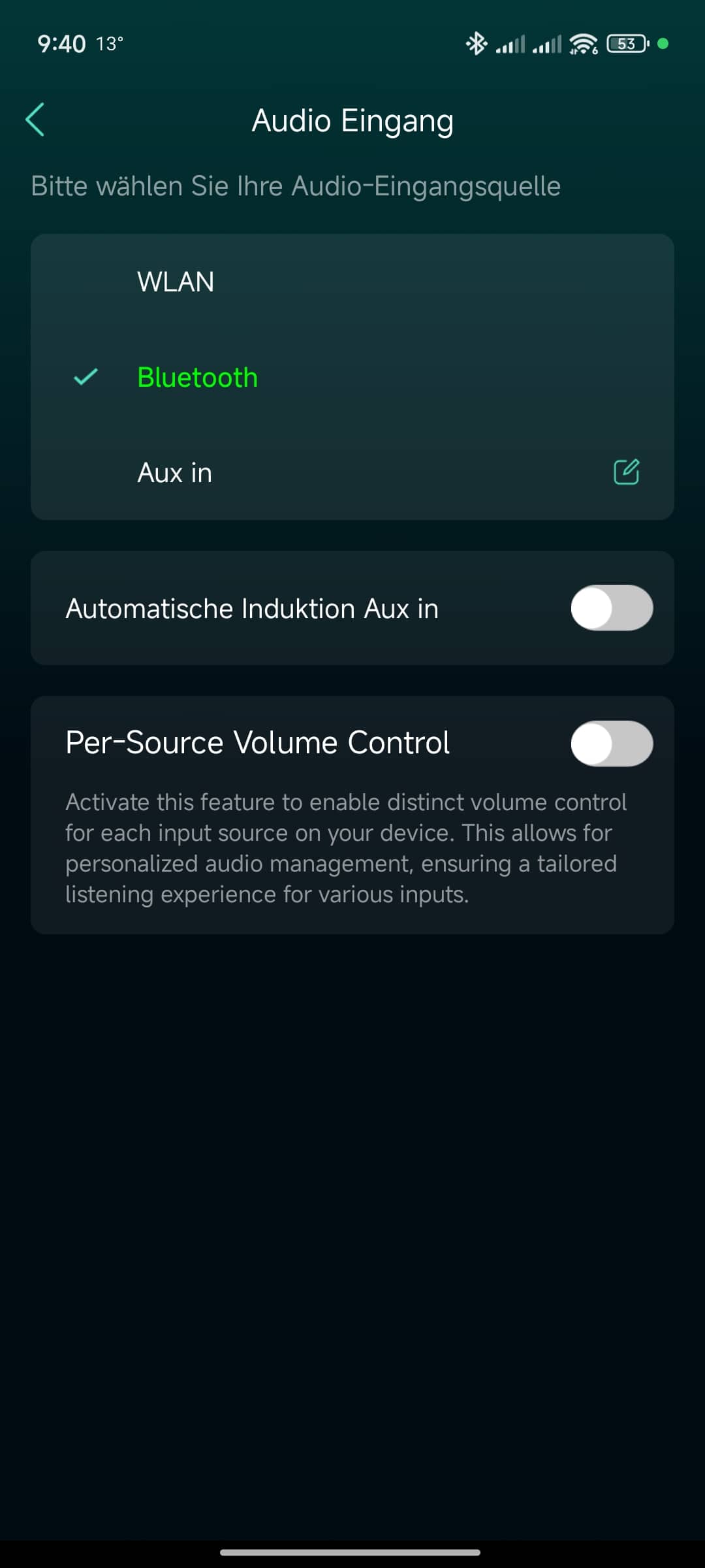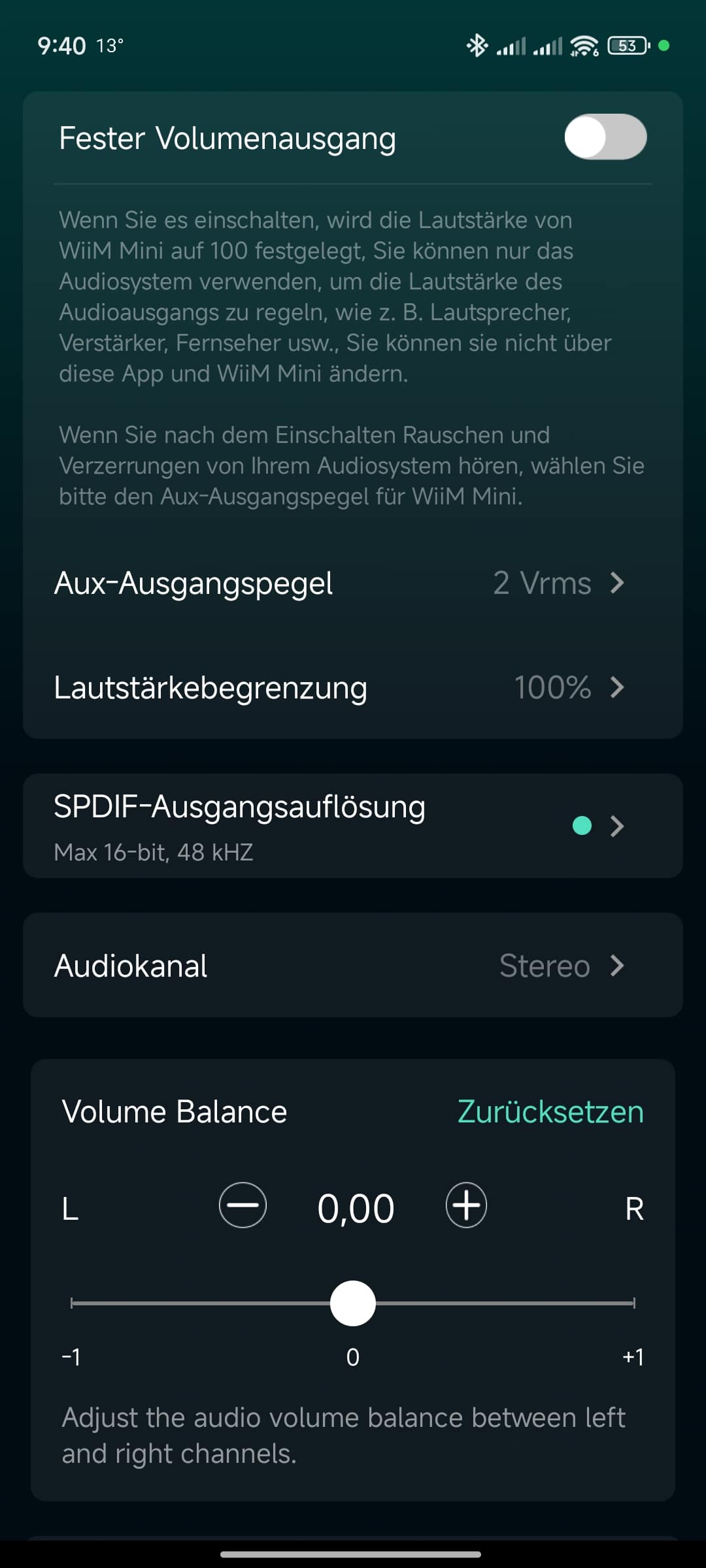 Während die Bedienung der Lautsprecher zumindest rudimentär über die beiliegende Fernbedienung, sowie die drei Regler an der Seite möglich ist, erweist sich diese mithilfe der App des WiiM Mini als deutlich komfortabler. Hier lassen sich sämtliche Parameter des Verbundes aus Zuspieler und Hi-Res-Audio-Streamer regulieren.