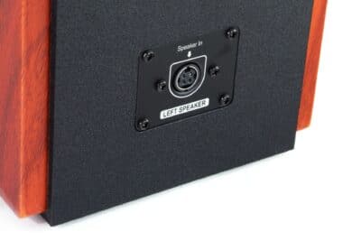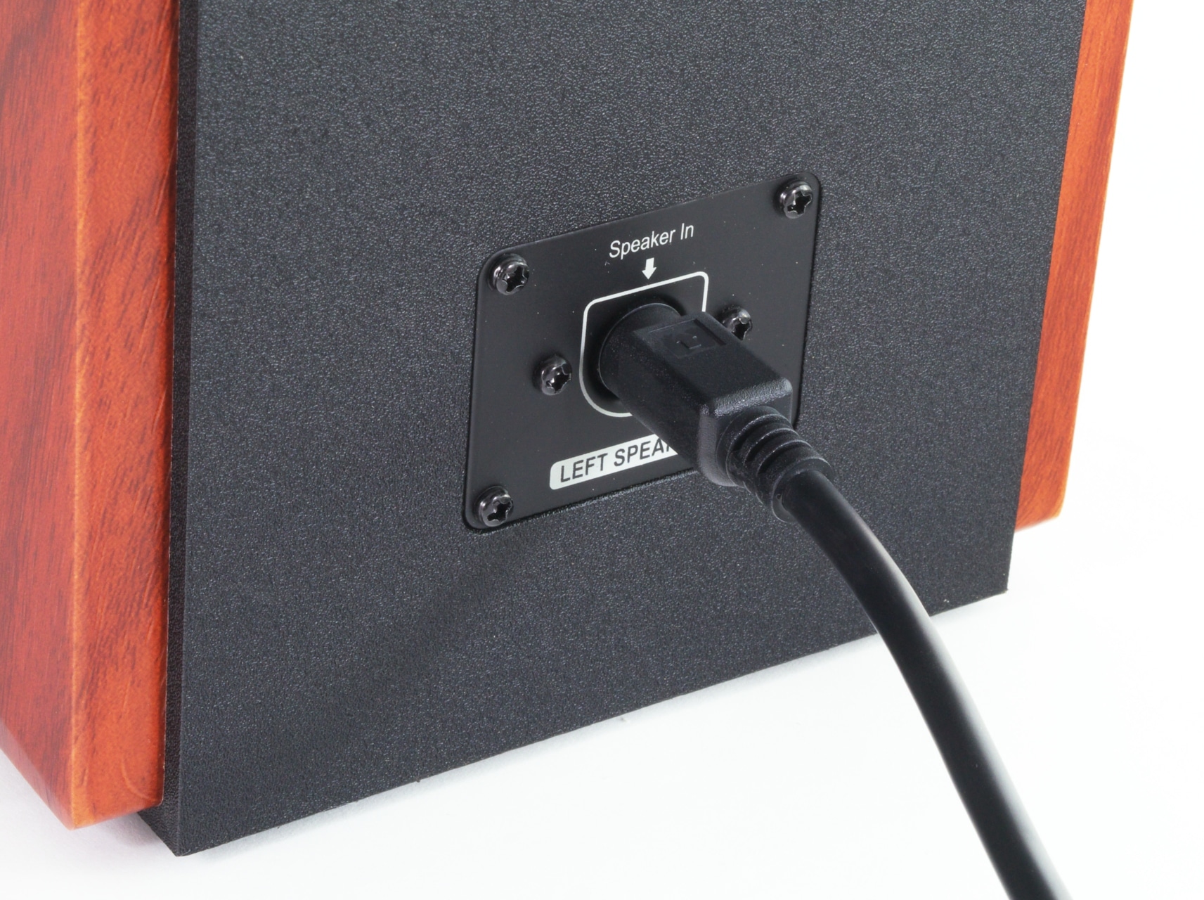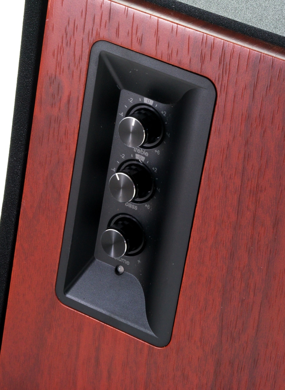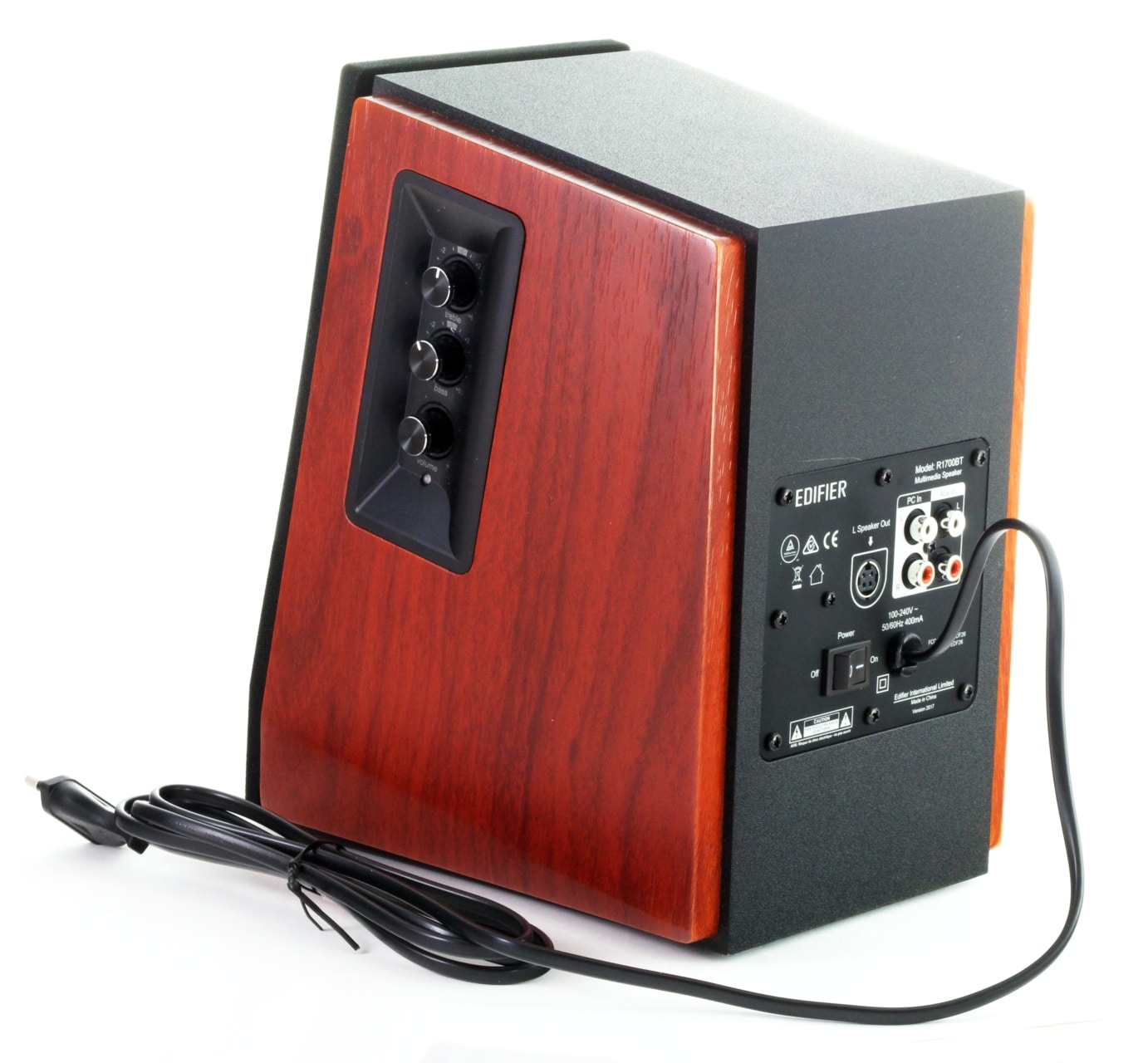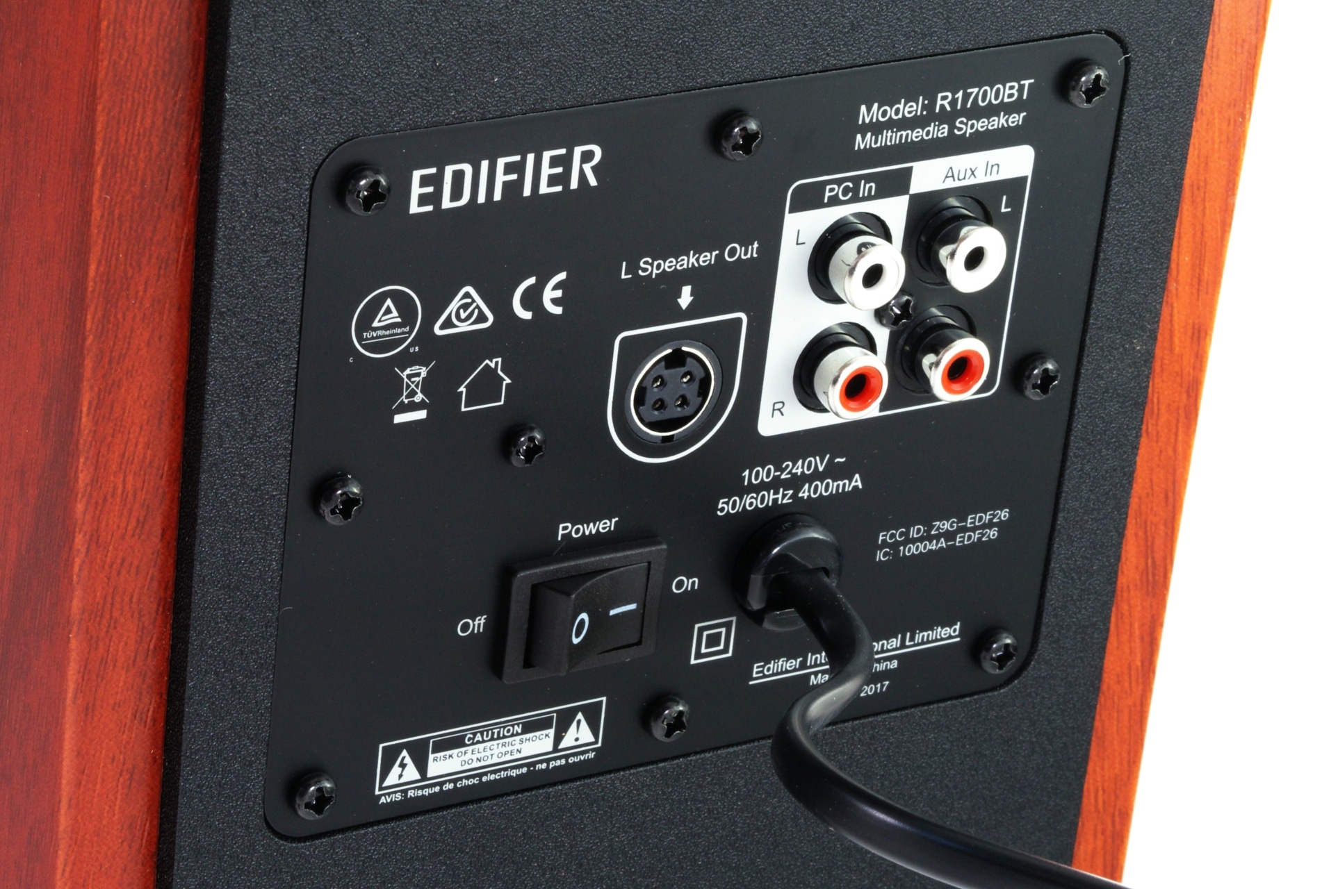 Die Anbindung der Lautsprecher erfolgt über die rechte Lautsprecherbox, an deren rechter Seite drei Bedienelemente (Höhen, Bass, Lautstärke) eingelassen sind. Außerdem gibt es an der Rückseite dieser Box das metallene Anschlusspanel, an dem der Power-Schalter, das Stromkabel und die analogen Anschlüsse untergebracht sind. Die R1700BT können per Cinch mit zwei unterschiedlichen Quellen verbunden werden, und geben das verstärkte Audiosignal durch den besagten DIN-Anschluss an die linke Lautsprecherbox weiter.