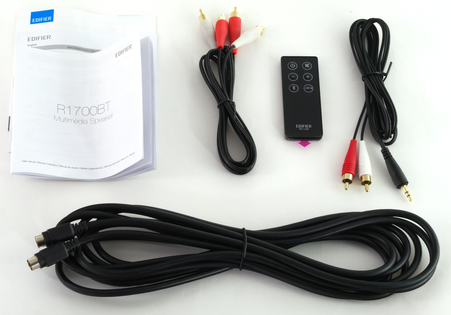 Edifier liefert die R1700BT in einem farbig bedruckten Karton, in dem sich die Lautsprecher und das Zubehör befinden. Dabei handelt es sich um eine Anleitung und ein bisschen zusätzlichen Papierkram, eine IR-Fernbedienung mit CR2025-Batterie, zwei Anschlusskabel für die Cinch-Buchsen mit einer Länge von je 1,6 m und das knapp 2,5 m lange Lautsprecherkabel, mit dem die beiden Boxen verbunden werden. Dieses wiederum verfügt beidseitig über DIN-Stecker mit vier Pins. Im Netz werden hier auch diverse Ersatz- und Verlängerungskabel angeboten, sodass man auch eine abweichende Lautsprecher-Distanz realisieren kann.