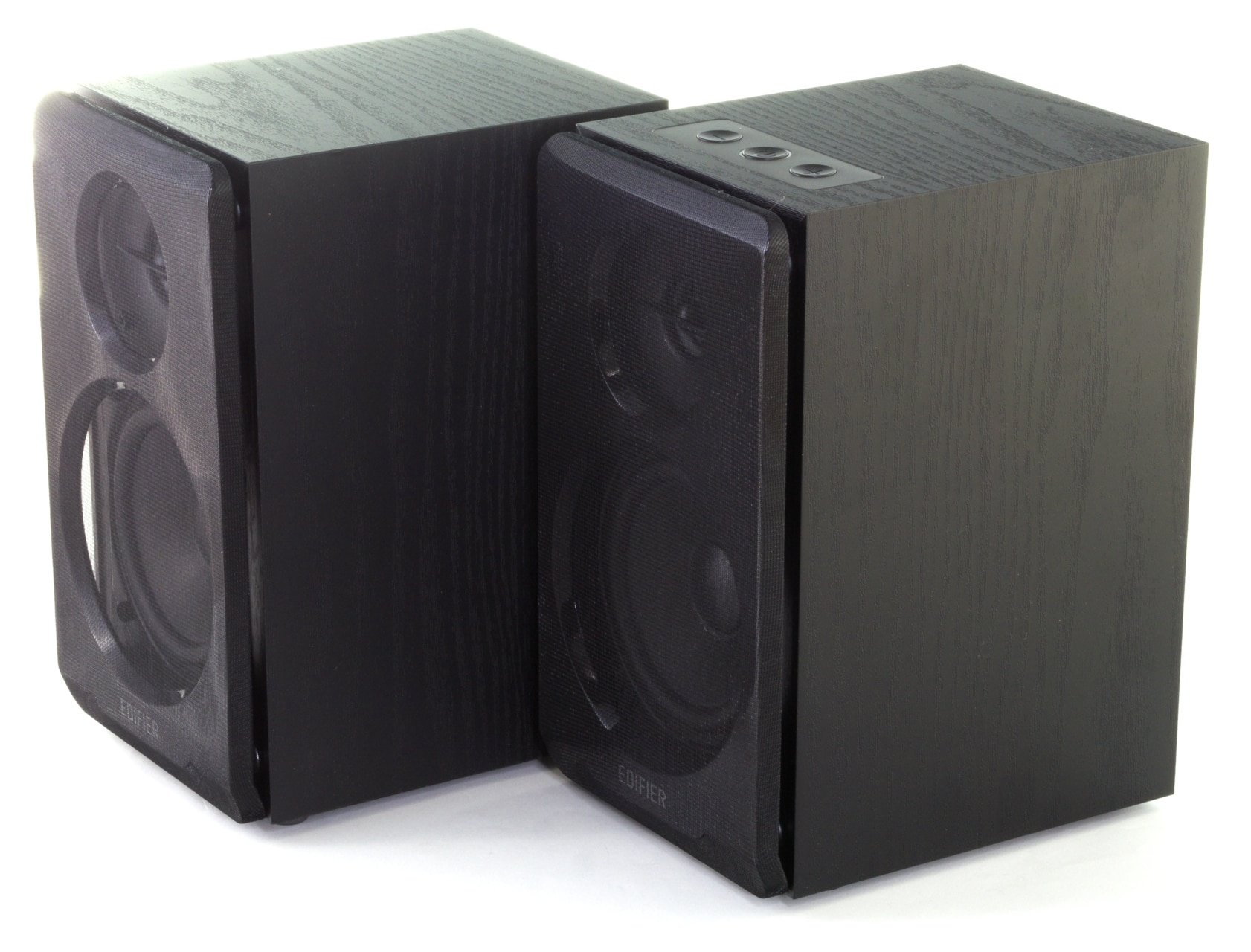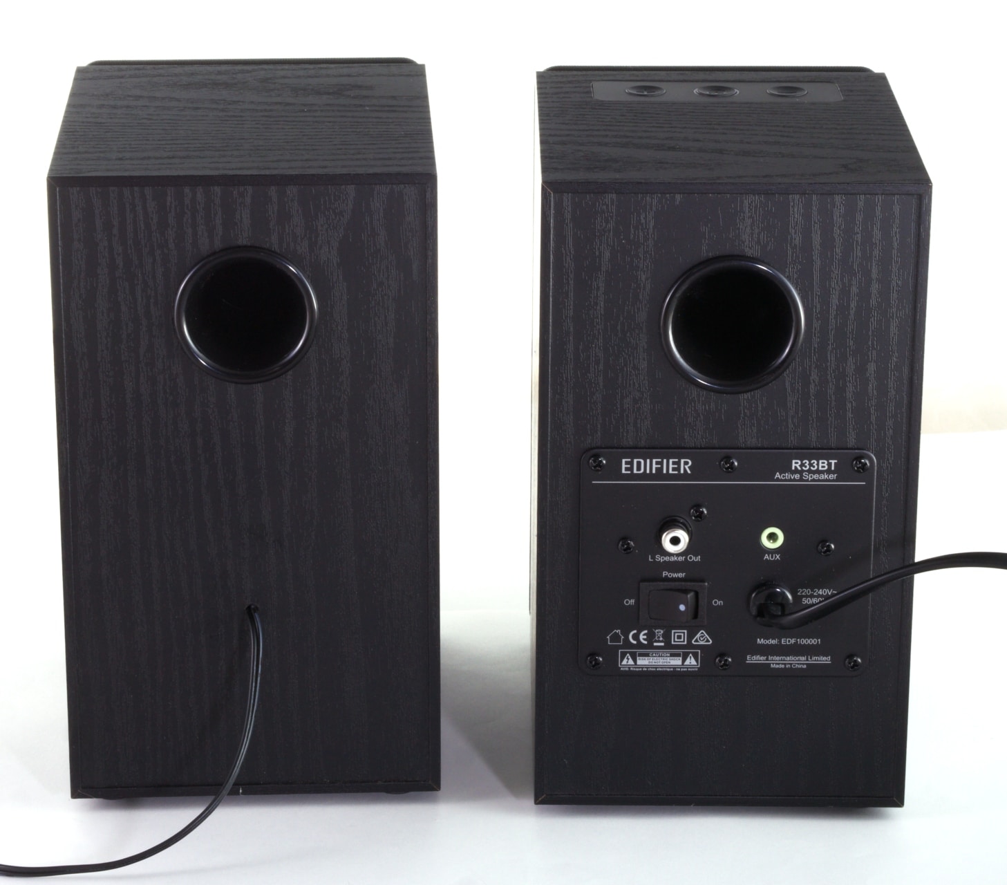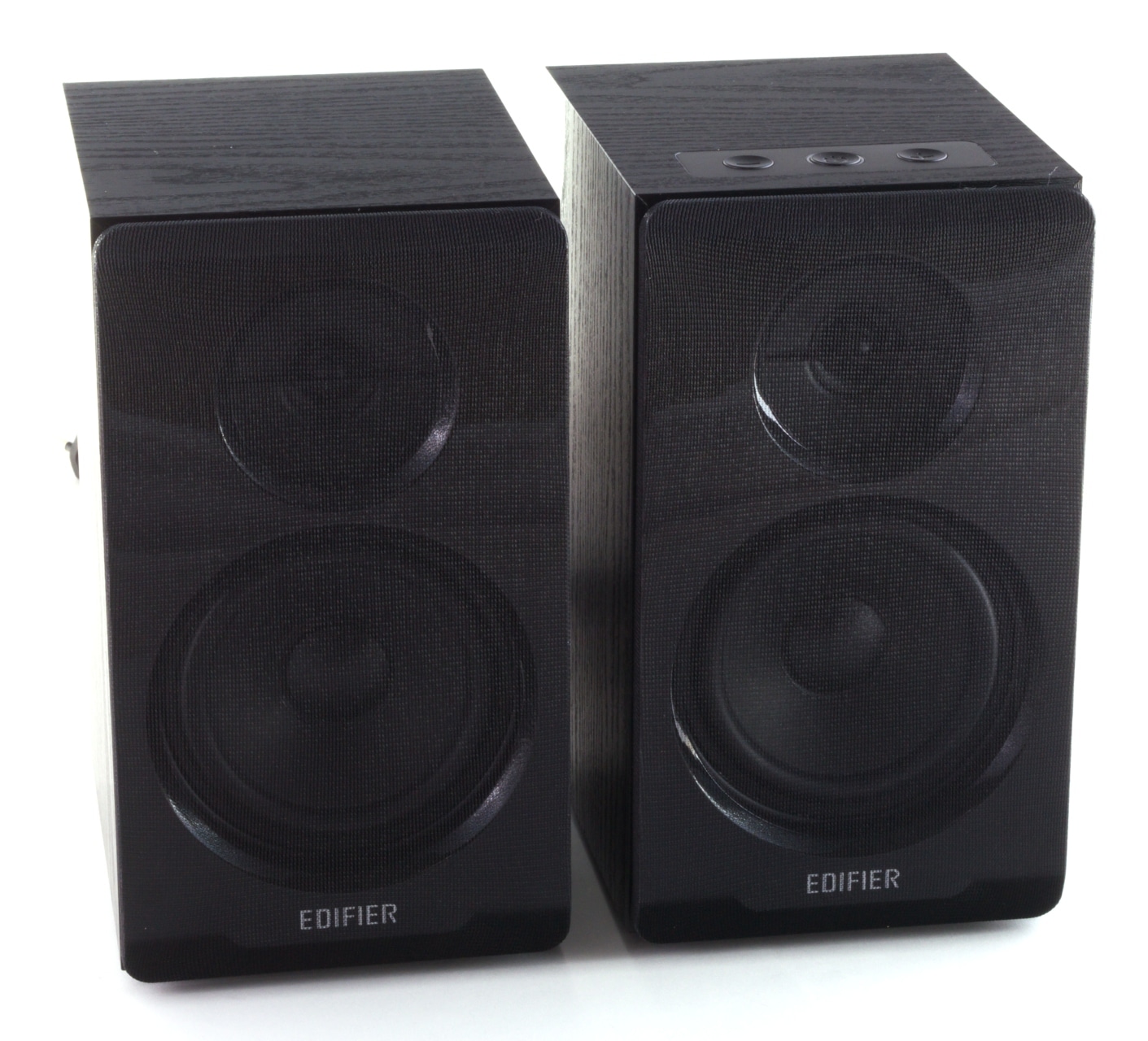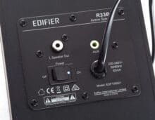 Die R33BT bestehen laut Edifier aus einem Holzkorpus aus MDF, der mit einer Beschichtung in schwarzer Holzoptik versehen ist und die beiden Chassis sowie das nach hinten gerichtete Bassreflexrohr enthält. Der linke Lautsprecher verfügt dabei lediglich noch über das fest installierte Cinch-Anschlusskabel. Im rechten Lautsprecher sind hingegen die gesamte Elektronik und damit auch die Anschlüsse an der Rückseite sowie das Bedienpanel an der Oberseite verbaut.