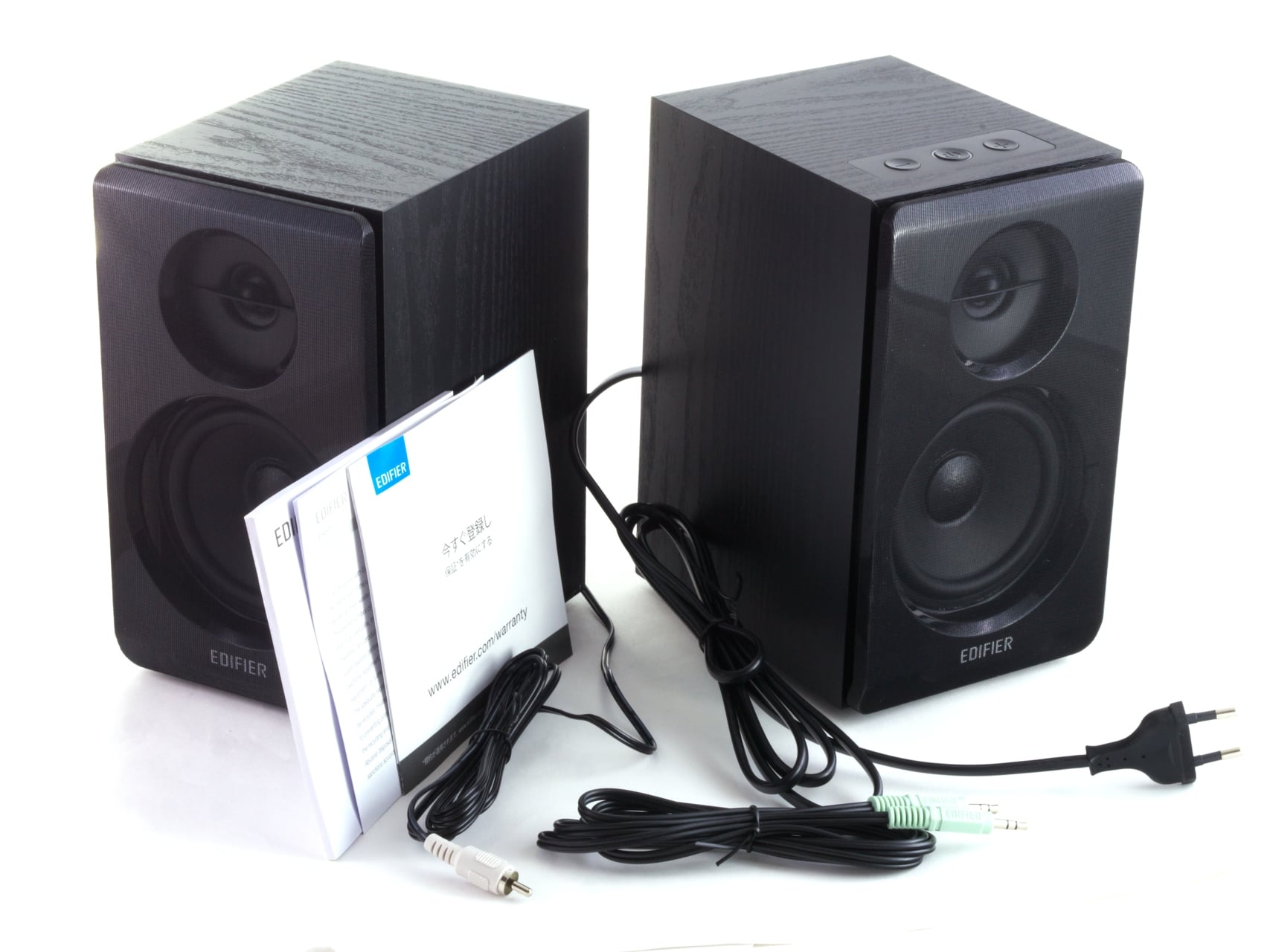 Die Edifier R33BT werden in einem schwarz bedruckten Karton geliefert. Darin befinden sich die Lautsprecher mitsamt Schaumstoffpolsterung sowie das Zubehör. Das 1,5 lange Strom- und das 2,2 lange Verbindungskabel sind dabei schon fest an den Lautsprechern angebracht. Dazu gibt es noch ein 1,6 m langes Klinken-Anschlusskabel sowie den übliche Papierkram, der unter anderem die Bedienung erklärt.