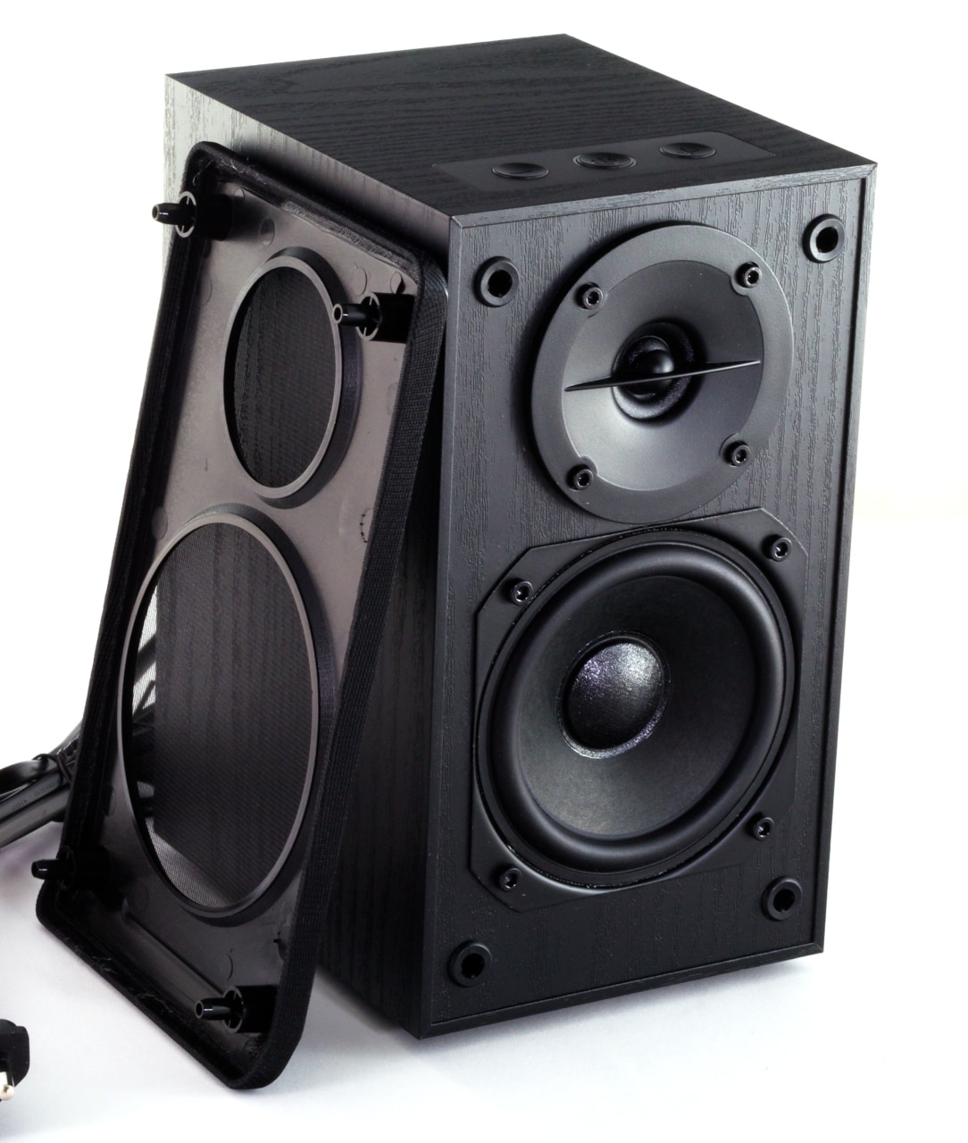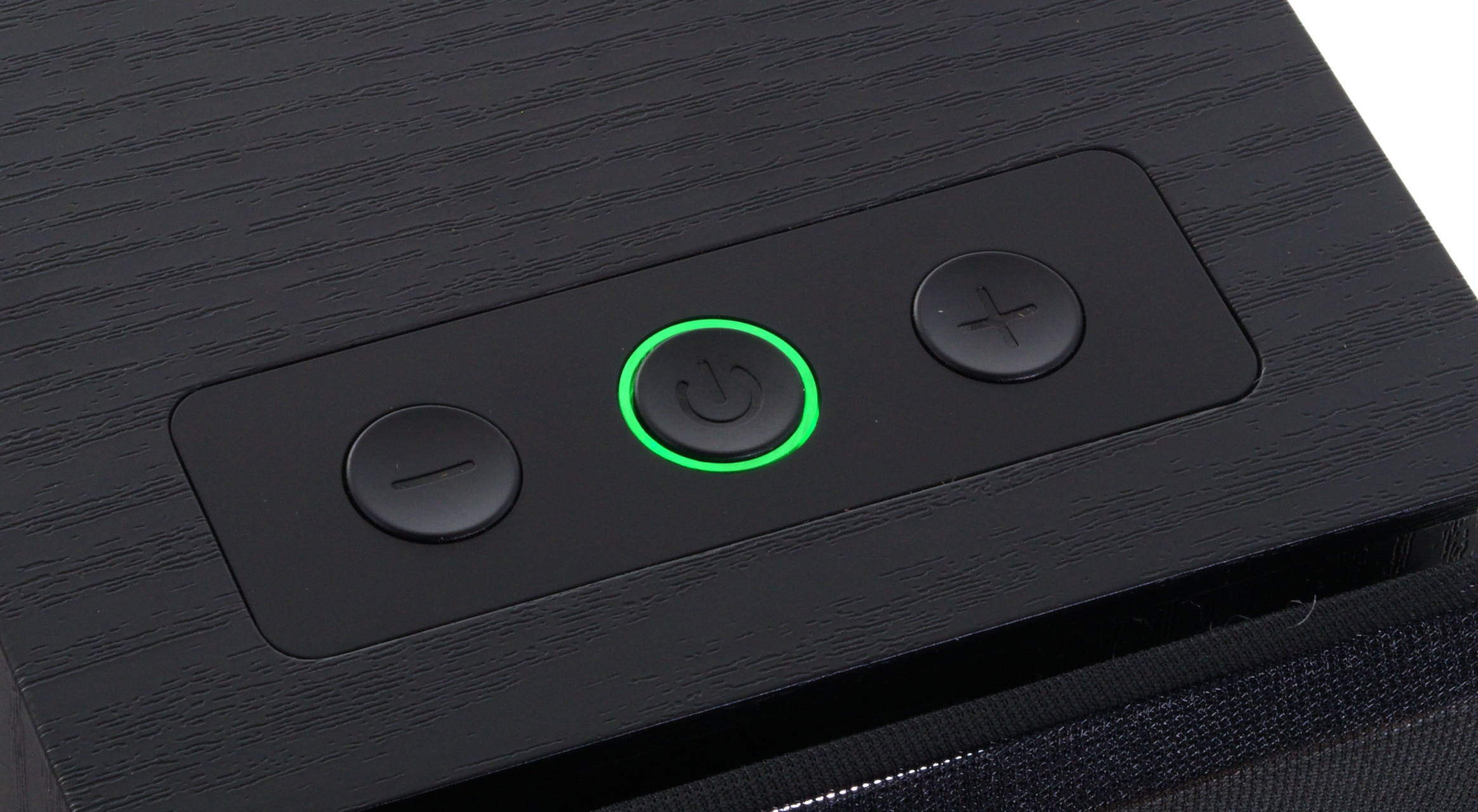 Zusätzlich befindet sich an beiden Lautsprechern vorne noch eine mit semitransparentem Stoff bezogene Abdeckblende, die sich mit einem Handgriff entfernen und damit leicht reinigen lässt. Durch den Stoff sind dabei der Hochglanz-Kunststoff der Blende sowie die beiden Lautsprecherchassis zu sehen. Unten verbaute Edifier einen 3,5“-Tiefmitteltöner, und mittig über diesem sitzt der 0,5“-Hochtöner.