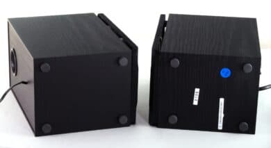 Bei einer noch größeren Entfernung müsste man eine Verlängerung für Cinch-Verbindungskabel kaufen. Ein Austausch des Kabels ist hingegen nicht möglich, denn dieses ist – wie bereits erwähnt – fest mit der der linken Lautsprecherbox verbunden. Gegenüber den oft verwendeten Lösungen mit Kabelklemmen finden wir die von Edifier gewählte Variante trotzdem besser, denn Cinch-Kabel sind einfacher zu bedienen und auch für Laien nicht abschreckend. Noch besser wäre es aber natürlich gewesen, wenn einfach die Vorteile beider Lösungen kombiniert werden, indem man einfach an beiden Boxen einen Cinch-Anschluss verbaut.