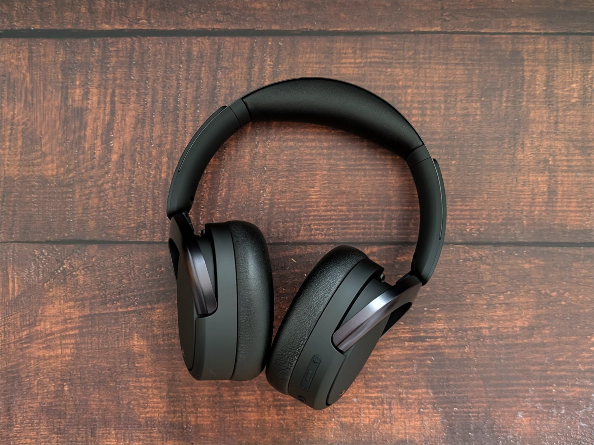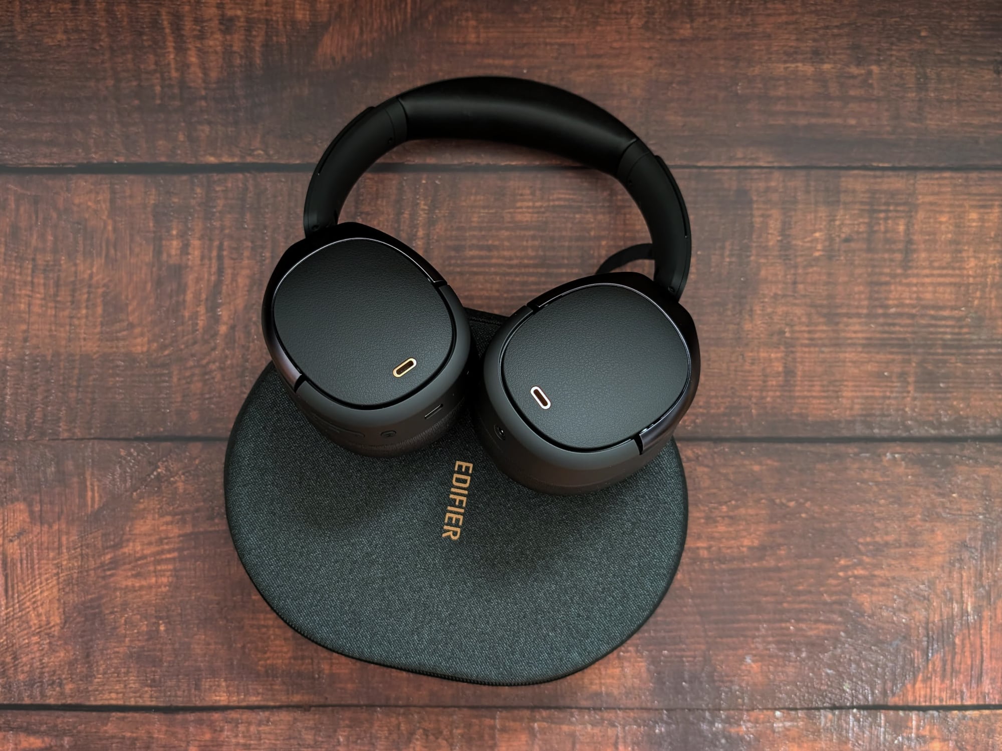 Der Edifier WH950NB ist fast vollständig schwarz. Goldene Akzente wie die beiden Edifier-Logos und die Einfassung der außenliegenden Mikrofone bilden einen Kontrast. Der Kopfbügel des Kopfhörers besteht aus Metall, die beiden Seiten sind um ca. 2,5 cm ausziehbar und mit Kunststoff abgedeckt. Der Kopfbügel ist gut gepolstert, die Polsterung ist sehr weich. Die Ohrmuscheln sind oval und bestehen aus Kunststoff. Sie können um ca. 30° in die eine und um 90° in die andere Richtung gedreht werden. Die Außenseiten besitzen eine Oberfläche in Lederoptik. Die Polsterung der Ohrmuscheln ist weich, aber nicht so weich, wie die des Kopfbügels.