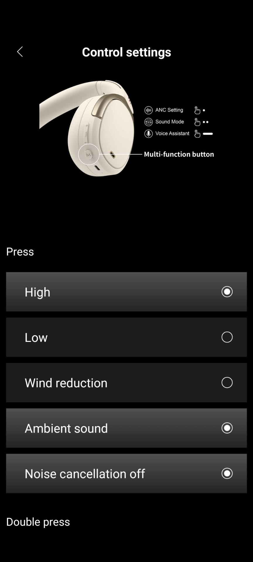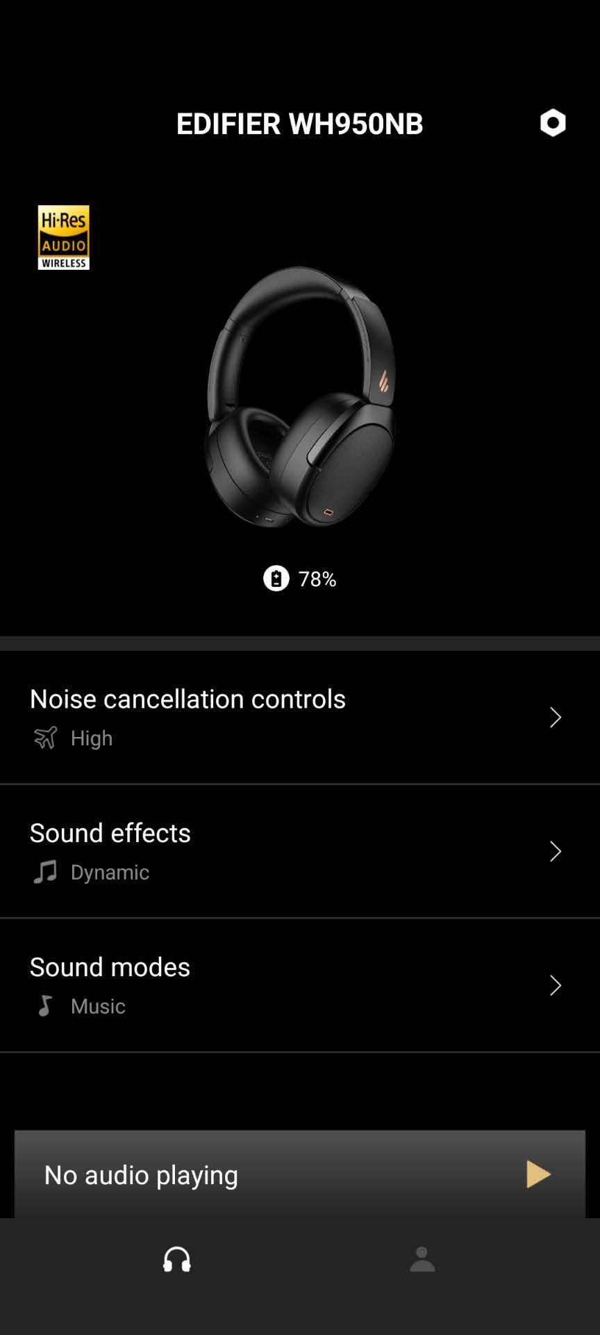 Der Edifier WH950NB wird über die beiden Bedienelemente und durch einfaches, mehrfaches oder langes Drücken der vier Tasten bedient. Die mittlere Taste dient durch langes Drücken als Ein-/Aus-Taste. Die Bedienung kann in der App angepasst werden, Touch für Gestensteuerung ist nicht vorhanden.